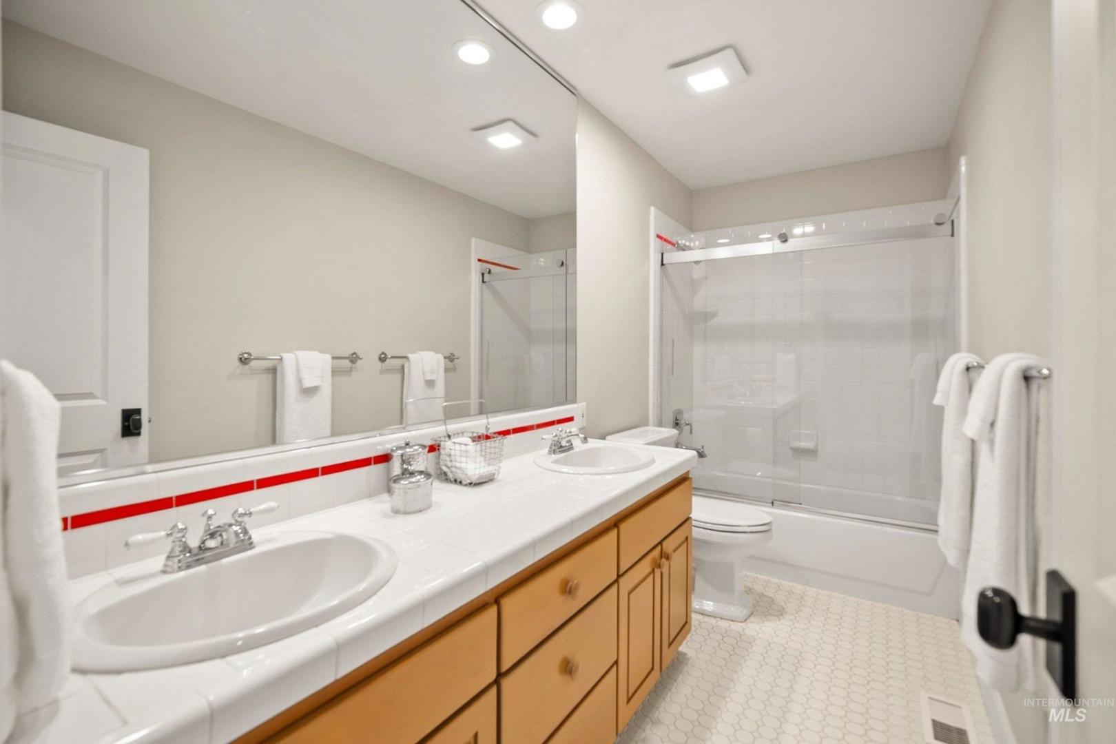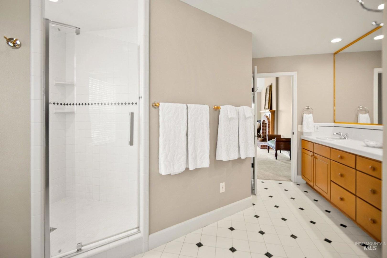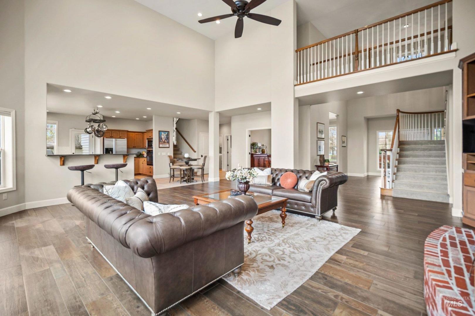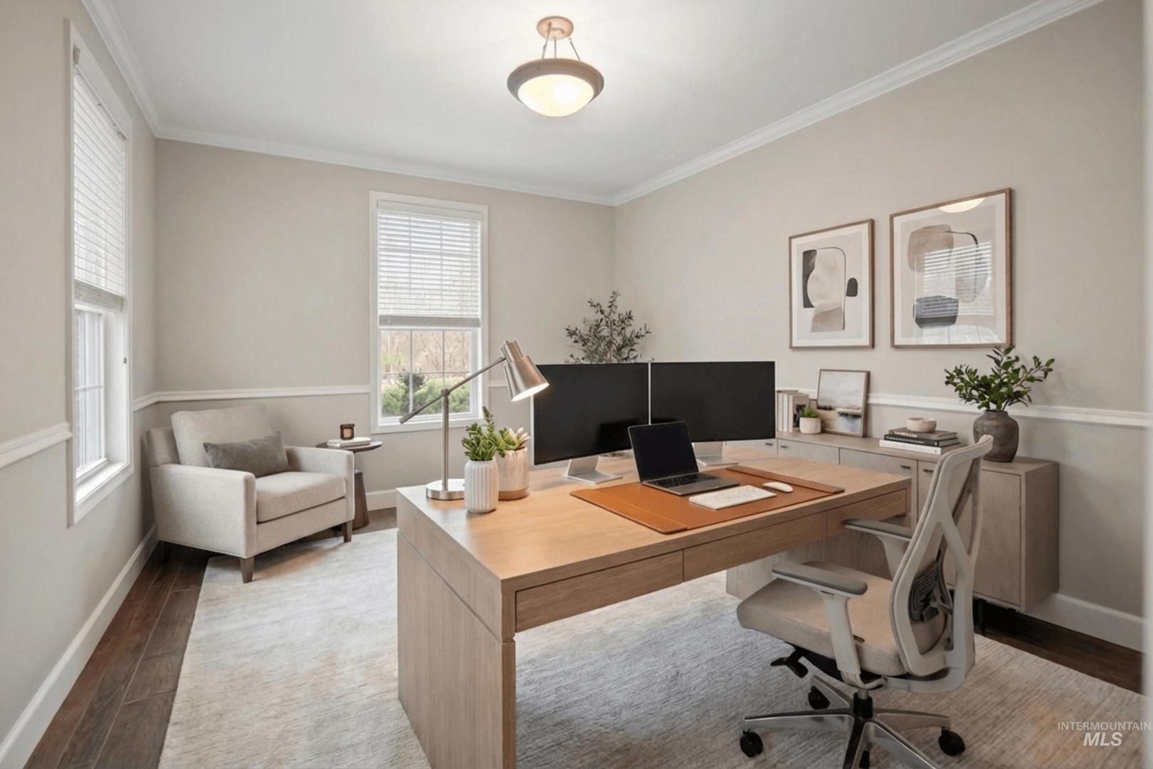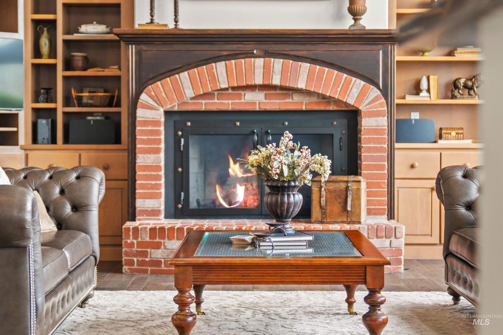 Tucked along a protected wildlife area along the Boise River, this Wood Duck Island home offers privacy, natural beauty, and an exceptional location. The backyard features a saltwater pool and spa, fire pit, tranquil creek, and direct access to the Boise River and Greenbelt. Located on a quiet cul de sac between Barber Park and Bown Crossing, the home provides easy access to recreation, dining, and everyday amenities. Inside, the light filled living room welcomes you with mountain views, a grand staircase, and open living and dining areas. The main level includes a private office and guest bedroom with adjacent full bath. The renovated kitchen features JennAir appliances, central island, quartz countertops, Italian tile flooring, and a pro style convection oven. Upstairs, the primary suite offers mountain, river and tree lined views, sitting area, and wood burning fireplace. The en suite bath includes an extended double vanity and walk in shower. 3 car tandem garage, fully fenced yard, and multiple outdoor living spaces complete this beautifully maintained home near downtown Boise and top area schools. Please see Docs for detailed amenities/updates list and floor plans. Matterport in Video link.