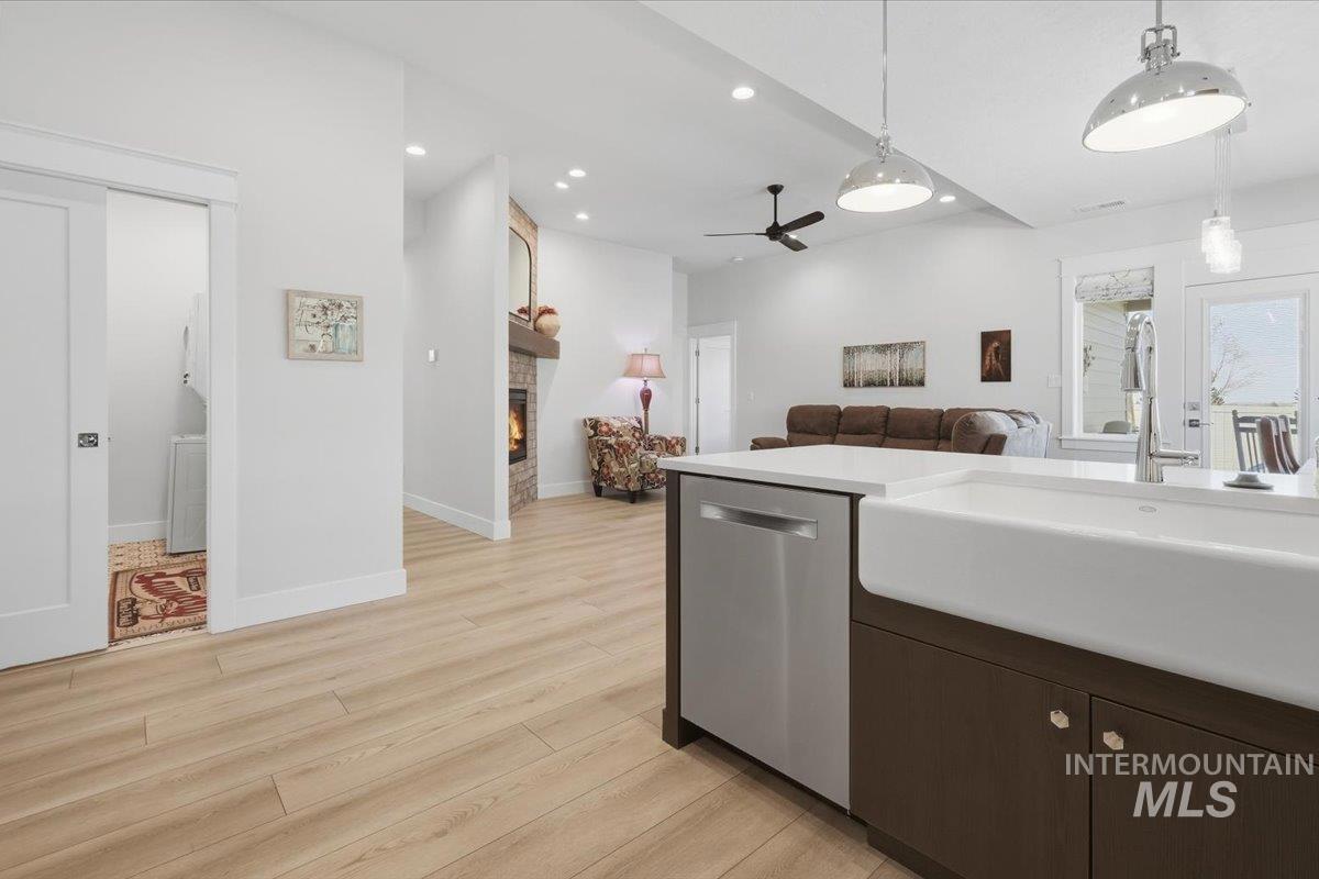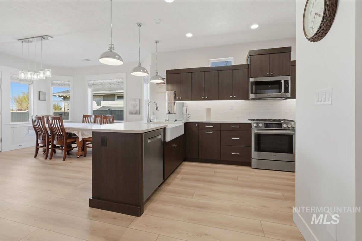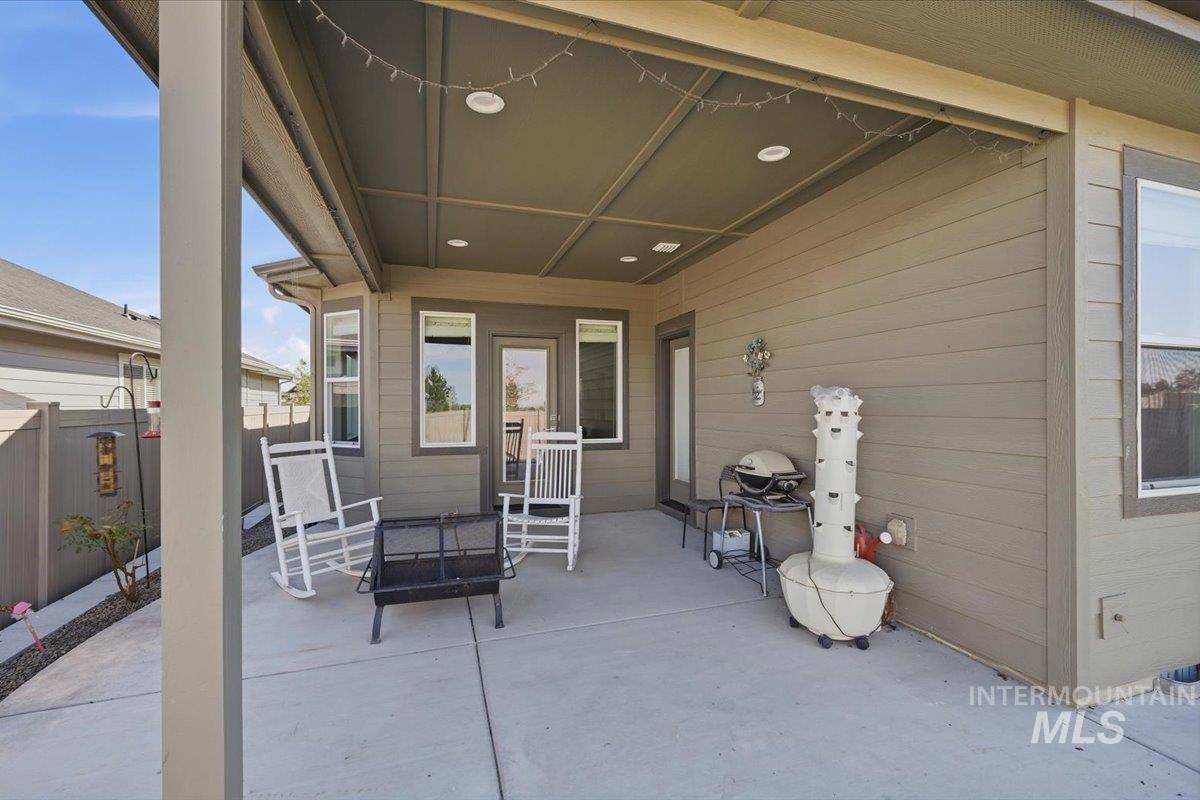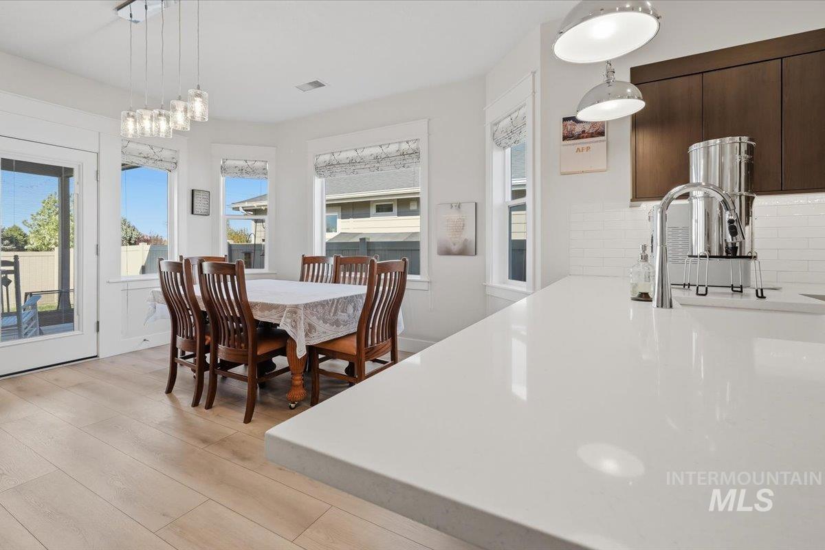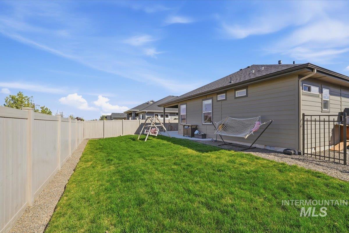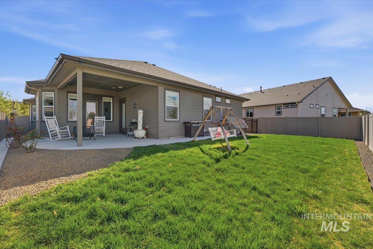 Welcome to your peaceful retreat in South Nampa`s desirable Heron Ridge! This impeccably maintained single-level home is just minutes from Lake Lowell and across from Redhawk Ridge Golf course, which makes it a dream for outdoor enthusiasts. Enjoy an open-concept great room, which features a gas fireplace, engineered vinyl plank flooring, quartz countertops and high-end Bosch appliances in a kitchen designed for entertaining! The split bedroom floor plan ensures privacy with a master suite that has a walk-in tile shower and dual vanities. This versatile layout includes an office/den, a walk in pantry and a mud bench off the laundry room. Outside you will find a fully updated landscaped and partially fenced yard with a covered patio, which you can relax on and take in the tranquility of the quiet, established community.