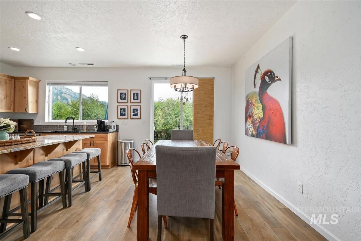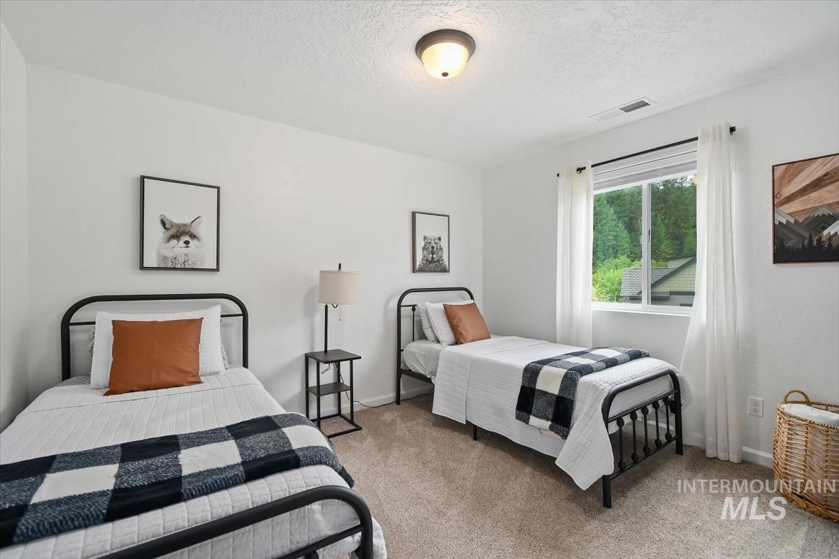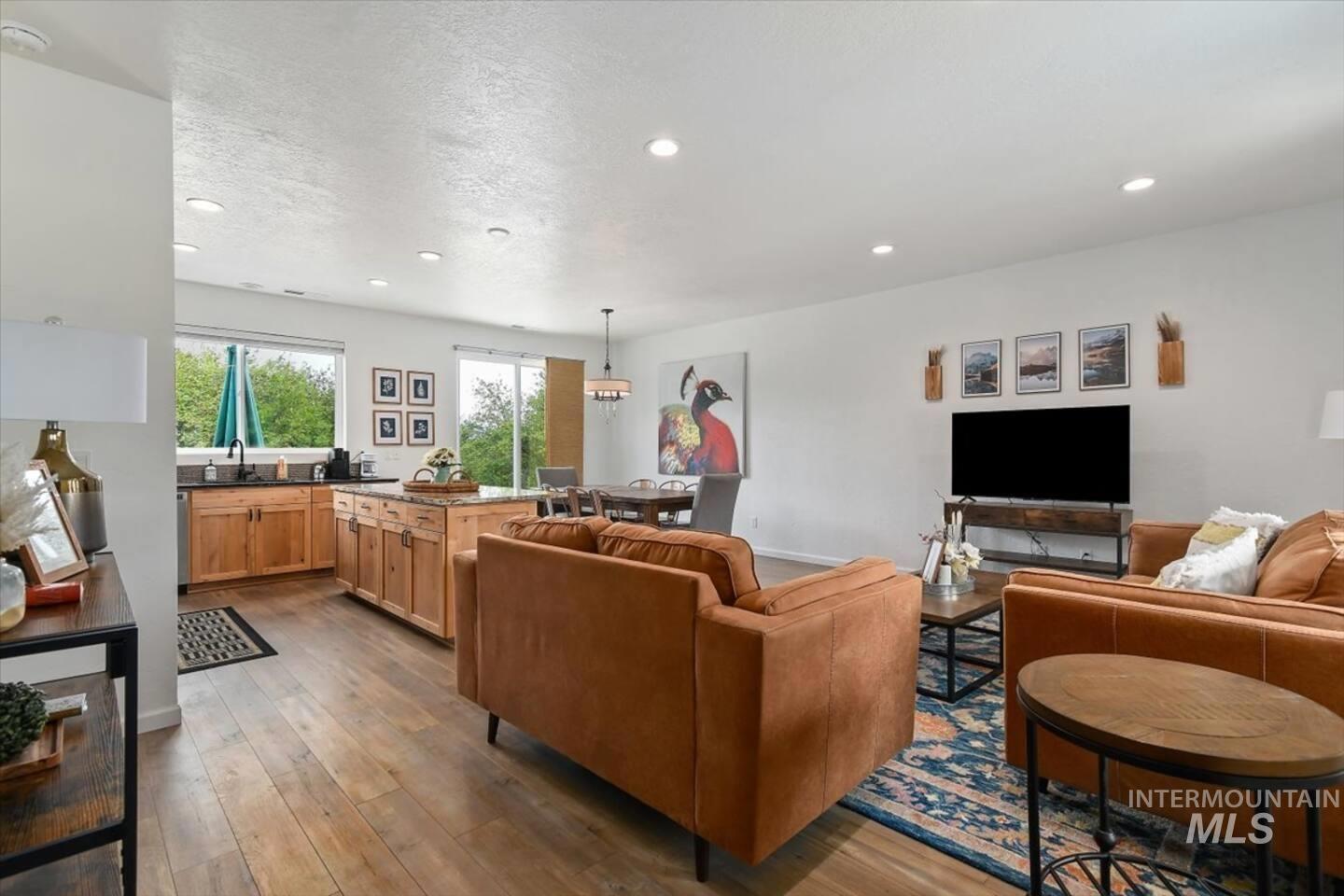 Breathtaking mountain views in the prestigious Southfork Landing community in Garden Valley. Perfectly positioned among high-end homes, this property offers an exceptional opportunity to own a luxury mountain retreat at an incredible value. Set at the base of the mountains, the setting is peaceful and inspiring, with community walking paths along the river and access to serene, fish-stocked ponds. Outdoor recreation is just minutes away—fishing, kayaking, off-roading, golfing, hot springs, hiking, hunting, and snowshoeing. Deer and elk are frequent visitors, adding to the natural beauty and tranquility. Inside, soaring ceilings and expansive windows fill the home with natural light. The main level features LVP flooring, with carpet upstairs. The primary suite on the main level includes a walk-in closet, dual vanities, and a large walk-in shower. The kitchen offers a large island, granite countertops, knotty pine cabinetry, and upgraded stainless steel appliances. Upstairs includes a spacious bonus room, three additional bedrooms, a full bath, and a large storage closet with HVAC access. Enjoy the wraparound concrete patio, perfect for relaxing or entertaining while taking in the views.