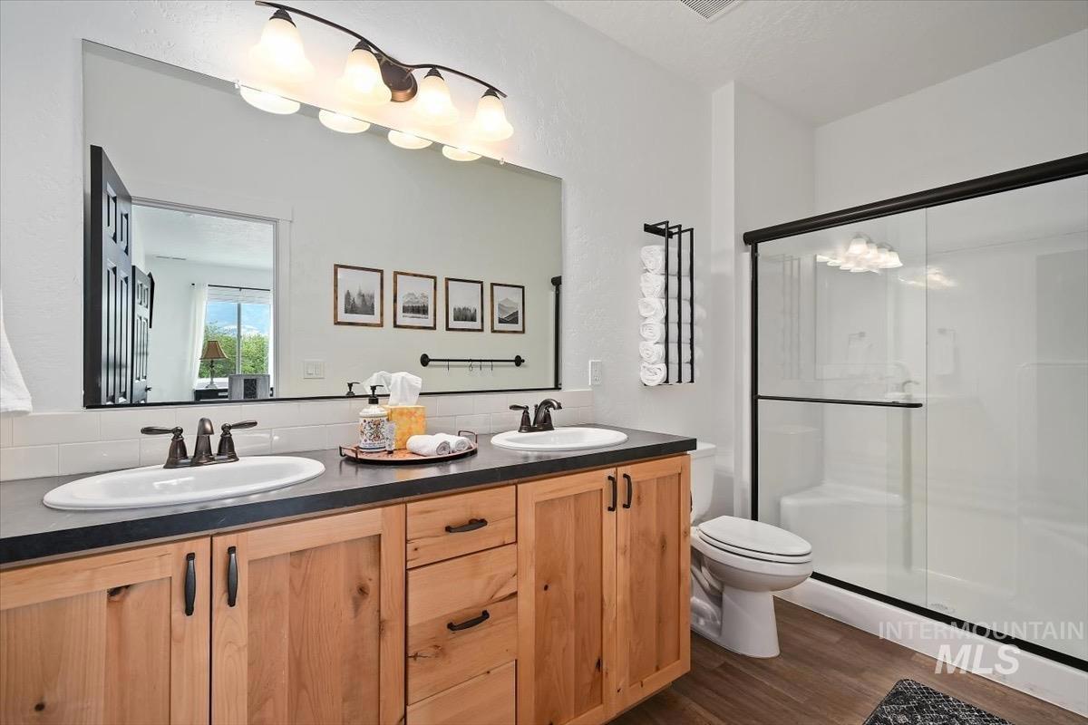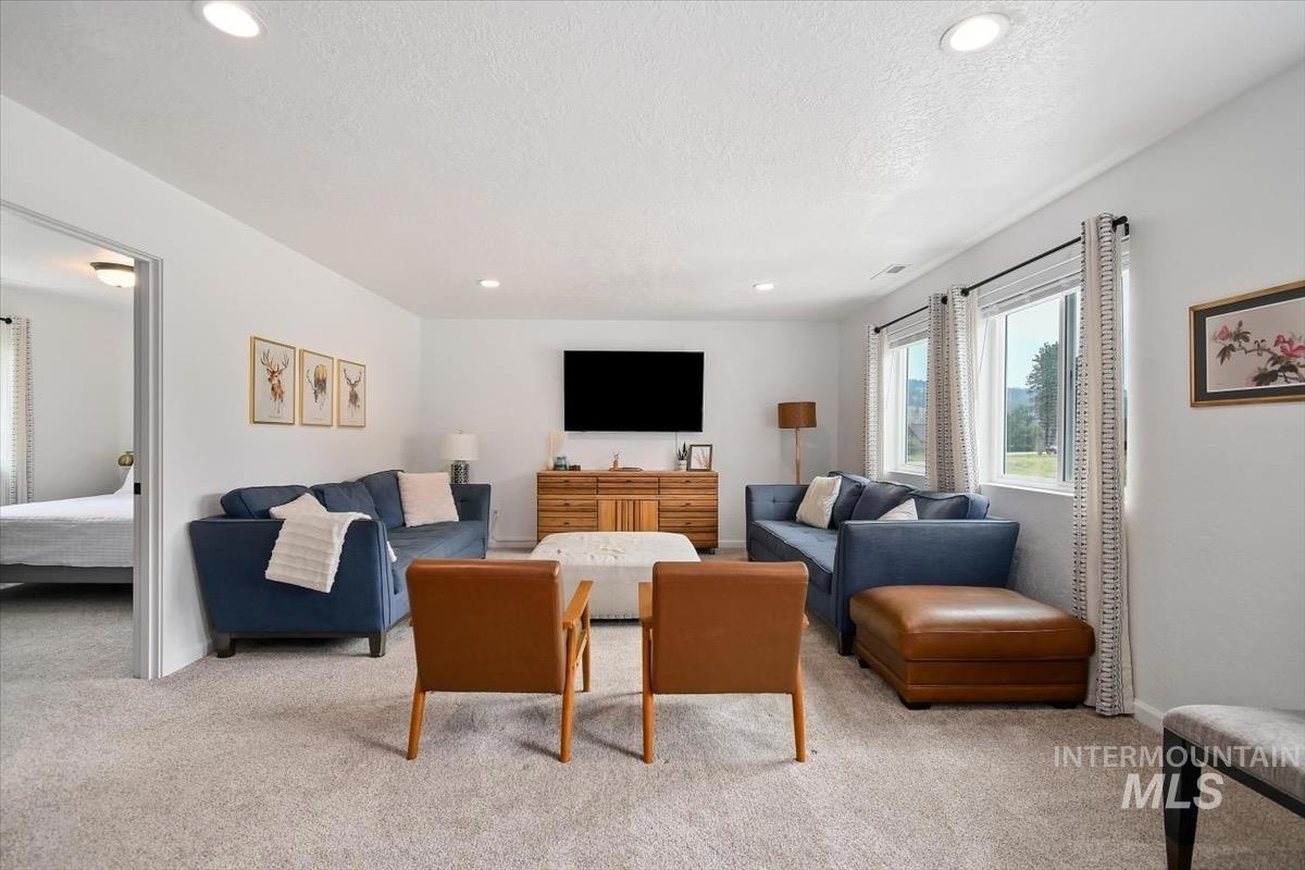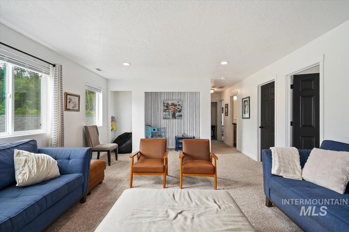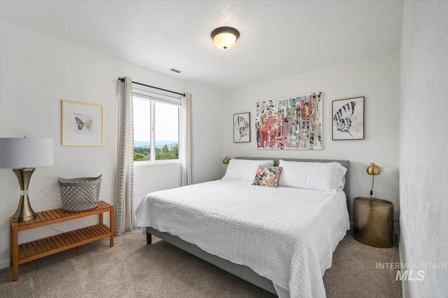 Breathtaking mountain views in the prestigious Southfork Landing community in Garden Valley. Perfectly positioned among high-end homes, this property offers an exceptional opportunity to own a luxury mountain retreat at an incredible value. Set at the base of the mountains, the setting is peaceful and inspiring, with community walking paths along the river and access to serene, fish-stocked ponds. Outdoor recreation is just minutes away—fishing, kayaking, off-roading, golfing, hot springs, hiking, hunting, and snowshoeing. Deer and elk are frequent visitors, adding to the natural beauty and tranquility. Inside, soaring ceilings and expansive windows fill the home with natural light. The main level features LVP flooring, with carpet upstairs. The primary suite on the main level includes a walk-in closet, dual vanities, and a large walk-in shower. The kitchen offers a large island, granite countertops, knotty pine cabinetry, and upgraded stainless steel appliances. Upstairs includes a spacious bonus room, three additional bedrooms, a full bath, and a large storage closet with HVAC access. Enjoy the wraparound concrete patio, perfect for relaxing or entertaining while taking in the views.