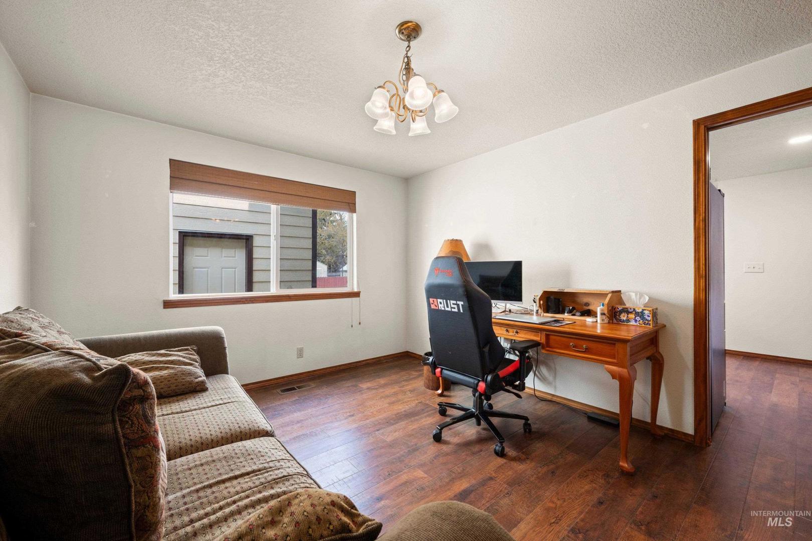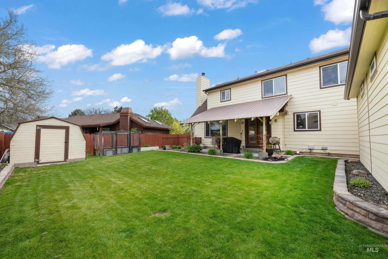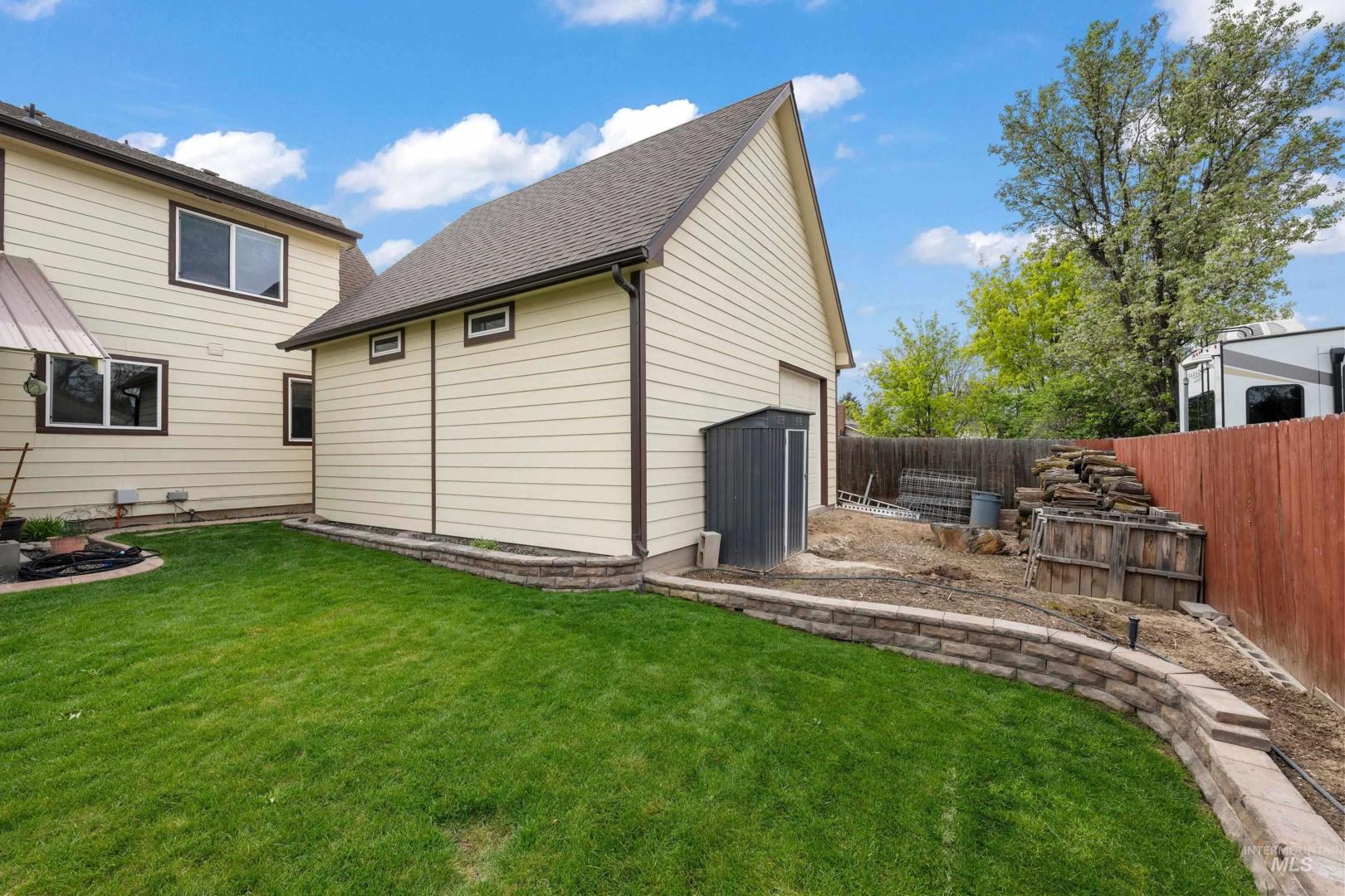 Darling home in a golf course community with a shop, gravel RV parking, and no HOA! Beautiful LVP flooring throughout the main level. Updated kitchen with granite counters, distressed soft close/full extension drawers/cabinets, and tile backsplash. Master bedroom is oversized with updated bathroom featuring tile floors, walk in tile shower and granite countertop. Two walk in closets and plentiful attic storage accessed from bedroom closets. Custom built bookshelf in the upstairs hallway. The 22x22 shop includes 10 foot ceilings, drive thru doors, 2x6 construction with blown in insulation, 220 voltage with 30 amps, and attic storage. Covered back patio with sunshade and drip system for hanging baskets. Back yard has two storage sheds, metal garden boxes, and covered garden area. The main garage includes tons of built in shelves and a water softener. The front of the home is brick with dormers and cute landscaping. Move in ready for your new home!