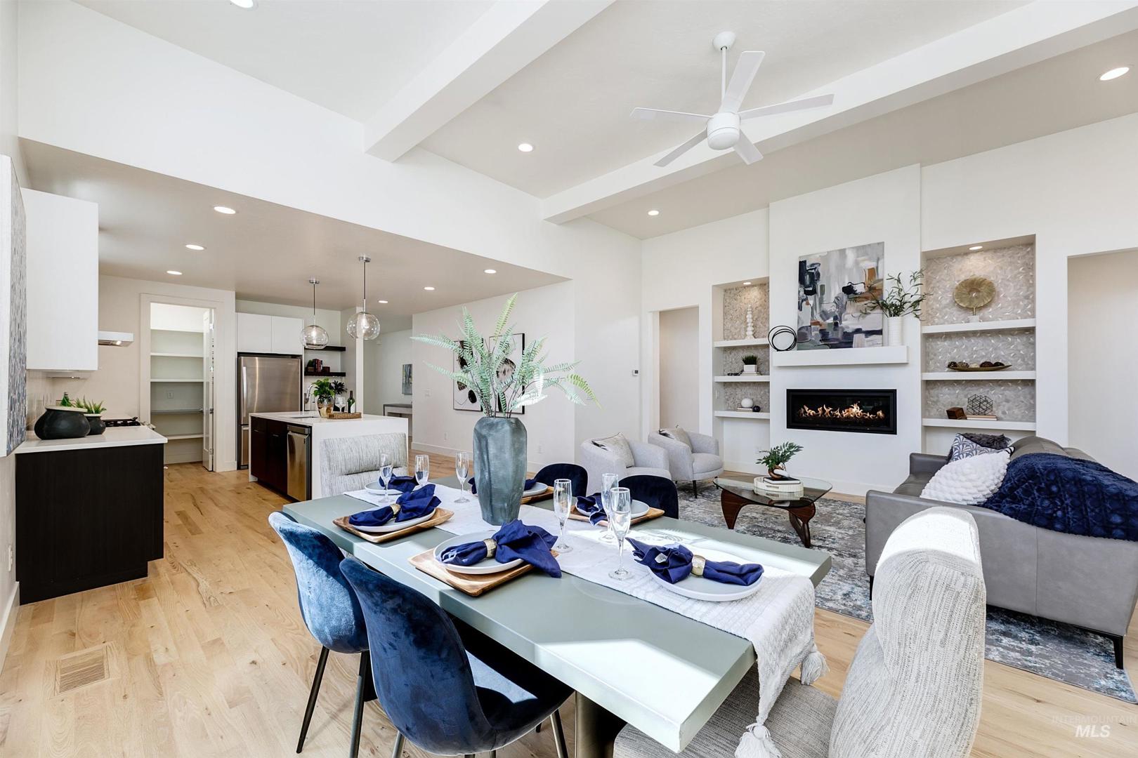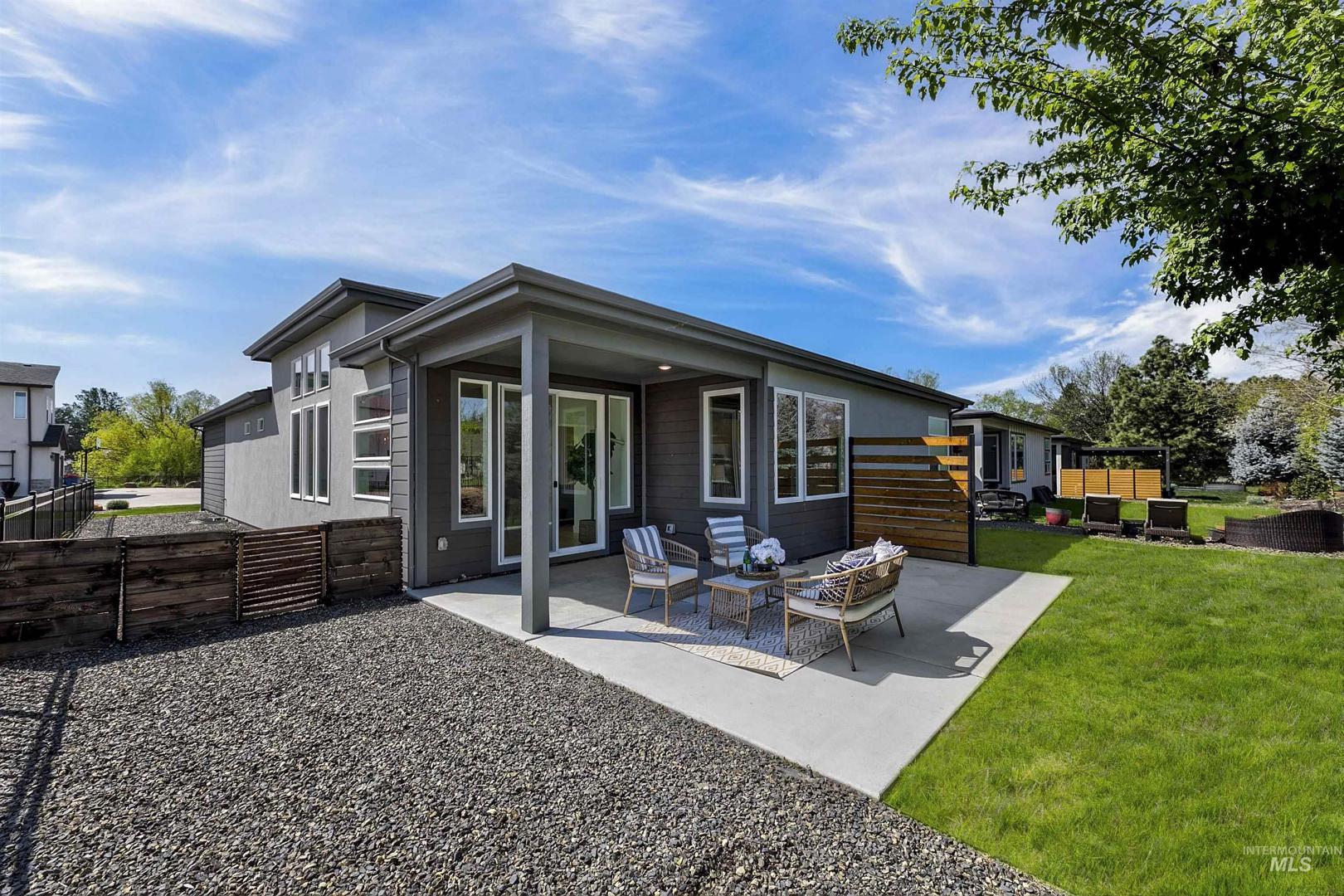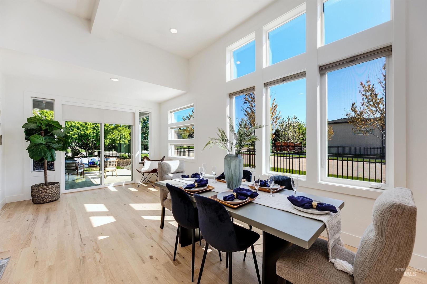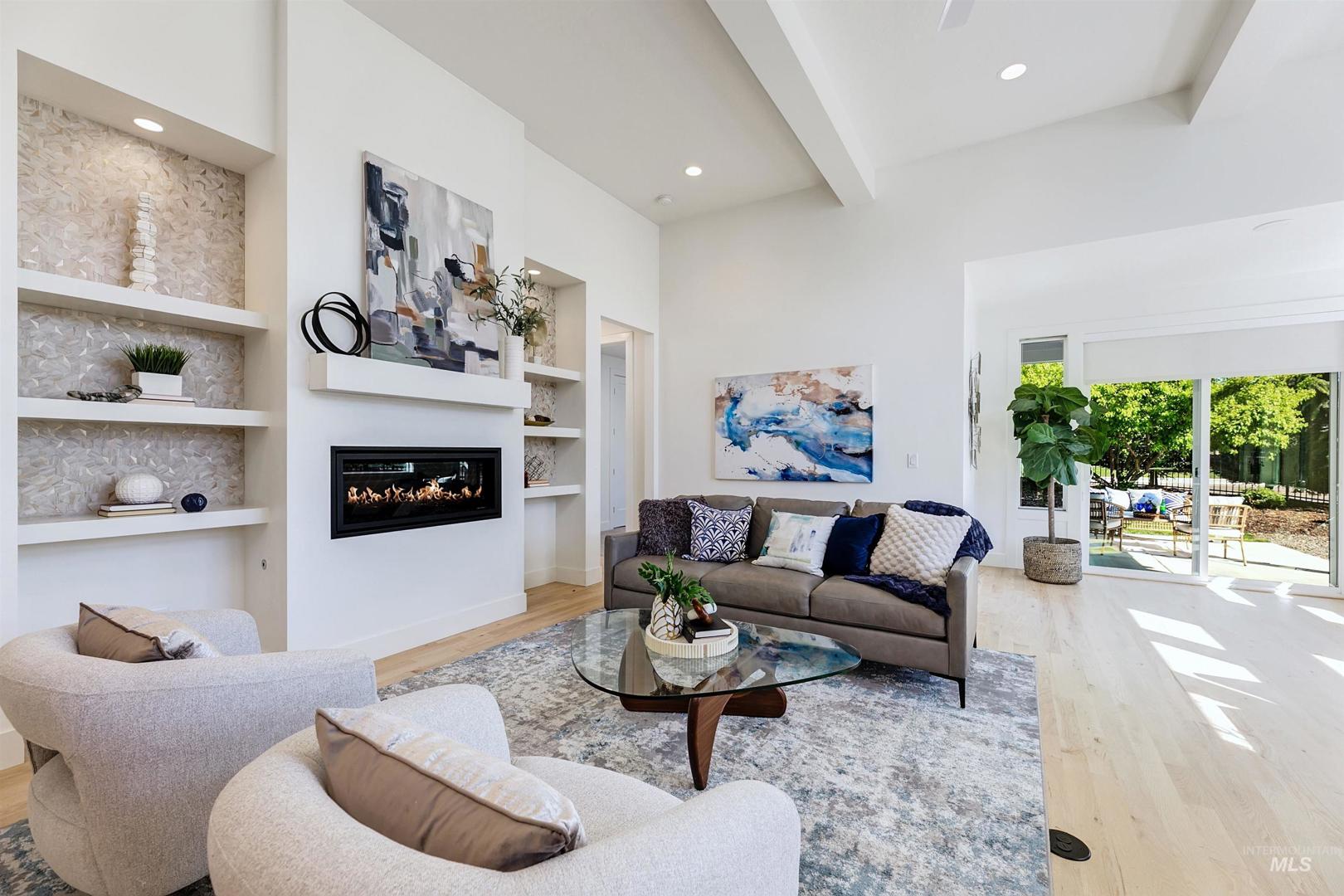 Your opportunity to own a turnkey home in one of Eagle’s most connected and desirable locations - where everything you love about downtown is just moments away. This exceptional single-level residence offers a blend of premier location, refined finishes, and effortless living. Walk or take a one-minute bike ride to dining, shopping, and everyday conveniences, then come home to a beautifully designed and modern residence. Inside, the home is filled with natural light and defined by rich hardwood floors, 12-foot ceilings with exposed beams, and expansive living spaces that balance comfort with elevated design. A gas fireplace with custom built-ins anchors the great room, while 8-foot interior doors and designer window treatments enhance the home’s modern aesthetic. The kitchen features soft-close cabinetry, quartz countertops, and a waterfall island designed as a central gathering space. Thoughtful details include a sleek hood, built-in desk, open shelving, and both toe-kick and under-cabinet LED lighting. Designed for indoor-outdoor enjoyment, the backyard offers an extended covered patio and professionally landscaped grounds - ideal for entertaining. This property provides quick access to nearby parks, the Boise River Greenbelt, and foothill trails for year-round recreation.