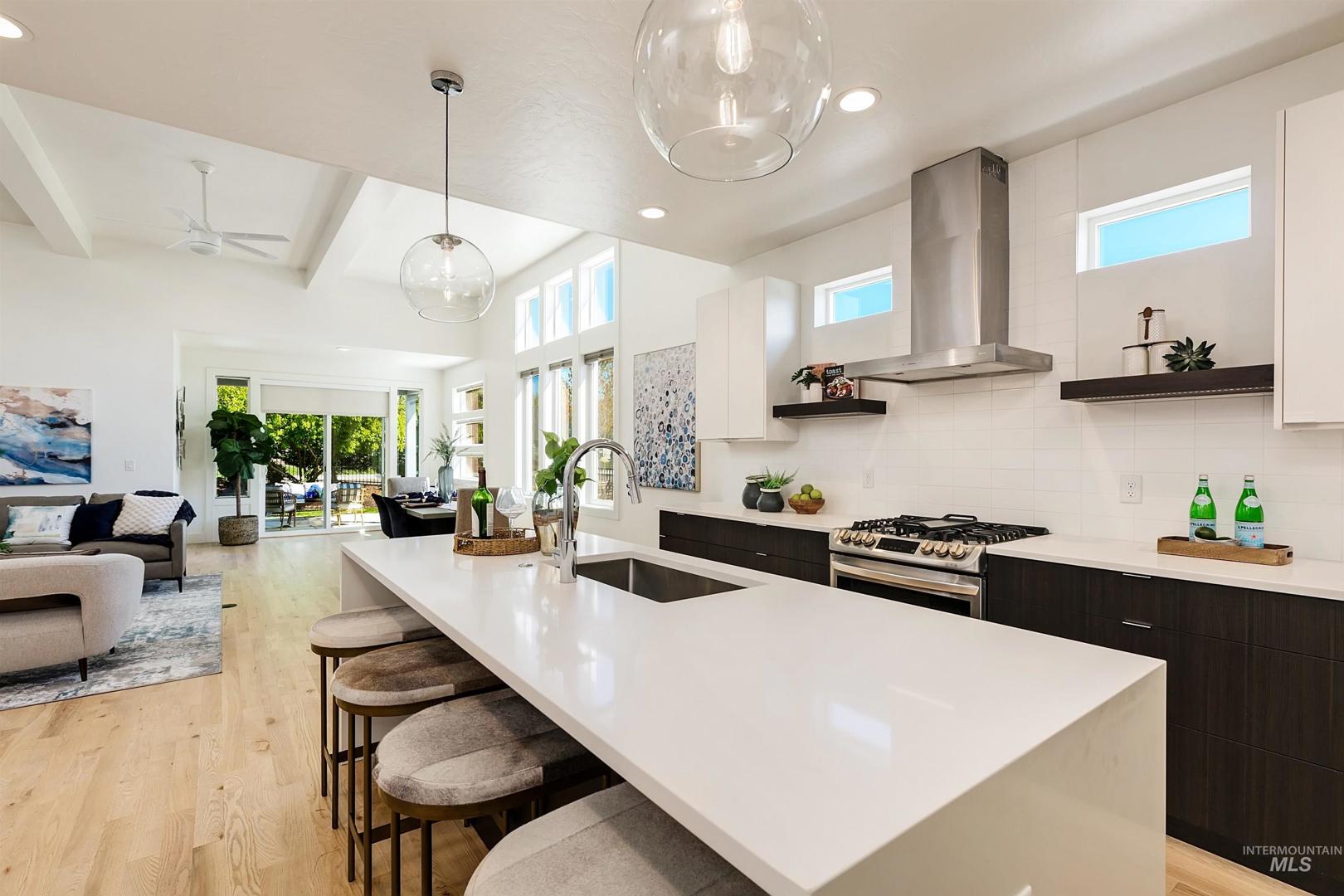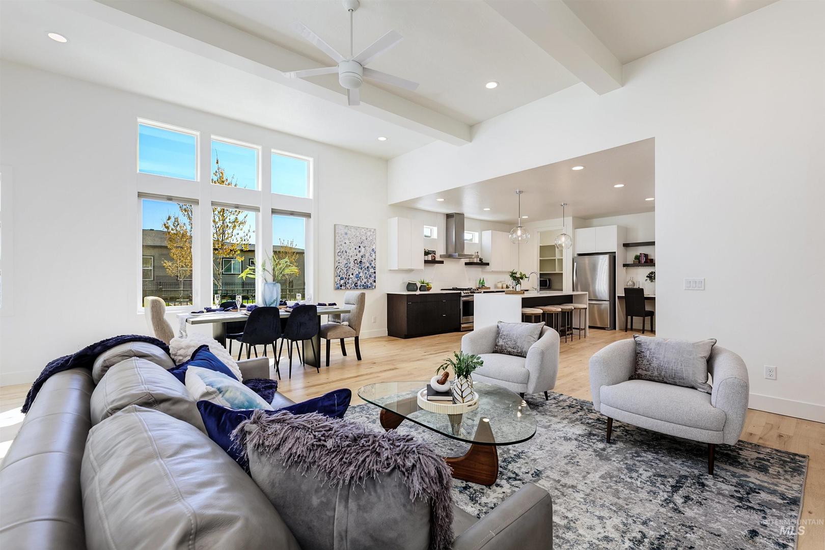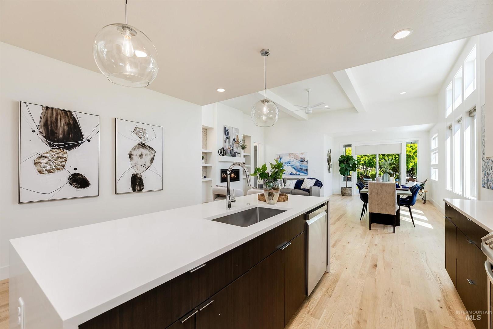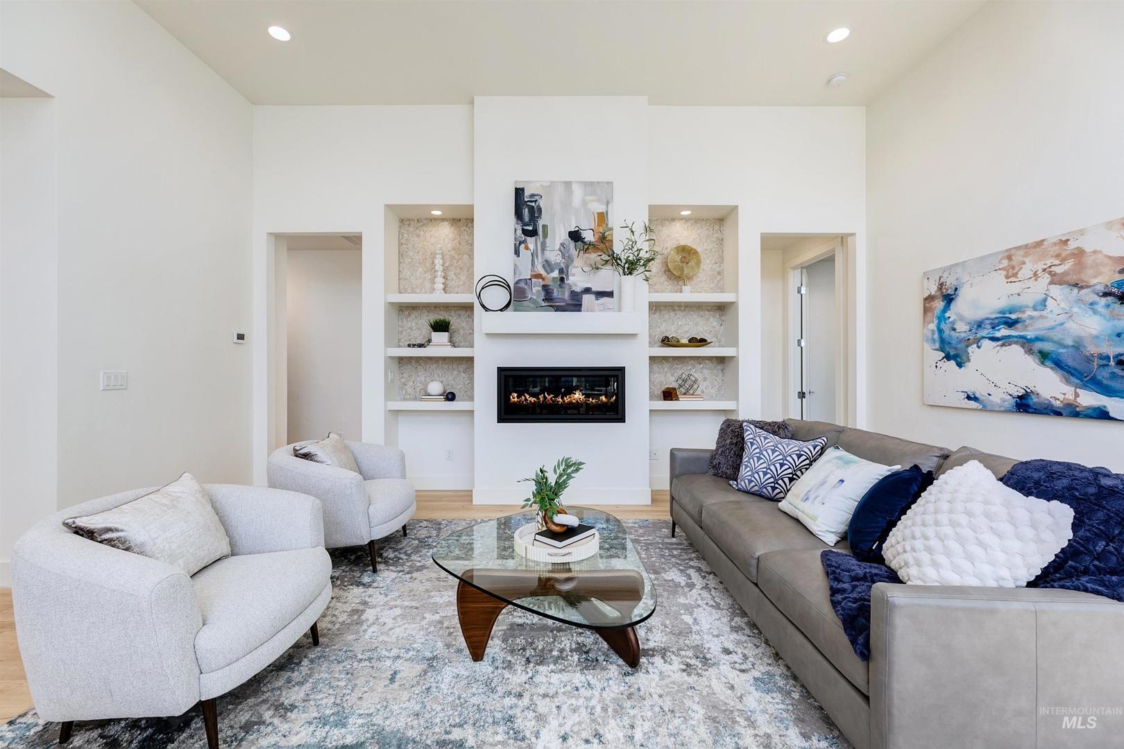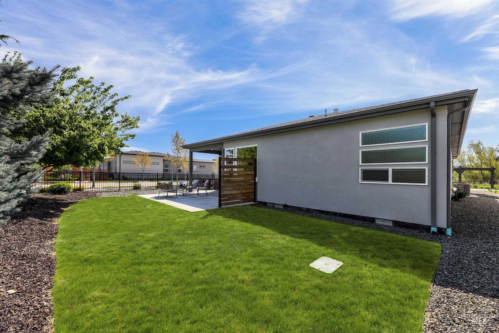 Your opportunity to own a turnkey home in one of Eagle’s most connected and desirable locations - where everything you love about downtown is just moments away. This exceptional single-level residence offers a blend of premier location, refined finishes, and effortless living. Walk or take a one-minute bike ride to dining, shopping, and everyday conveniences, then come home to a beautifully designed and modern residence. Inside, the home is filled with natural light and defined by rich hardwood floors, 12-foot ceilings with exposed beams, and expansive living spaces that balance comfort with elevated design. A gas fireplace with custom built-ins anchors the great room, while 8-foot interior doors and designer window treatments enhance the home’s modern aesthetic. The kitchen features soft-close cabinetry, quartz countertops, and a waterfall island designed as a central gathering space. Thoughtful details include a sleek hood, built-in desk, open shelving, and both toe-kick and under-cabinet LED lighting. Designed for indoor-outdoor enjoyment, the backyard offers an extended covered patio and professionally landscaped grounds - ideal for entertaining. This property provides quick access to nearby parks, the Boise River Greenbelt, and foothill trails for year-round recreation.
