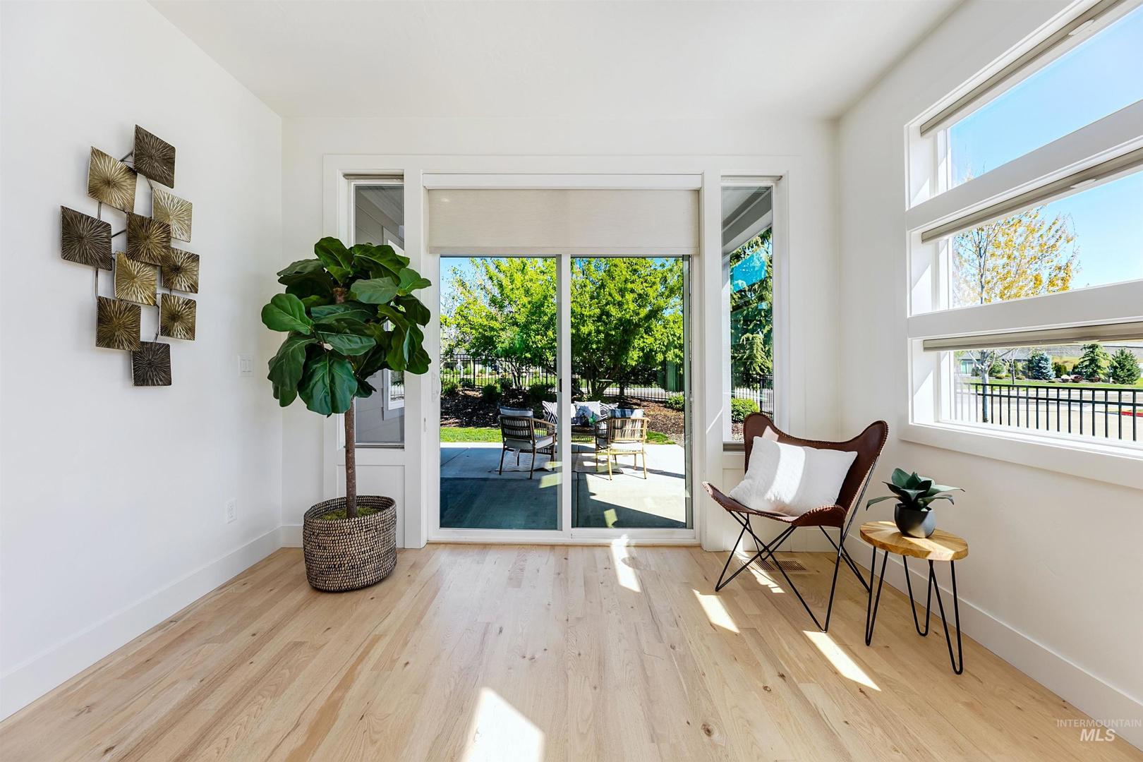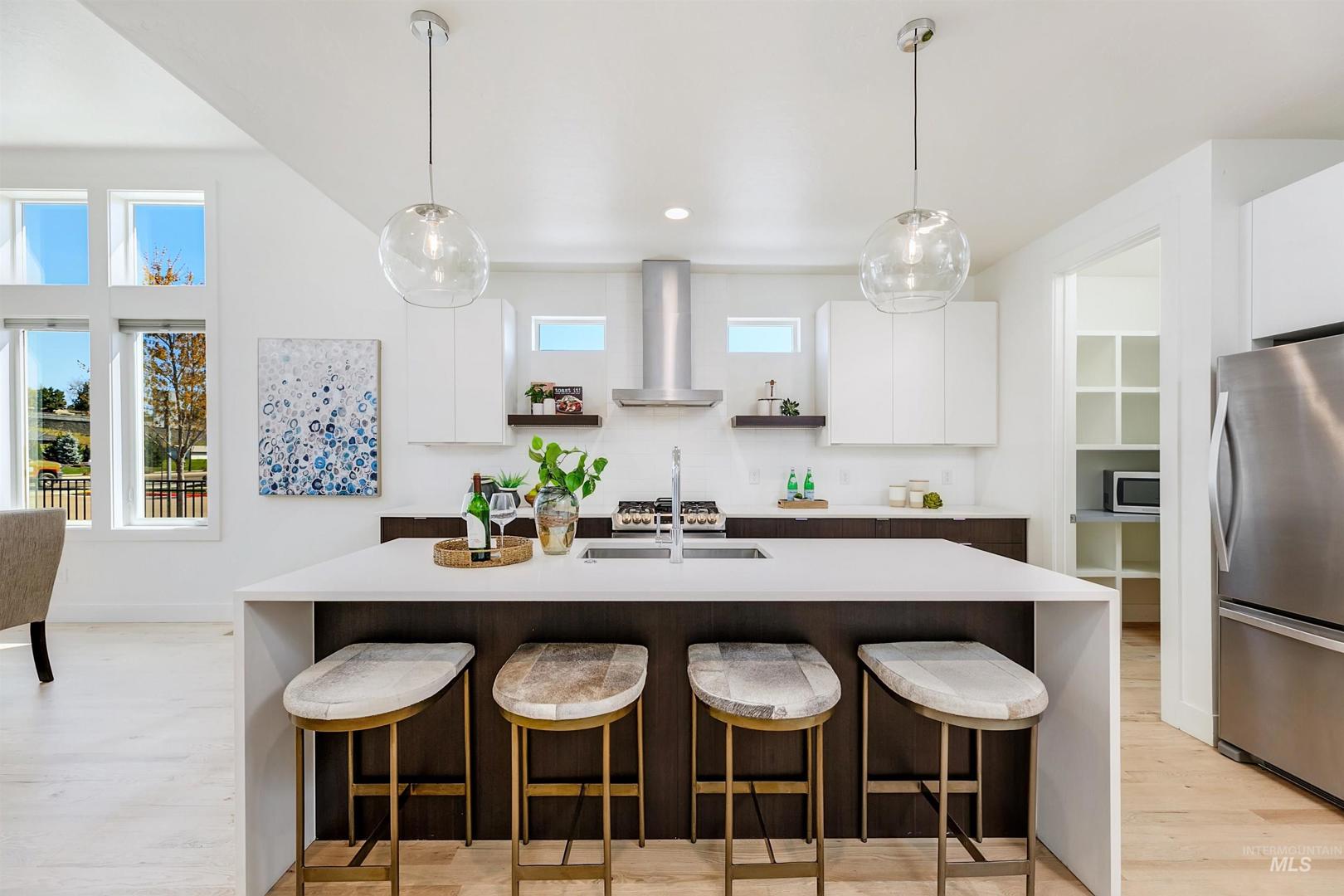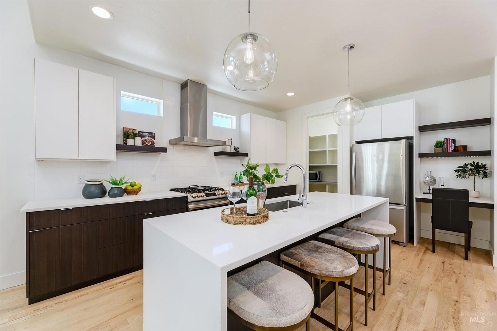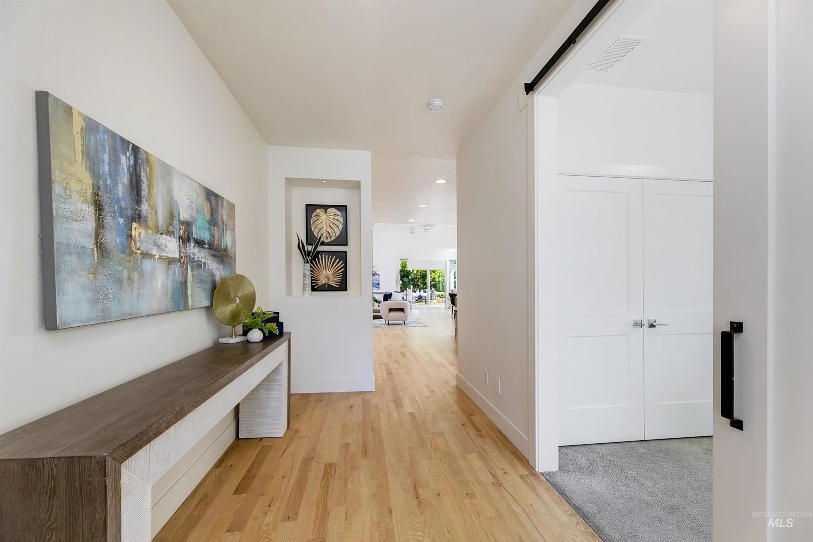 Your opportunity to own a turnkey home in one of Eagle’s most connected and desirable locations - where everything you love about downtown is just moments away. This exceptional single-level residence offers a blend of premier location, refined finishes, and effortless living. Walk or take a one-minute bike ride to dining, shopping, and everyday conveniences, then come home to a beautifully designed and modern residence. Inside, the home is filled with natural light and defined by rich hardwood floors, 12-foot ceilings with exposed beams, and expansive living spaces that balance comfort with elevated design. A gas fireplace with custom built-ins anchors the great room, while 8-foot interior doors and designer window treatments enhance the home’s modern aesthetic. The kitchen features soft-close cabinetry, quartz countertops, and a waterfall island designed as a central gathering space. Thoughtful details include a sleek hood, built-in desk, open shelving, and both toe-kick and under-cabinet LED lighting. Designed for indoor-outdoor enjoyment, the backyard offers an extended covered patio and professionally landscaped grounds - ideal for entertaining. This property provides quick access to nearby parks, the Boise River Greenbelt, and foothill trails for year-round recreation.