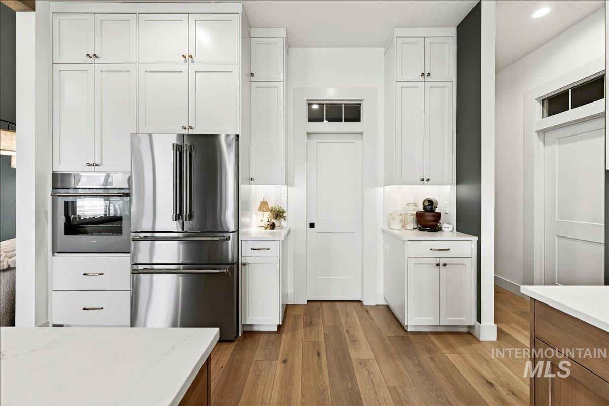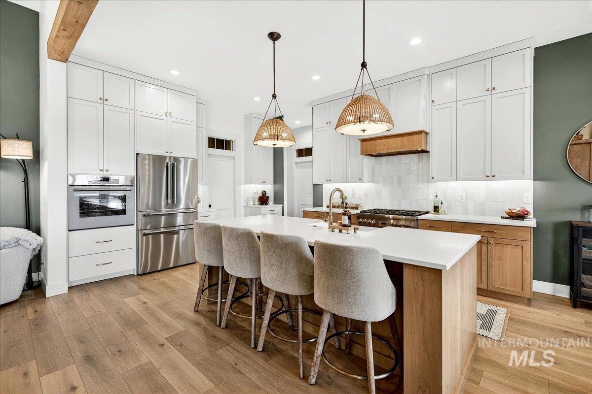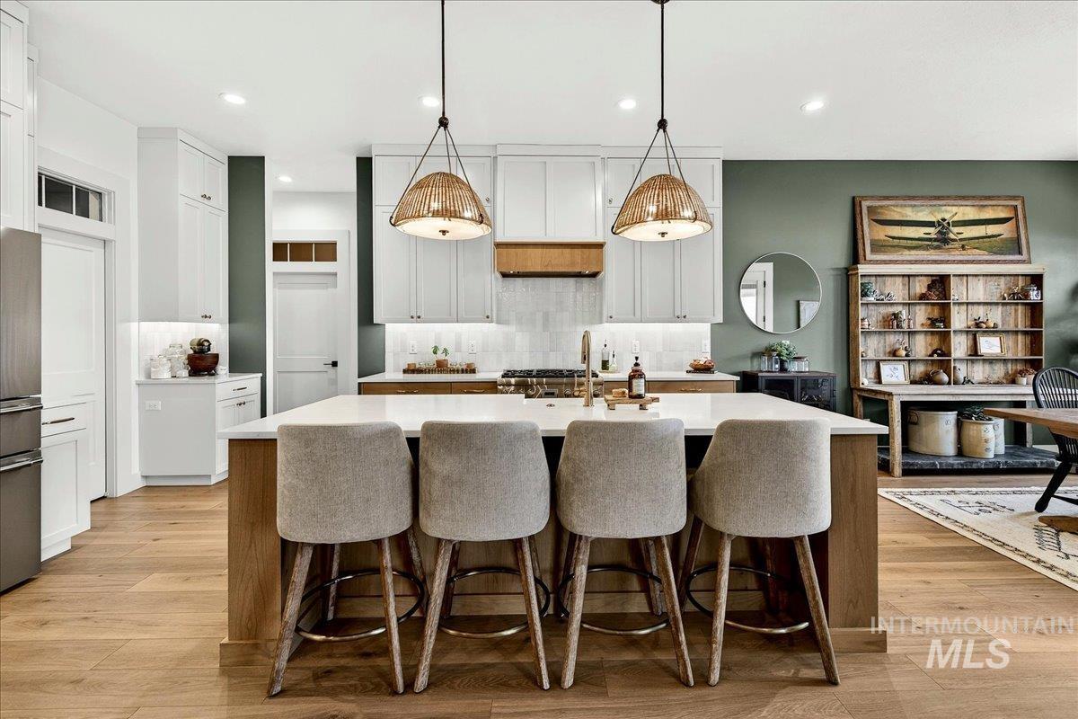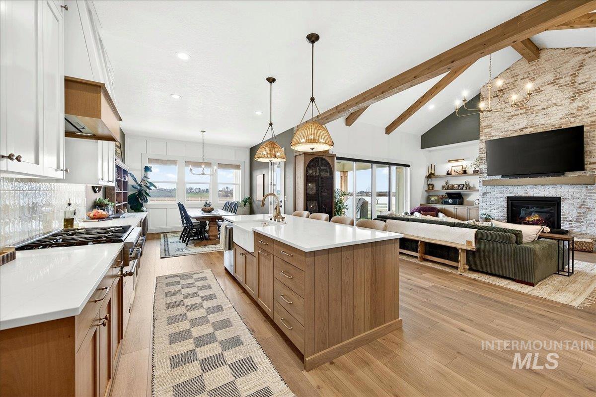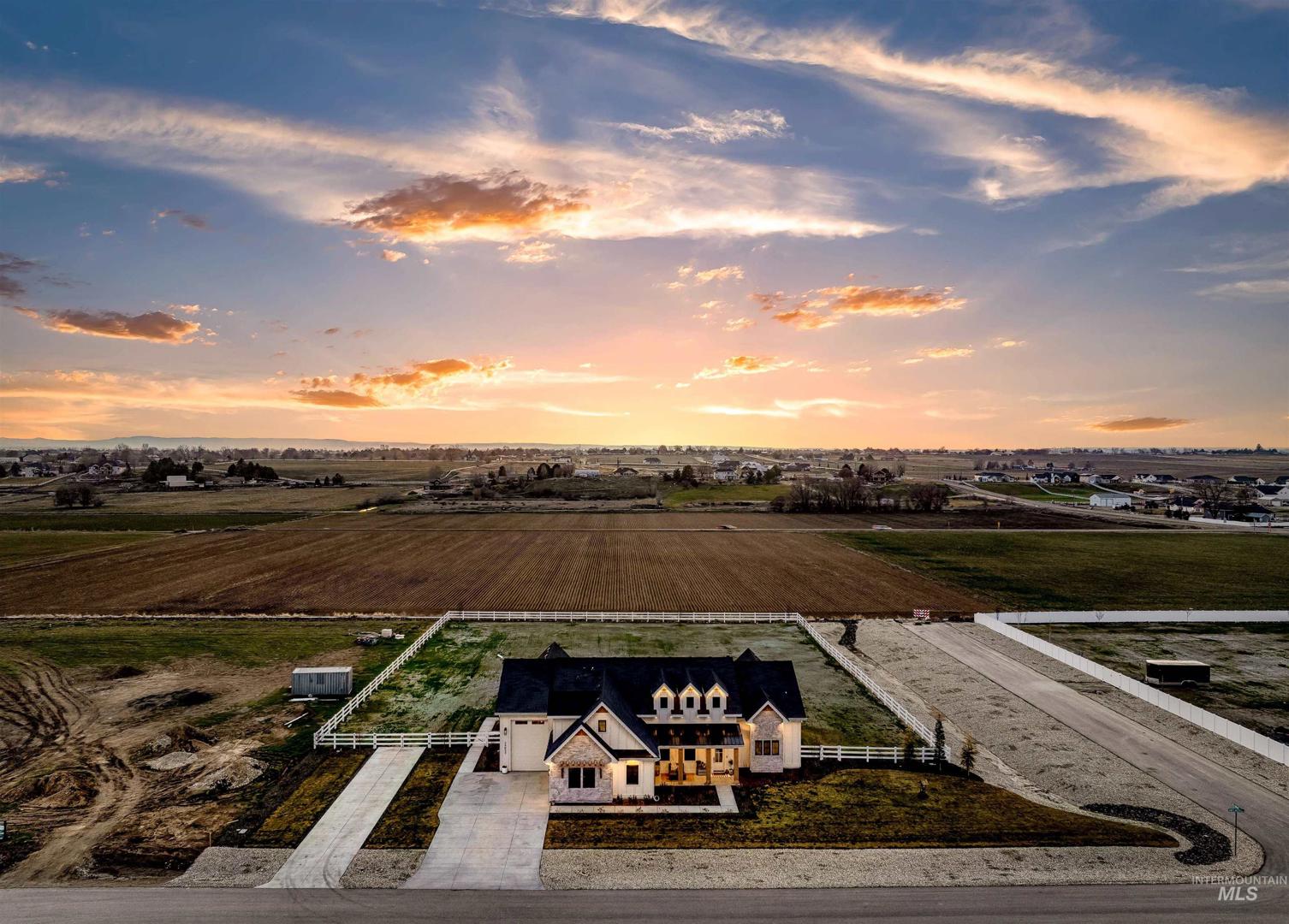 Better than new and thoughtfully upgraded, this luxury farmhouse sits on just over an acre with rare flexibility and future potential. In addition to the attached 36` RV bay, the lot can accommodate a detached 65` shop or ADU, creating endless opportunity for toys, hobbies and multigenerational living. Over $100,000 in high-end upgrades elevate every space. Designer lighting, stone and tile selections, white-washed brick accents and expansive multi-sliding doors frame breathtaking sunsets and seamlessly connect indoor and outdoor living. The kitchen is a true showpiece featuring quartz counters, a 6-burner Thermador gas cooktop, double ovens and a spacious walk-in butler’s pantry designed for both everyday living and entertaining. A rare highlight: two main level primary suites - ideal for privacy and comfort. No details has been overlooked, from automated blinds and shades to EV chargers, epoxy garage floors, accent paint and curated designer finishes throughout. The property is fully fenced, professionally landscaped and hydroseeded - offering the benefit of new construction without the wait or added expense. Luxury, land and lifestyle: this is Middleton living at it’s finest!