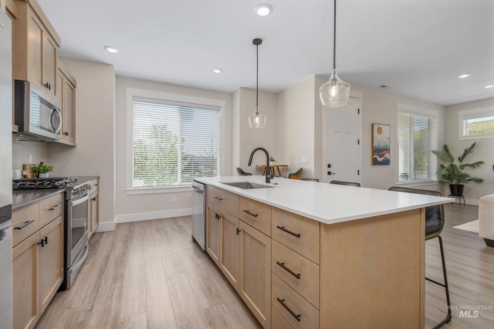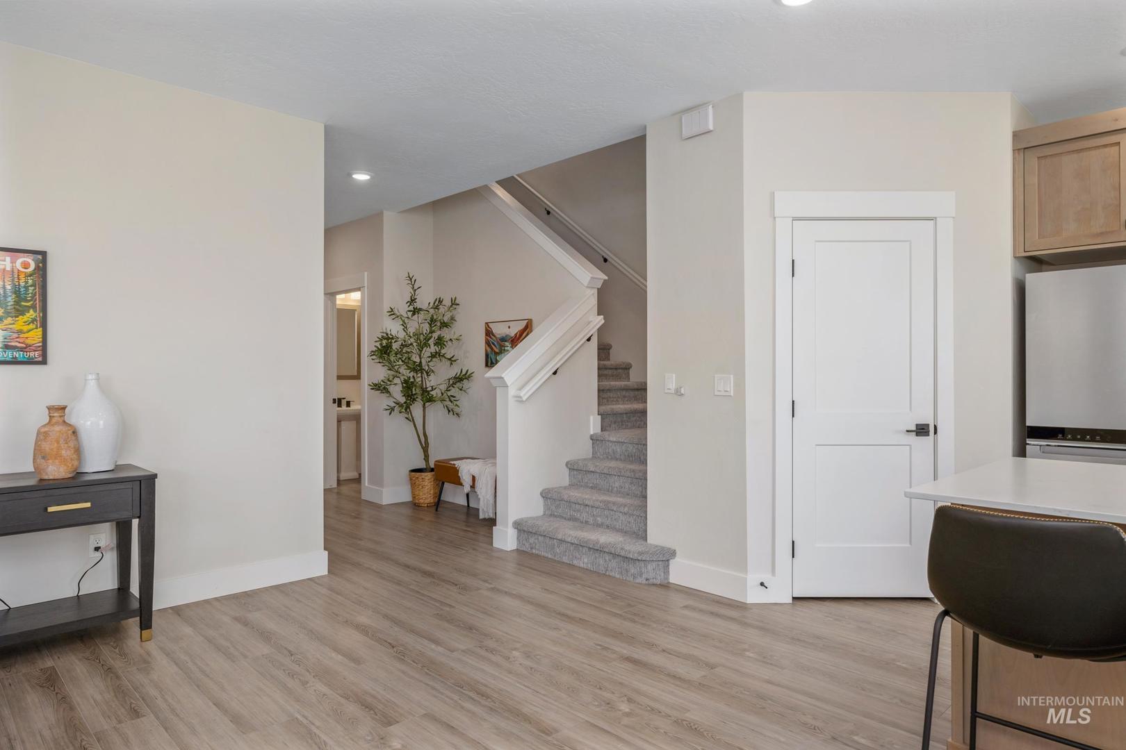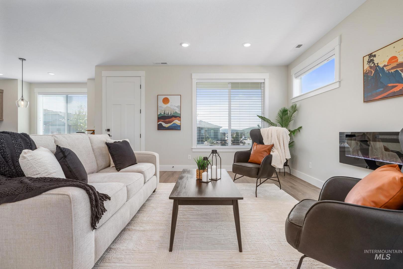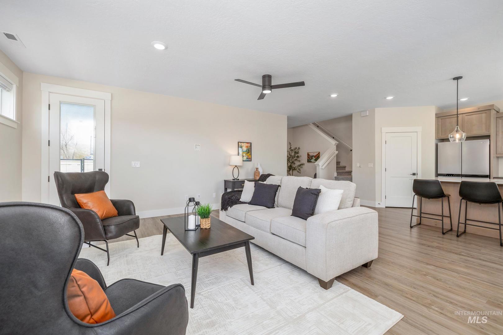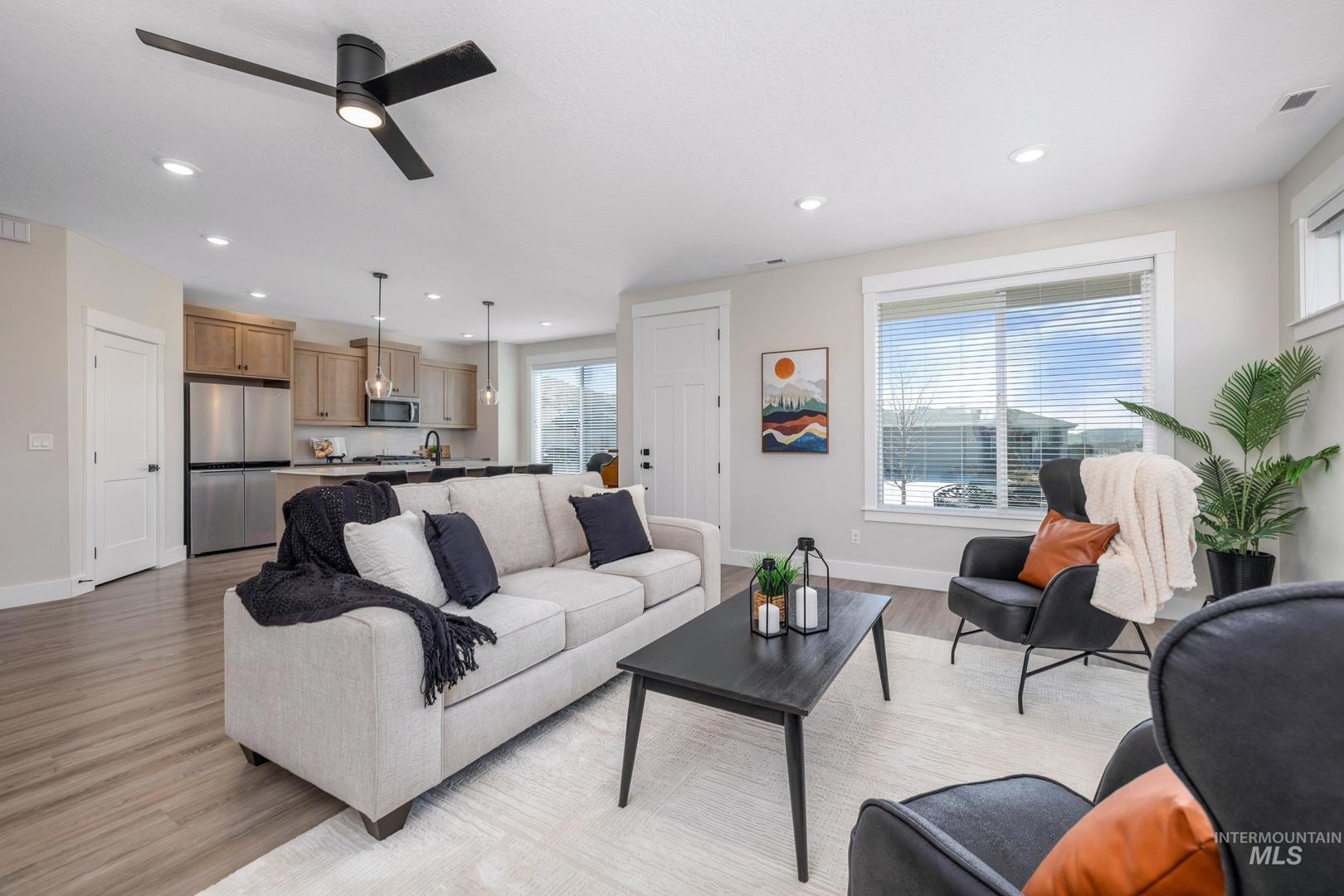 Better than new, this end-unit townhome in Avimor offers privacy, thoughtful upgrades, and an ideal layout. The main level features open-concept living with a family room and electric fireplace that opens to a private patio. The kitchen is designed for both function and style with quartz countertops, stainless steel appliances, island with breakfast bar & pantry. The main-level primary suite includes dual vanities, tile shower & walk-in closet. A half bath & laundry room complete the main floor. Upstairs, enjoy a generous bonus room or loft, two additional bedrooms, and a full guest bath. The oversized two-car garage offers extra space on both sides for storage or flexibility. Located in the heart of Avimor, this home provides access to a truly unmatched lifestyle with the outdoor pool just 0.2 miles away, plus community center featuring an indoor pool, fitness center, library, meeting spaces & year-round events. Residents enjoy over 100 miles of hiking/biking trails, parks, playgrounds, sports courts including tennis, pickleball, basketball, soccer fields, fishing pond & outdoor amphitheater. The community also offers a K–8 charter school and early learning center opening soon, along with the convenience of an on-site restaurant/brewery, coffee shop & gas station/market, creating a connected, amenity-rich lifestyle right at your doorstep.