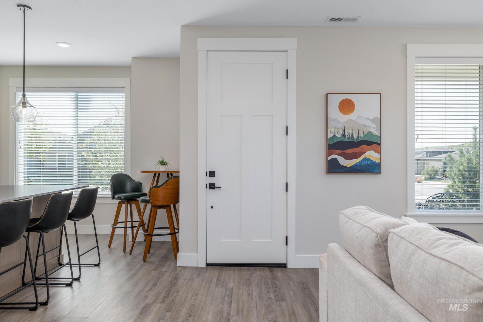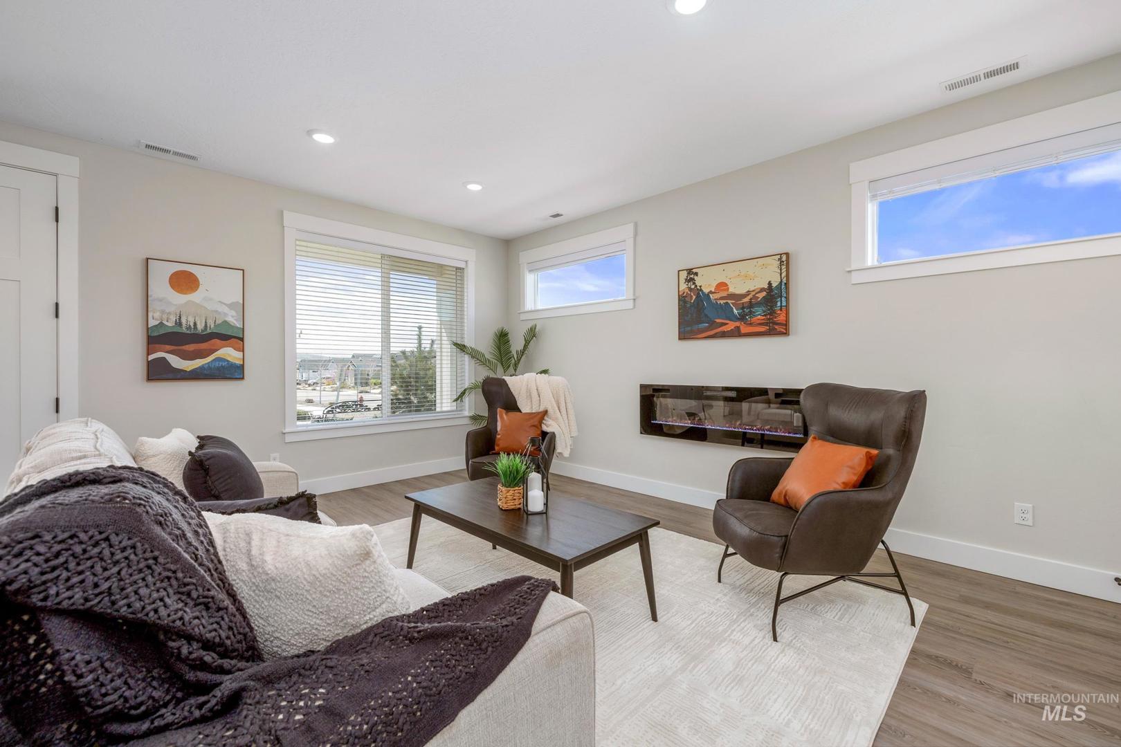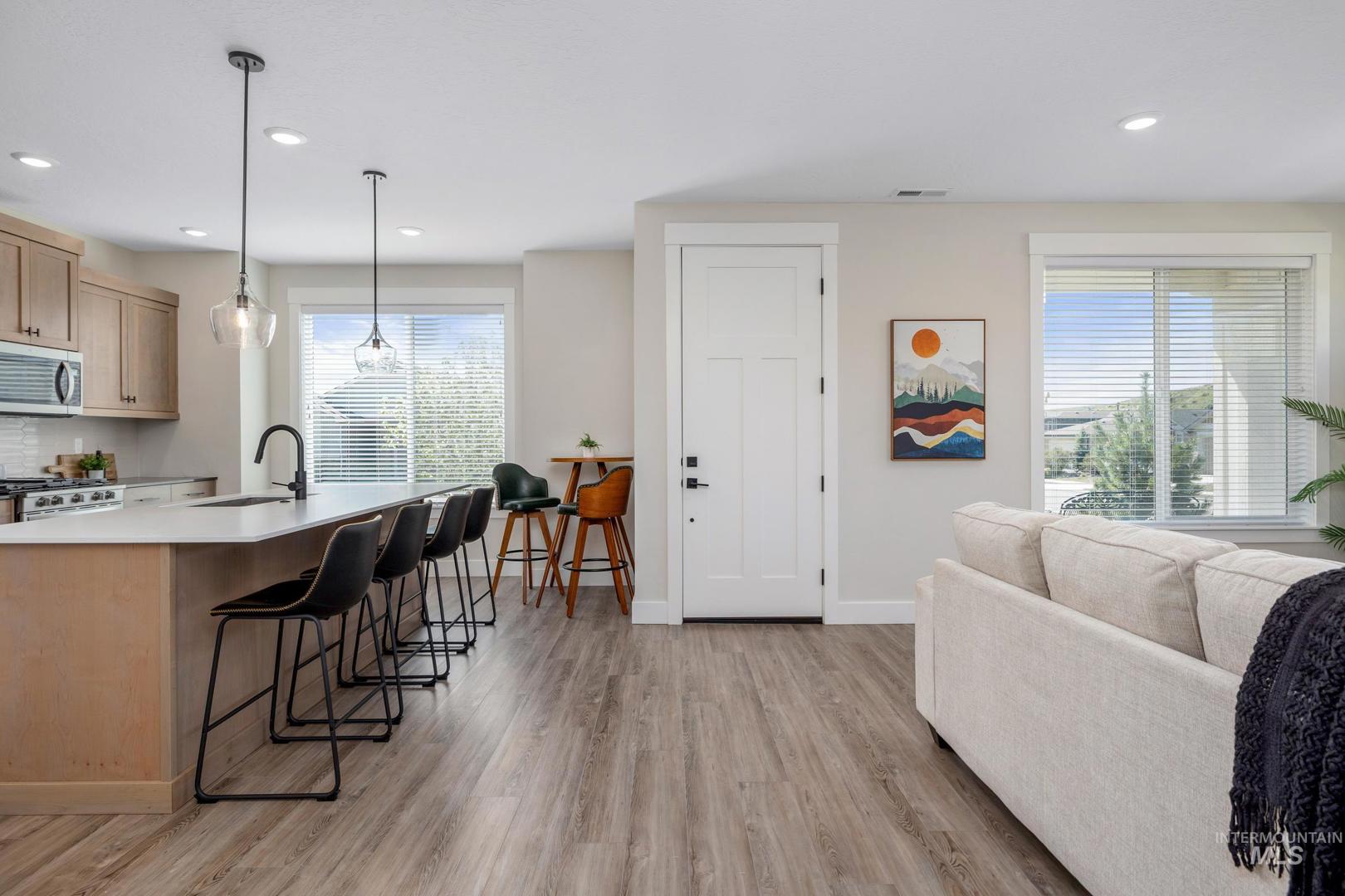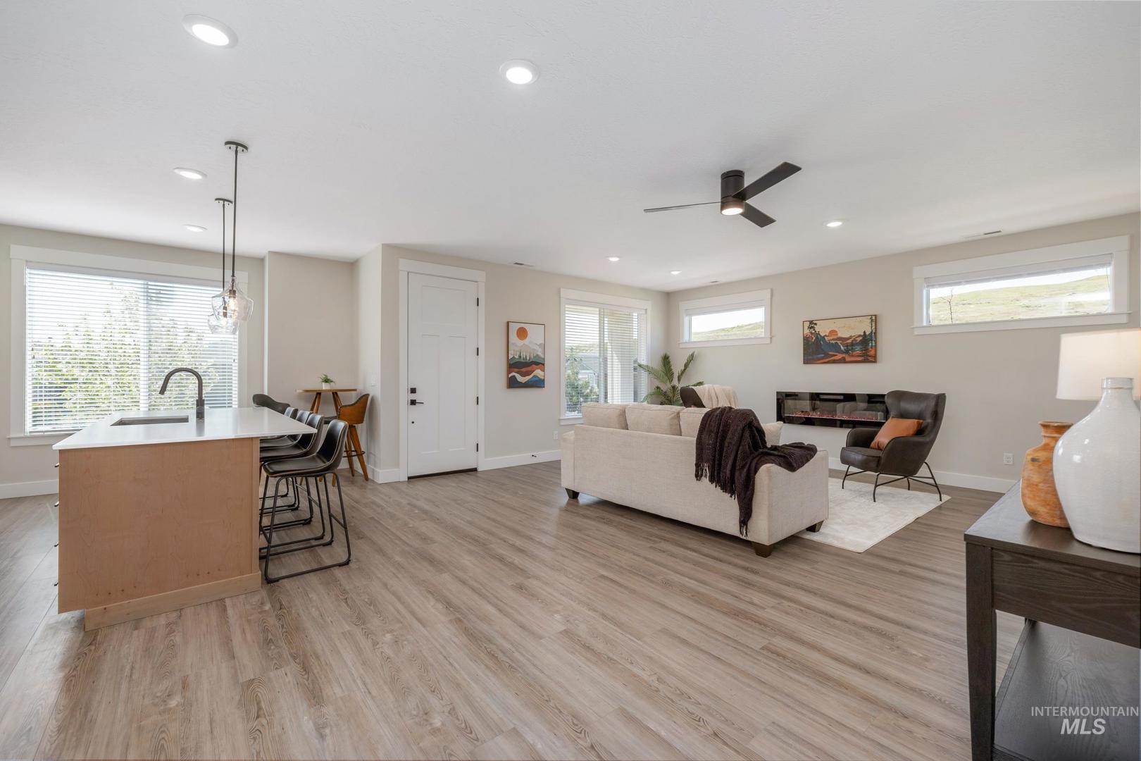 Better than new, this end-unit townhome in Avimor offers privacy, thoughtful upgrades, and an ideal layout. The main level features open-concept living with a family room and electric fireplace that opens to a private patio. The kitchen is designed for both function and style with quartz countertops, stainless steel appliances, island with breakfast bar & pantry. The main-level primary suite includes dual vanities, tile shower & walk-in closet. A half bath & laundry room complete the main floor. Upstairs, enjoy a generous bonus room or loft, two additional bedrooms, and a full guest bath. The oversized two-car garage offers extra space on both sides for storage or flexibility. Located in the heart of Avimor, this home provides access to a truly unmatched lifestyle with the outdoor pool just 0.2 miles away, plus community center featuring an indoor pool, fitness center, library, meeting spaces & year-round events. Residents enjoy over 100 miles of hiking/biking trails, parks, playgrounds, sports courts including tennis, pickleball, basketball, soccer fields, fishing pond & outdoor amphitheater. The community also offers a K–8 charter school and early learning center opening soon, along with the convenience of an on-site restaurant/brewery, coffee shop & gas station/market, creating a connected, amenity-rich lifestyle right at your doorstep.