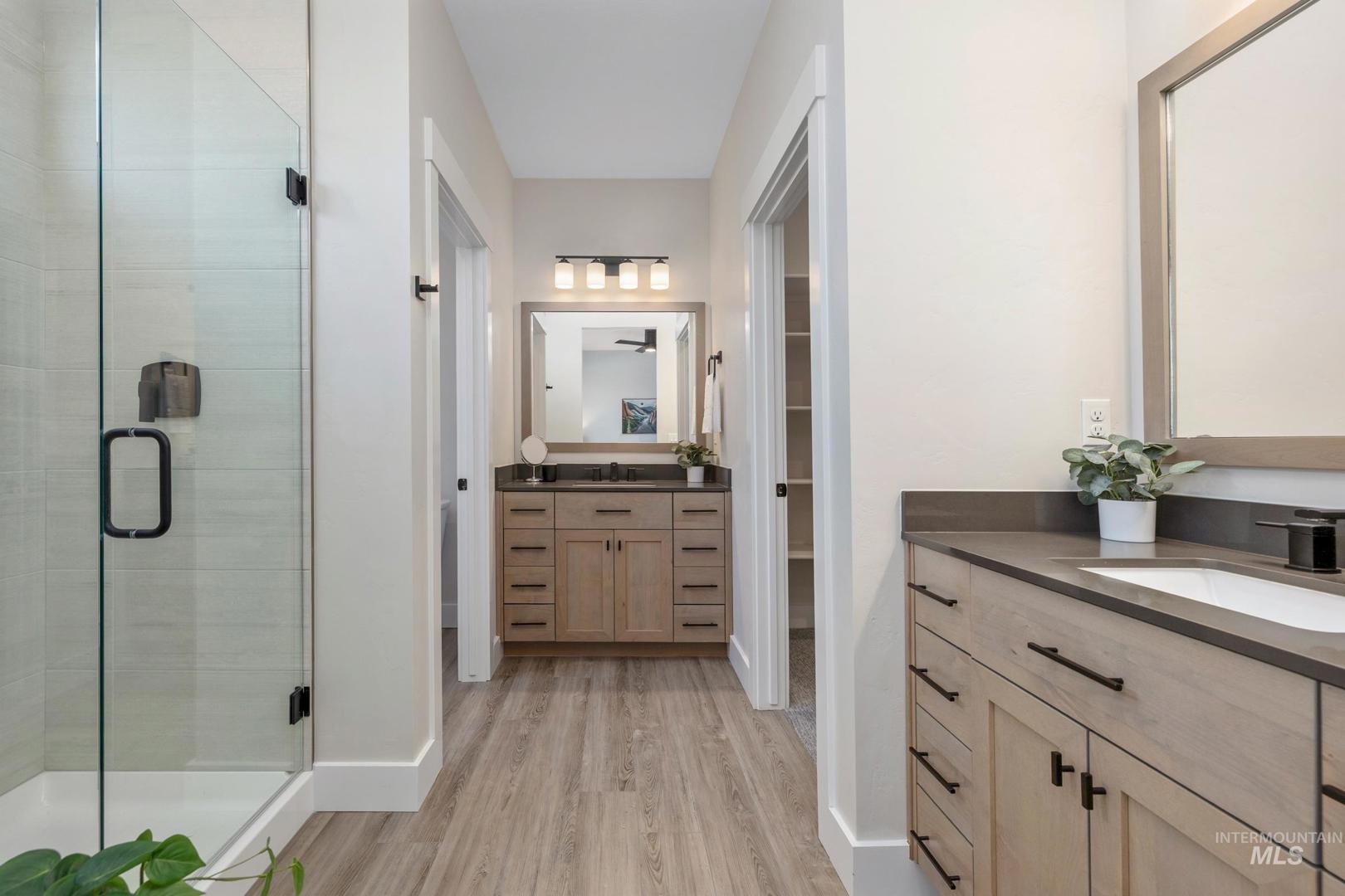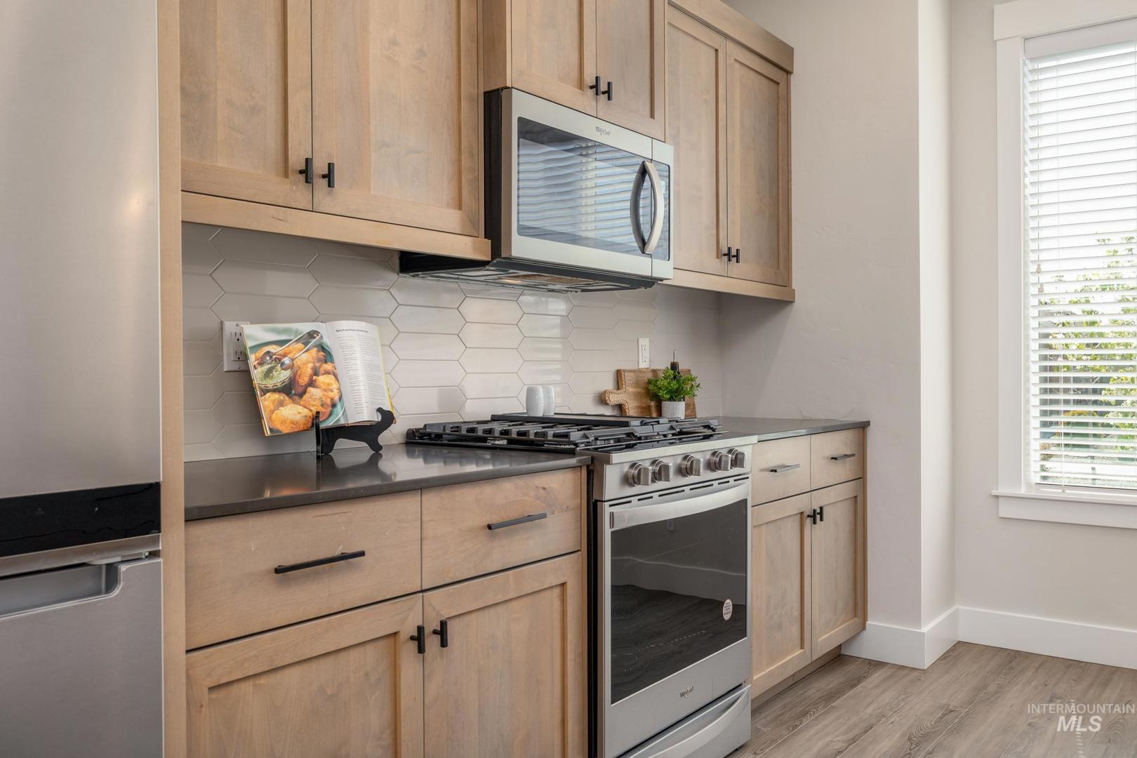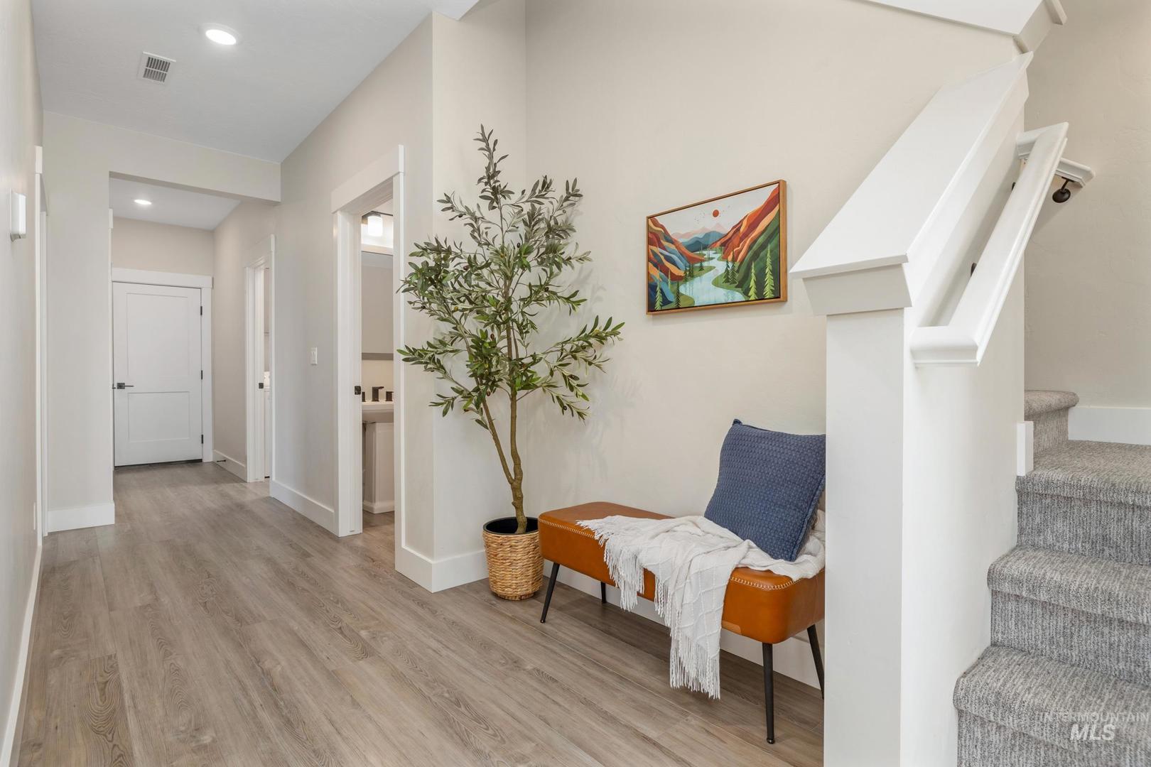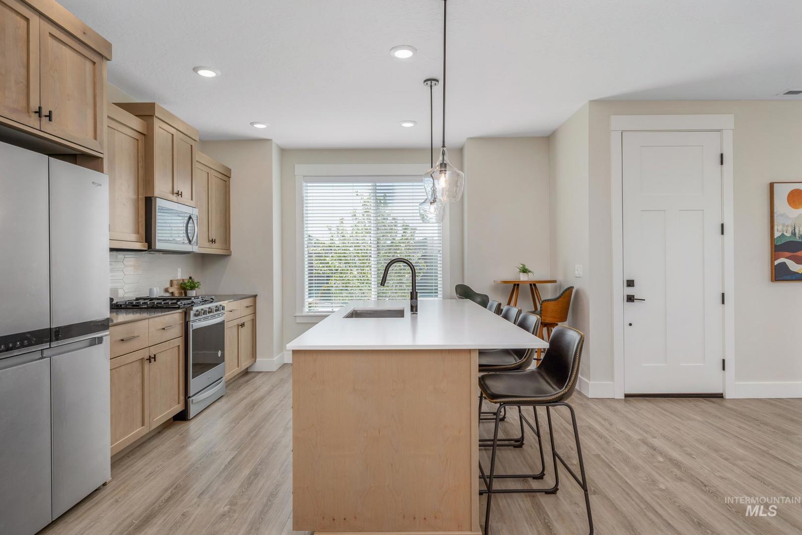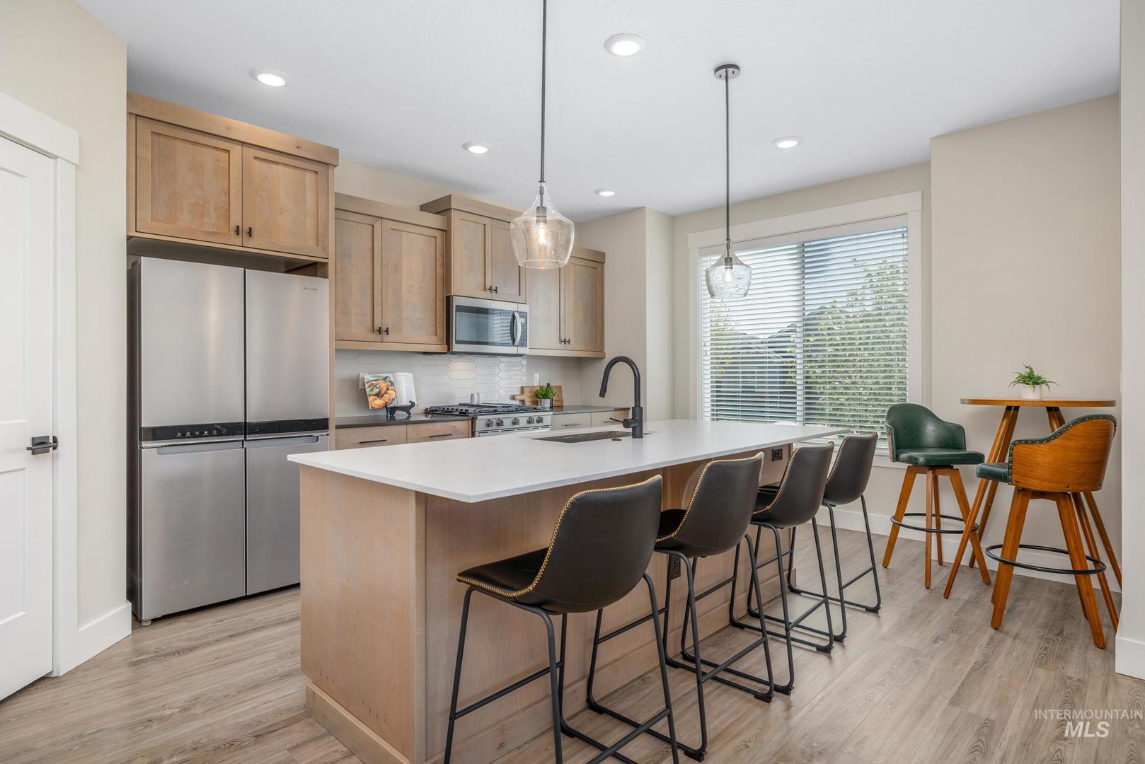 Better than new, this end-unit townhome in Avimor offers privacy, thoughtful upgrades, and an ideal layout. The main level features open-concept living with a family room and electric fireplace that opens to a private patio. The kitchen is designed for both function and style with quartz countertops, stainless steel appliances, island with breakfast bar & pantry. The main-level primary suite includes dual vanities, tile shower & walk-in closet. A half bath & laundry room complete the main floor. Upstairs, enjoy a generous bonus room or loft, two additional bedrooms, and a full guest bath. The oversized two-car garage offers extra space on both sides for storage or flexibility. Located in the heart of Avimor, this home provides access to a truly unmatched lifestyle with the outdoor pool just 0.2 miles away, plus community center featuring an indoor pool, fitness center, library, meeting spaces & year-round events. Residents enjoy over 100 miles of hiking/biking trails, parks, playgrounds, sports courts including tennis, pickleball, basketball, soccer fields, fishing pond & outdoor amphitheater. The community also offers a K–8 charter school and early learning center opening soon, along with the convenience of an on-site restaurant/brewery, coffee shop & gas station/market, creating a connected, amenity-rich lifestyle right at your doorstep.