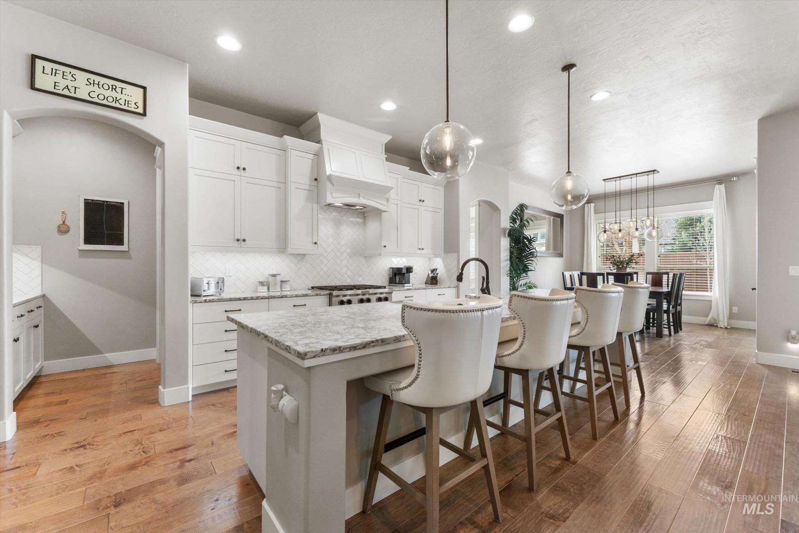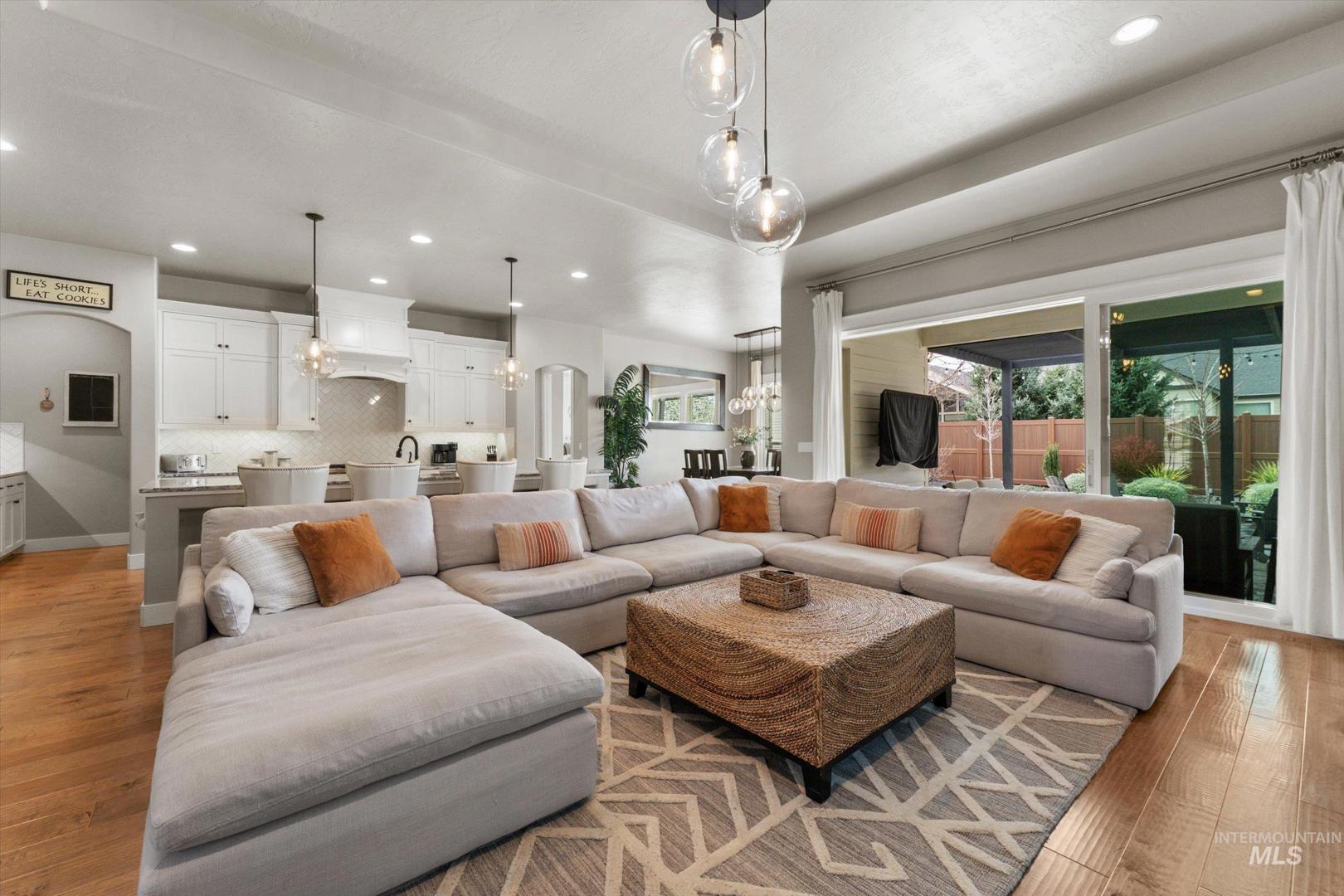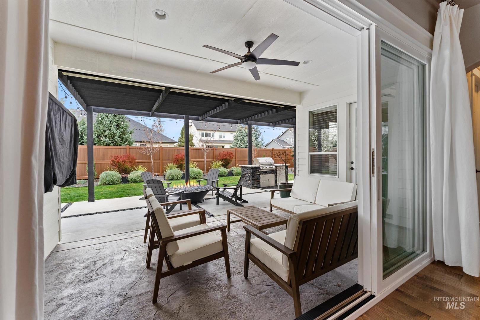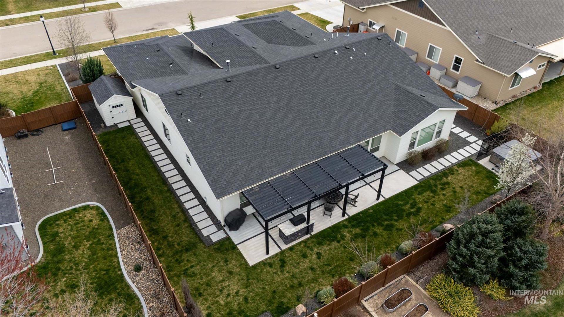A True Gem, this extraordinary, elegant home blends clean architectural design with expansive living and high-end amenities. Located in Lilac Springs along the highly desirable western corridor of Floating Feather in Eagle. A beautiful open floorplan with a split Bedroom design, 5 Bedrooms, 4.5 bathrooms & a designated office all on a single level! 4 bedrooms have private bathrooms and walk-in closets, one which is a 2nd primary suite, 5th Bedroom is currently used as a gym. Engineered hard wood and new carpet throughout the home. Kitchen features quartz counter tops, KitchenAid appliances, designated beverage bar, and generous pantry. The primary suite is a spa-like retreat, with quartz counter tops, tiled floors, walk-in shower & a stand-alone soaking tub. This home is ideal for multi-generational living and with over $90,000 in landscaping & hardscaping this is an entertainer`s delight. Backyard & Patio feature custom pergola, built in gas fire pit, built in gas grill, patio TV and large shed. The home has storage galore, with 7 closets in addition to the 5-bedroom closets, including a 2nd pantry in laundry room. Spacious 4 car garage provides extra space for recreational equipment & outdoor toys. Relax and enjoy the community pool and have fun on the Pickleball & Tennis Courts!