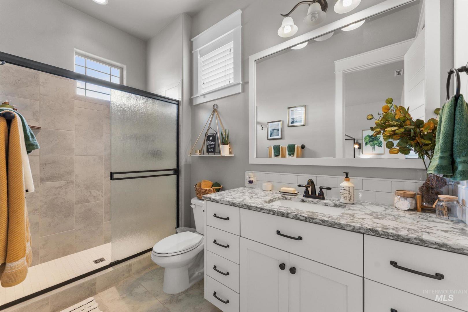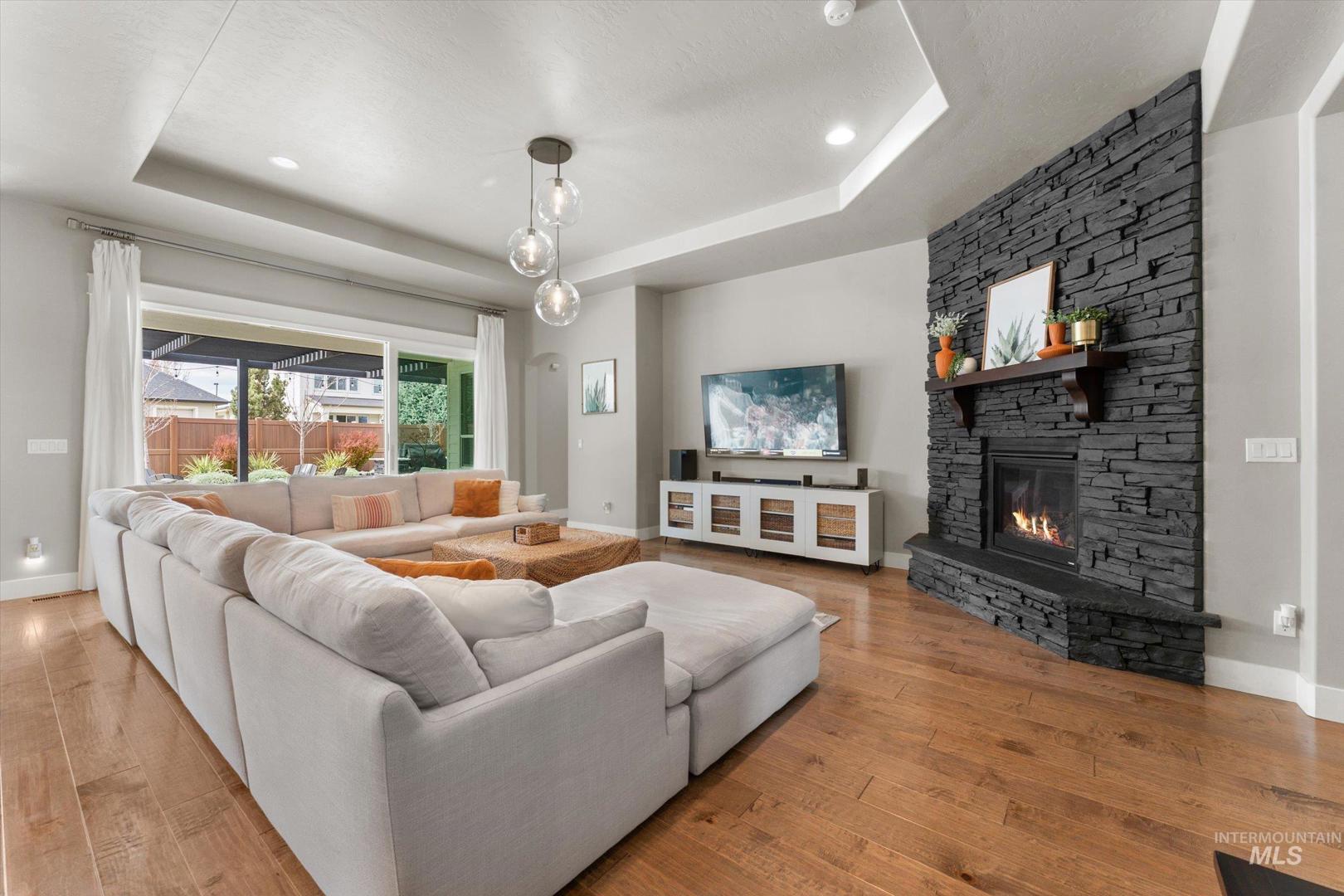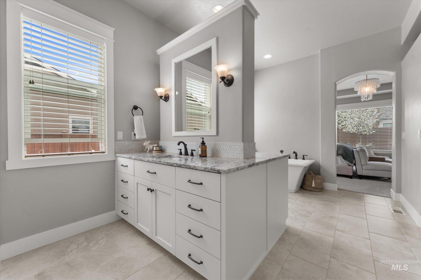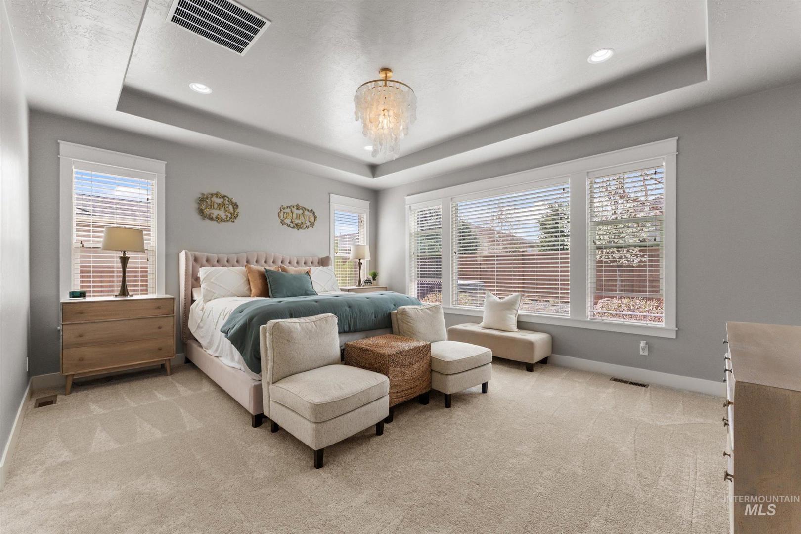 A True Gem, this extraordinary, elegant home blends clean architectural design with expansive living and high-end amenities. Located in Lilac Springs along the highly desirable western corridor of Floating Feather in Eagle. A beautiful open floorplan with a split Bedroom design, 5 Bedrooms, 4.5 bathrooms & a designated office all on a single level! 4 bedrooms have private bathrooms and walk-in closets, one which is a 2nd primary suite, 5th Bedroom is currently used as a gym. Engineered hard wood and new carpet throughout the home. Kitchen features quartz counter tops, KitchenAid appliances, designated beverage bar, and generous pantry. The primary suite is a spa-like retreat, with quartz counter tops, tiled floors, walk-in shower & a stand-alone soaking tub. This home is ideal for multi-generational living and with over $90,000 in landscaping & hardscaping this is an entertainer`s delight. Backyard & Patio feature custom pergola, built in gas fire pit, built in gas grill, patio TV and large shed. The home has storage galore, with 7 closets in addition to the 5-bedroom closets, including a 2nd pantry in laundry room. Spacious 4 car garage provides extra space for recreational equipment & outdoor toys. Relax and enjoy the community pool and have fun on the Pickleball & Tennis Courts!