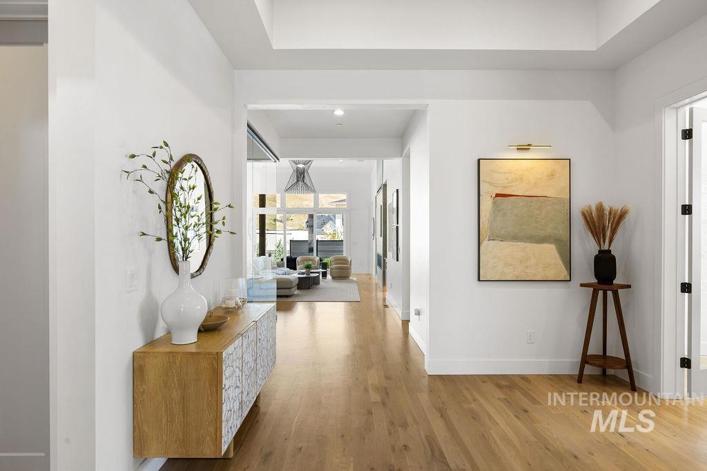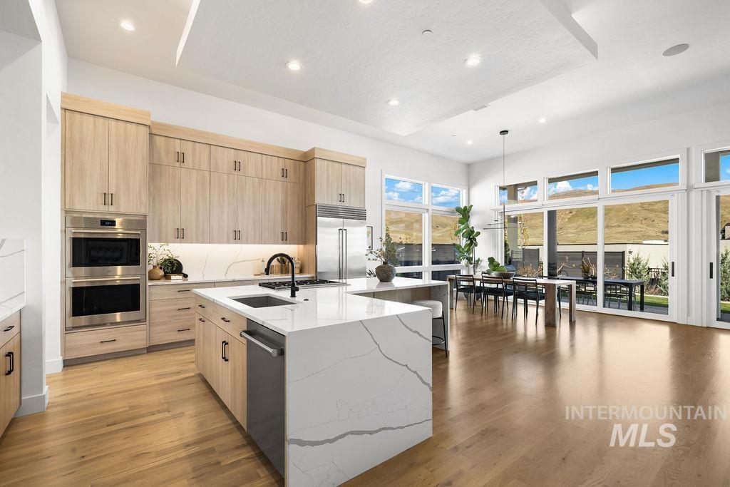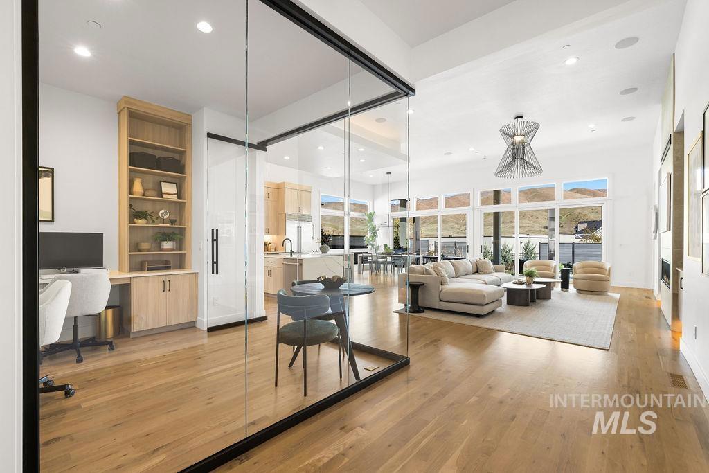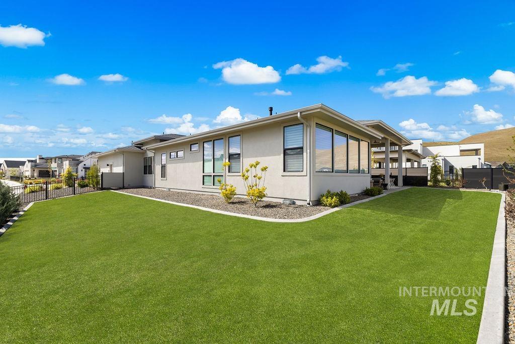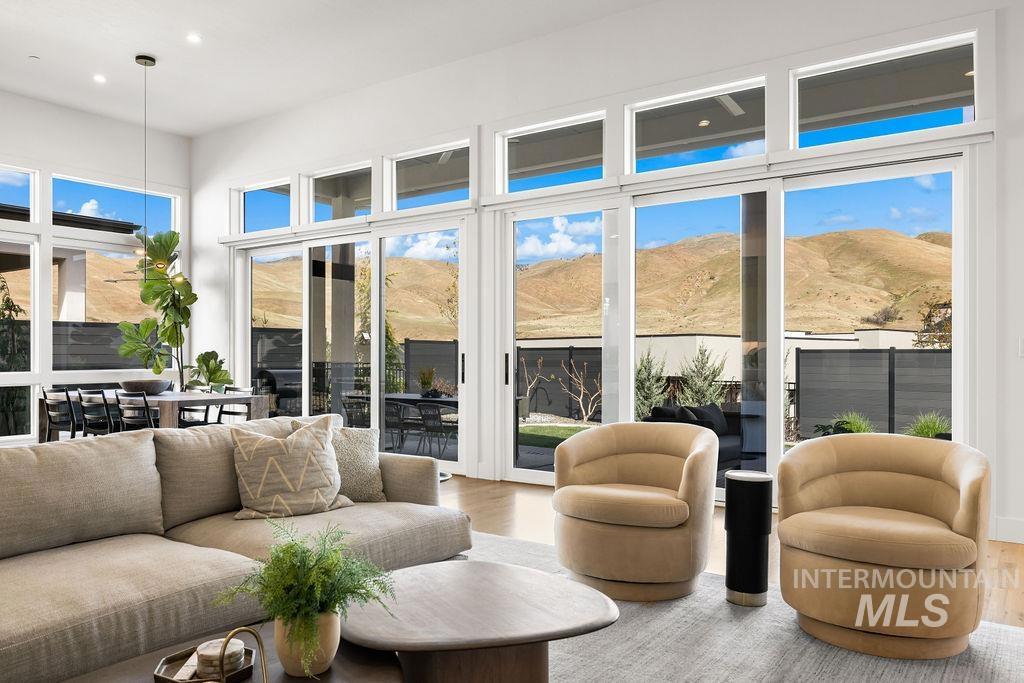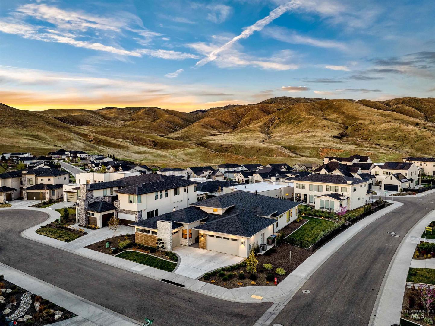 Nestled in Harris North’s Pinnacle neighborhood in the scenic East Boise Foothills, this better-than-new luxury single-level home showcases designer upgrades and finishes throughout. Enjoy breathtaking surroundings with easy access to foothills trails, Boise River and Greenbelt, Warm Springs Golf Course, numerous parks, and nearby eateries in Harris Ranch and Bown Crossing. The thoughtfully designed floorplan offers an expansive great room with a stunning fireplace wall, multi-slide doors opening to a spacious covered patio, and surround sound - ideal for entertaining. Two dedicated offices include a glass-enclosed workspace with built-ins (perfect homework station), and a desirable split bedroom layout, all with walk-in closets. The private primary features a spa-like ensuite and his/hers closet space that connects to a convenient laundry room. The chef’s kitchen is equipped with Wolf and Sub-Zero appliances, butler’s pantry, and large walk-in pantry. The true three-car garage includes an expanded double garage with epoxy floors, built-in cabinetry, slat walls, and workbench. Additional features include custom Hunter Douglas shades, EERO wifi system, fire sprinkler system, water softener and filter, and AV system. Corner lot on nearly ~1/3 acres is fully fenced with landscape enhancements. Zoned for top Boise schools!