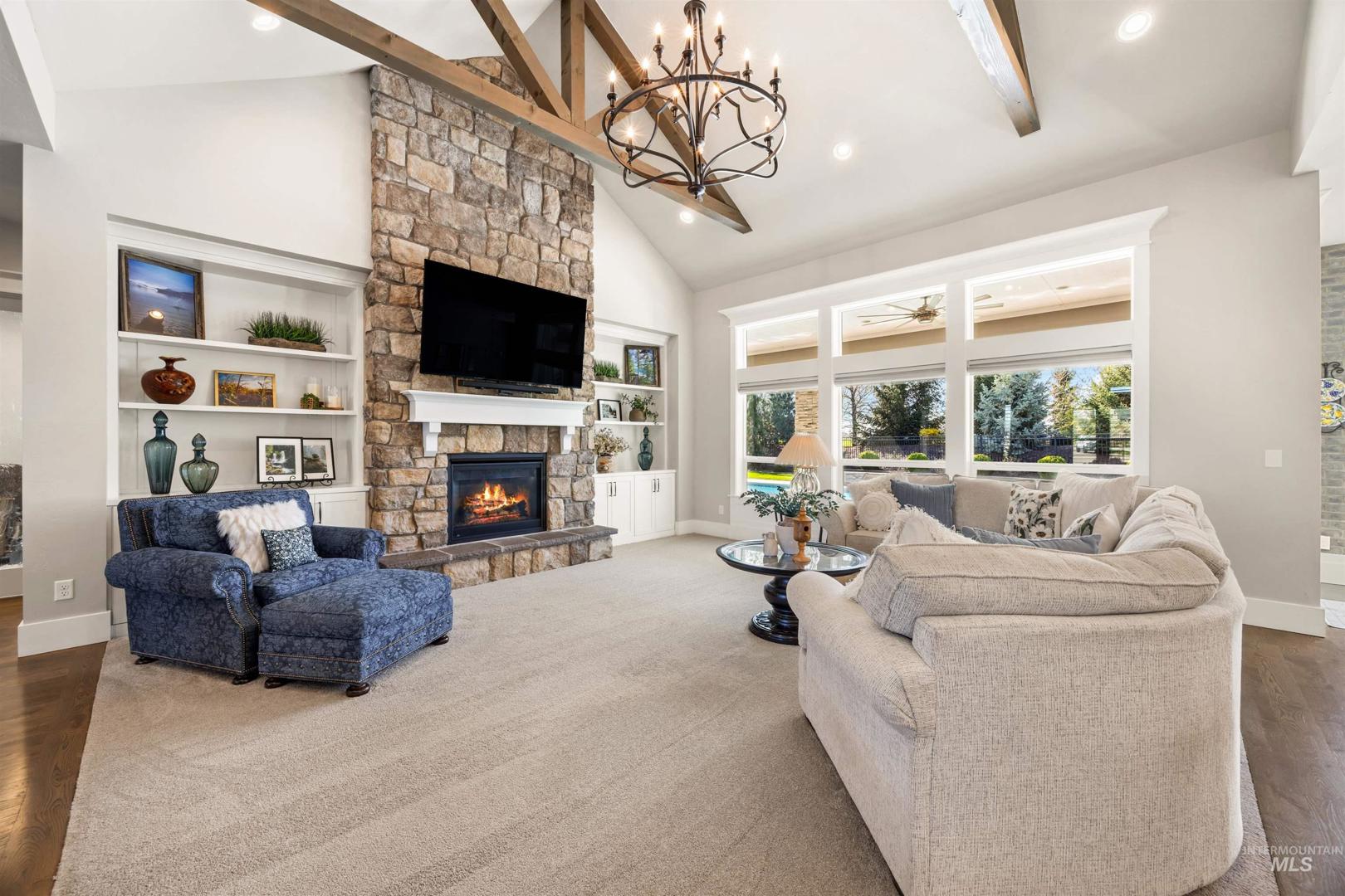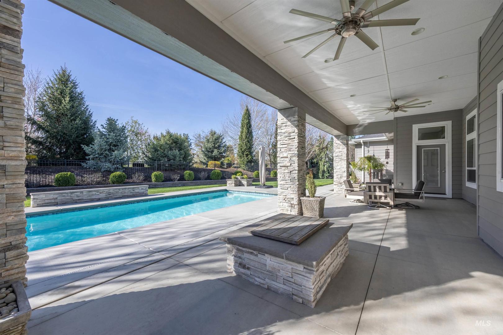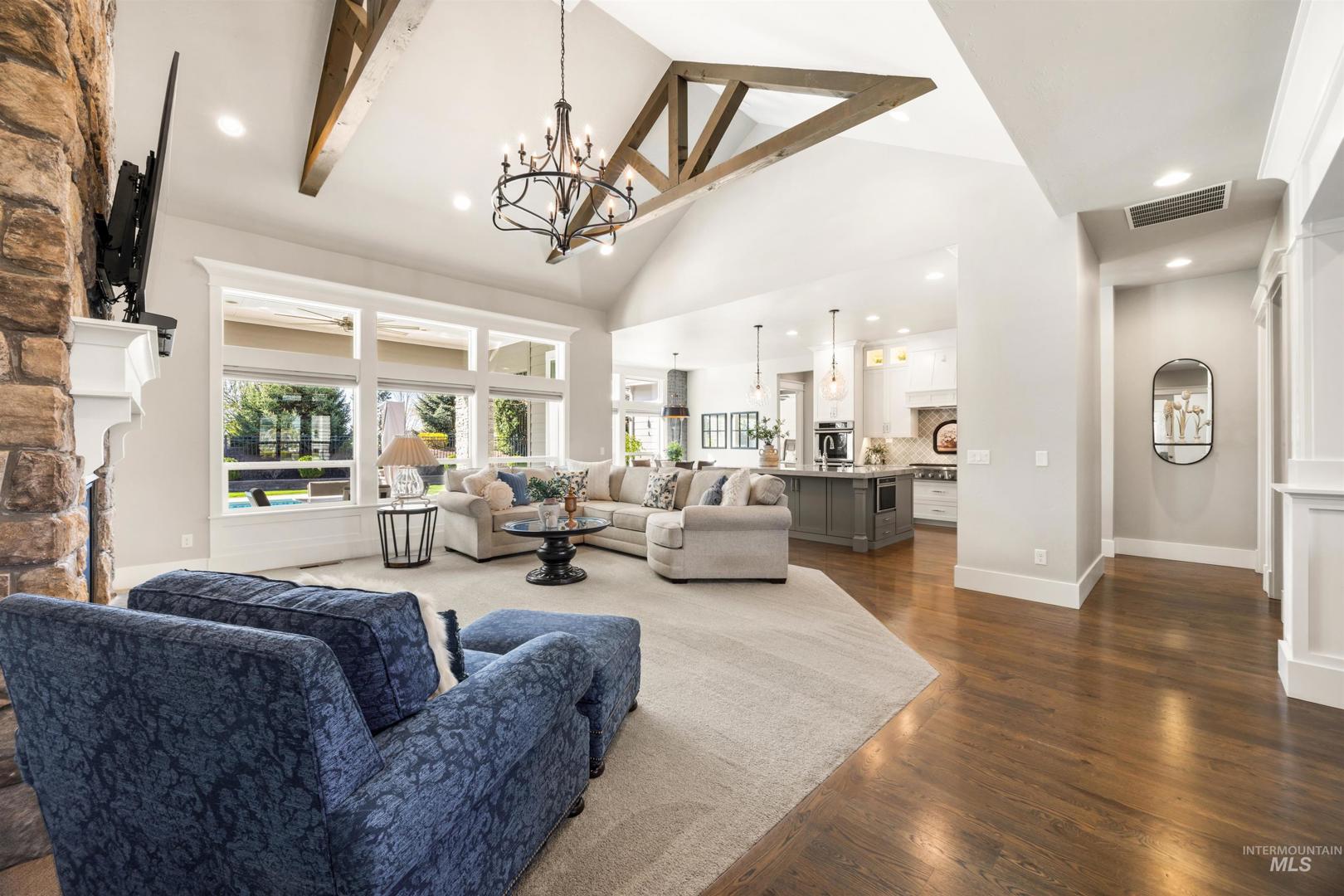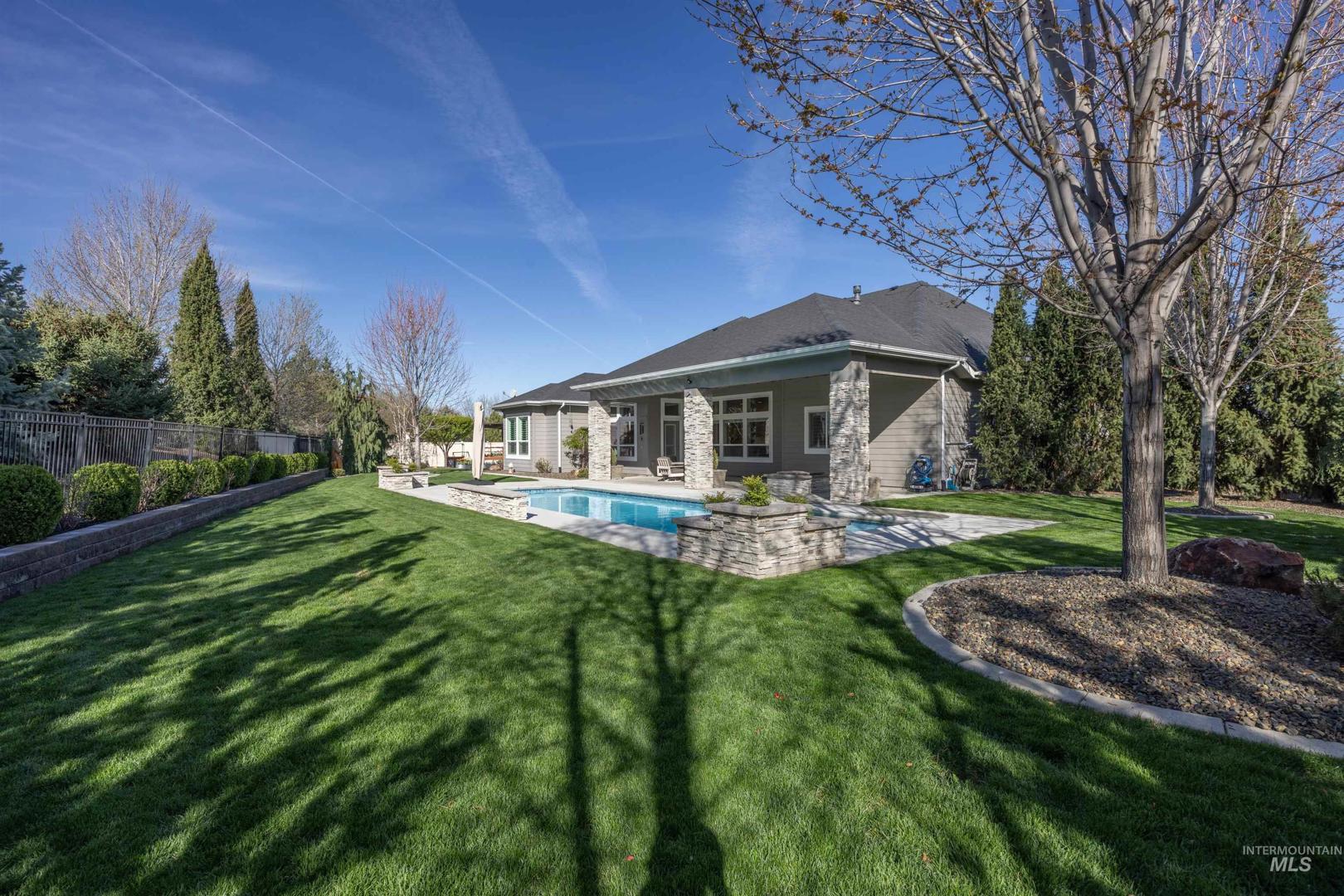 Welcome to one of the most sought after home designs by this renowned local builder - James Clyde Homes! This is your opportunity to own the “Claire Eliza” offered by the original owners. Located on a quiet cul-de-sac in Eagle’s Syringa community, this thoughtfully designed home offers high-end finishes and functional upgrades throughout. The main living area features tall ceilings with exposed beams, a gas stone fireplace, and built-in shelving that adds both character and storage. The kitchen is equipped with Thermador appliances, including double ovens, quartz countertops, a breakfast bar, a walk-in pantry with appliance shelf, and built-in spice storage designed for convenience and organization. Outdoor living is a standout feature, highlighted by a 14x40 pool, garden space, greenhouse, and built-in storage shed. The private backyard setting includes no rear neighbors, creating a rare sense of space and seclusion. Additional features include a garage garage that is heated and air conditioned, wiring for a portable generator, and a sprinkler system with drip irrigation. The home is also plumbed for central vacuum and includes a water softener system. Situated in Eagle, this home offers convenient access to nearby schools, parks, and local amenities while maintaining a quiet residential feel. BTVAI