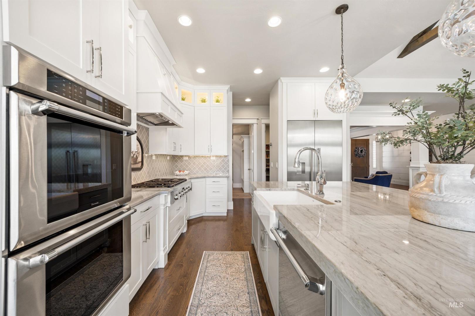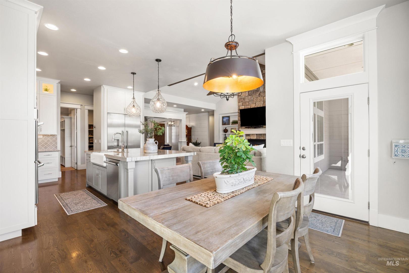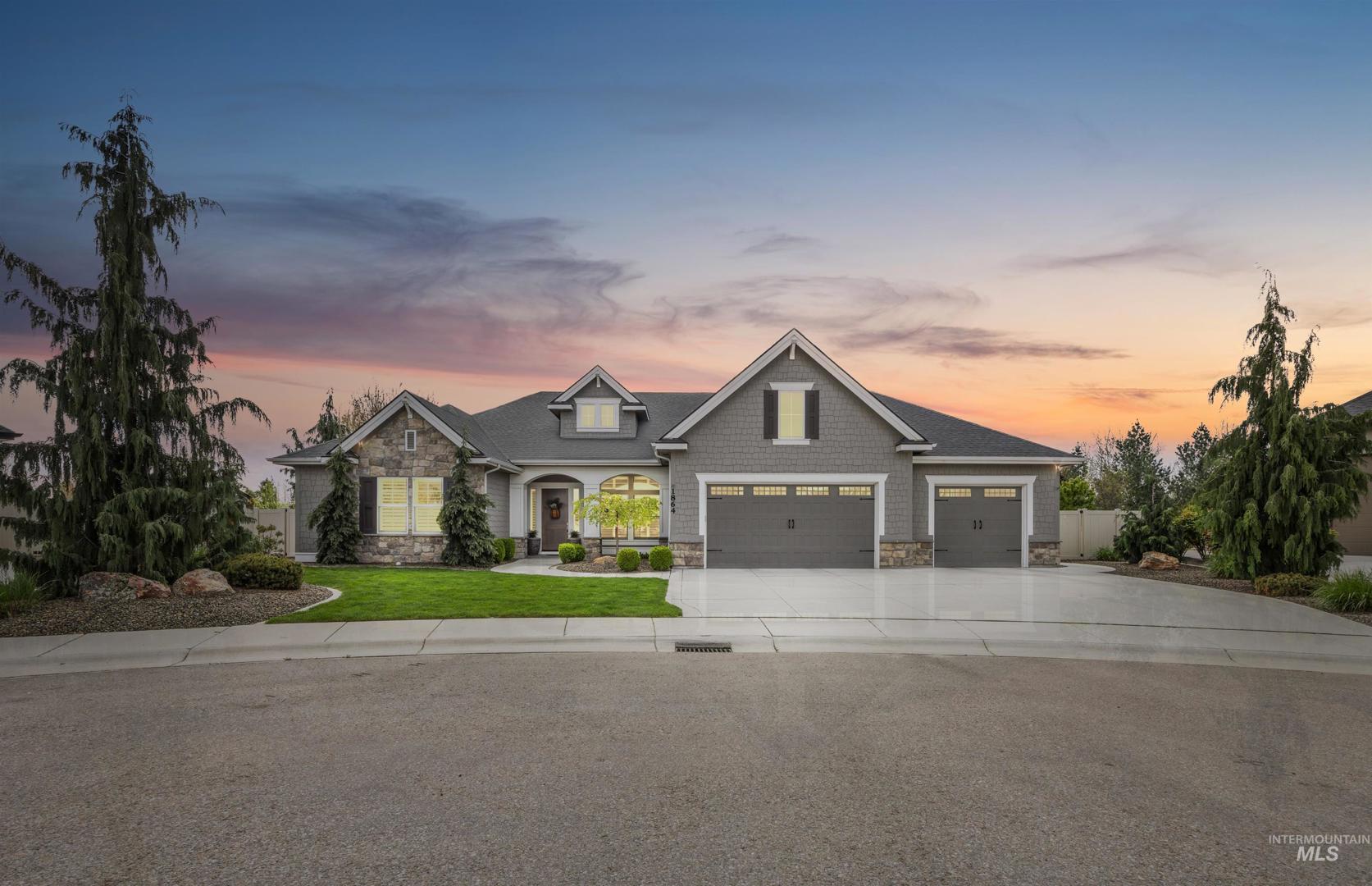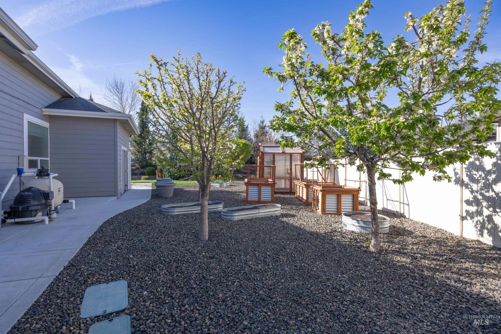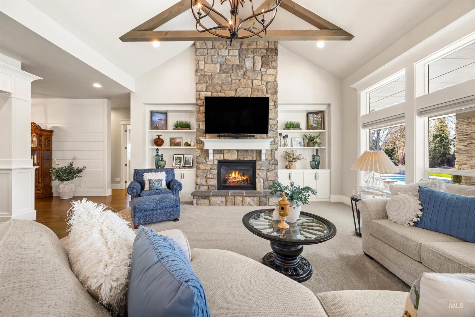 Welcome to one of the most sought after home designs by this renowned local builder - James Clyde Homes! This is your opportunity to own the “Claire Eliza” offered by the original owners. Located on a quiet cul-de-sac in Eagle’s Syringa community, this thoughtfully designed home offers high-end finishes and functional upgrades throughout. The main living area features tall ceilings with exposed beams, a gas stone fireplace, and built-in shelving that adds both character and storage. The kitchen is equipped with Thermador appliances, including double ovens, quartz countertops, a breakfast bar, a walk-in pantry with appliance shelf, and built-in spice storage designed for convenience and organization. Outdoor living is a standout feature, highlighted by a 14x40 pool, garden space, greenhouse, and built-in storage shed. The private backyard setting includes no rear neighbors, creating a rare sense of space and seclusion. Additional features include a garage garage that is heated and air conditioned, wiring for a portable generator, and a sprinkler system with drip irrigation. The home is also plumbed for central vacuum and includes a water softener system. Situated in Eagle, this home offers convenient access to nearby schools, parks, and local amenities while maintaining a quiet residential feel. BTVAI