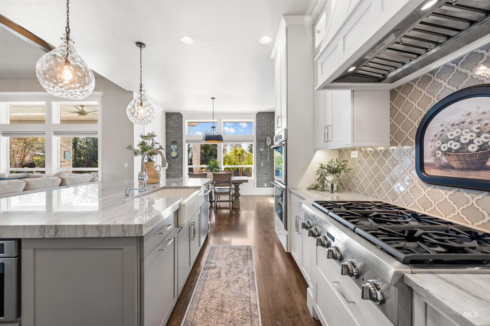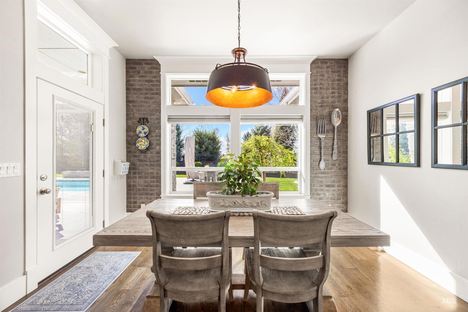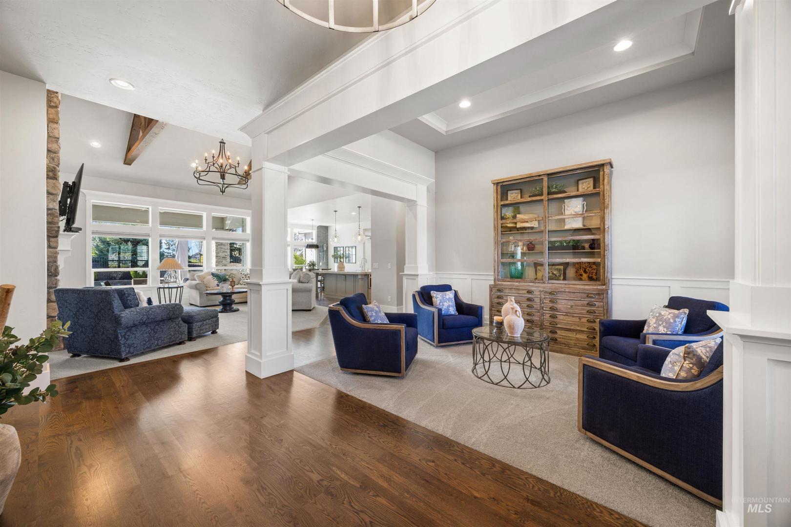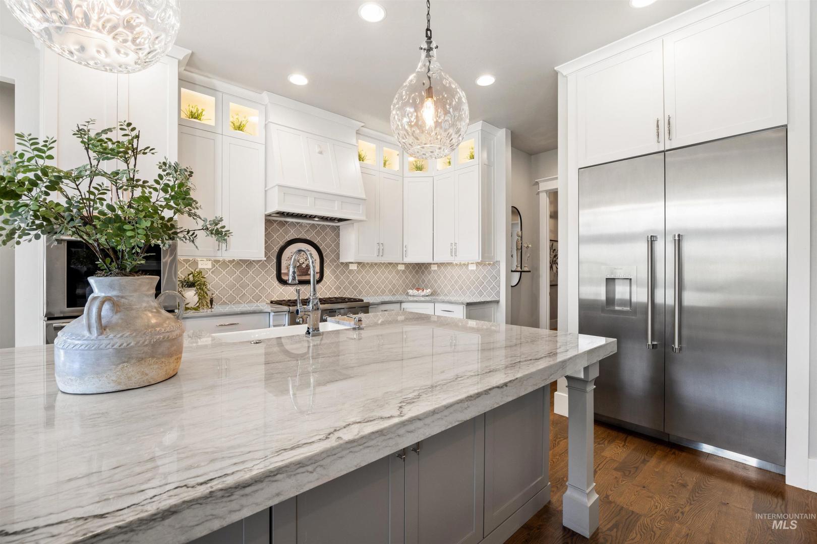 Welcome to one of the most sought after home designs by this renowned local builder - James Clyde Homes! This is your opportunity to own the “Claire Eliza” offered by the original owners. Located on a quiet cul-de-sac in Eagle’s Syringa community, this thoughtfully designed home offers high-end finishes and functional upgrades throughout. The main living area features tall ceilings with exposed beams, a gas stone fireplace, and built-in shelving that adds both character and storage. The kitchen is equipped with Thermador appliances, including double ovens, quartz countertops, a breakfast bar, a walk-in pantry with appliance shelf, and built-in spice storage designed for convenience and organization. Outdoor living is a standout feature, highlighted by a 14x40 pool, garden space, greenhouse, and built-in storage shed. The private backyard setting includes no rear neighbors, creating a rare sense of space and seclusion. Additional features include a garage garage that is heated and air conditioned, wiring for a portable generator, and a sprinkler system with drip irrigation. The home is also plumbed for central vacuum and includes a water softener system. Situated in Eagle, this home offers convenient access to nearby schools, parks, and local amenities while maintaining a quiet residential feel. BTVAI