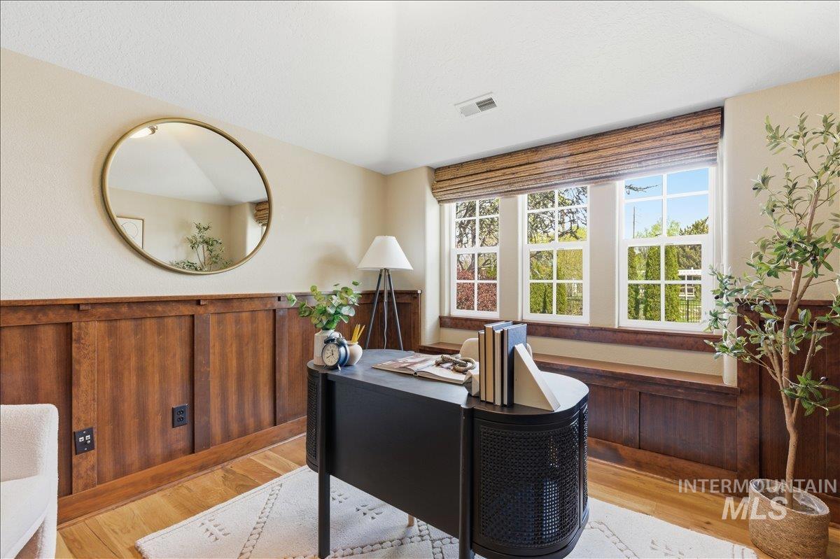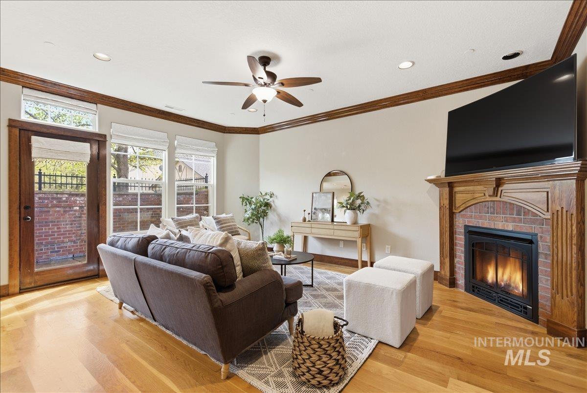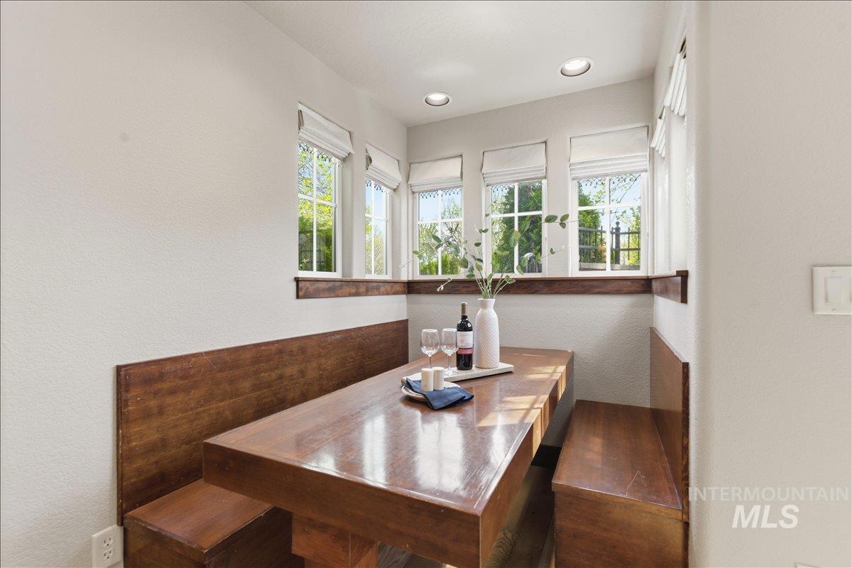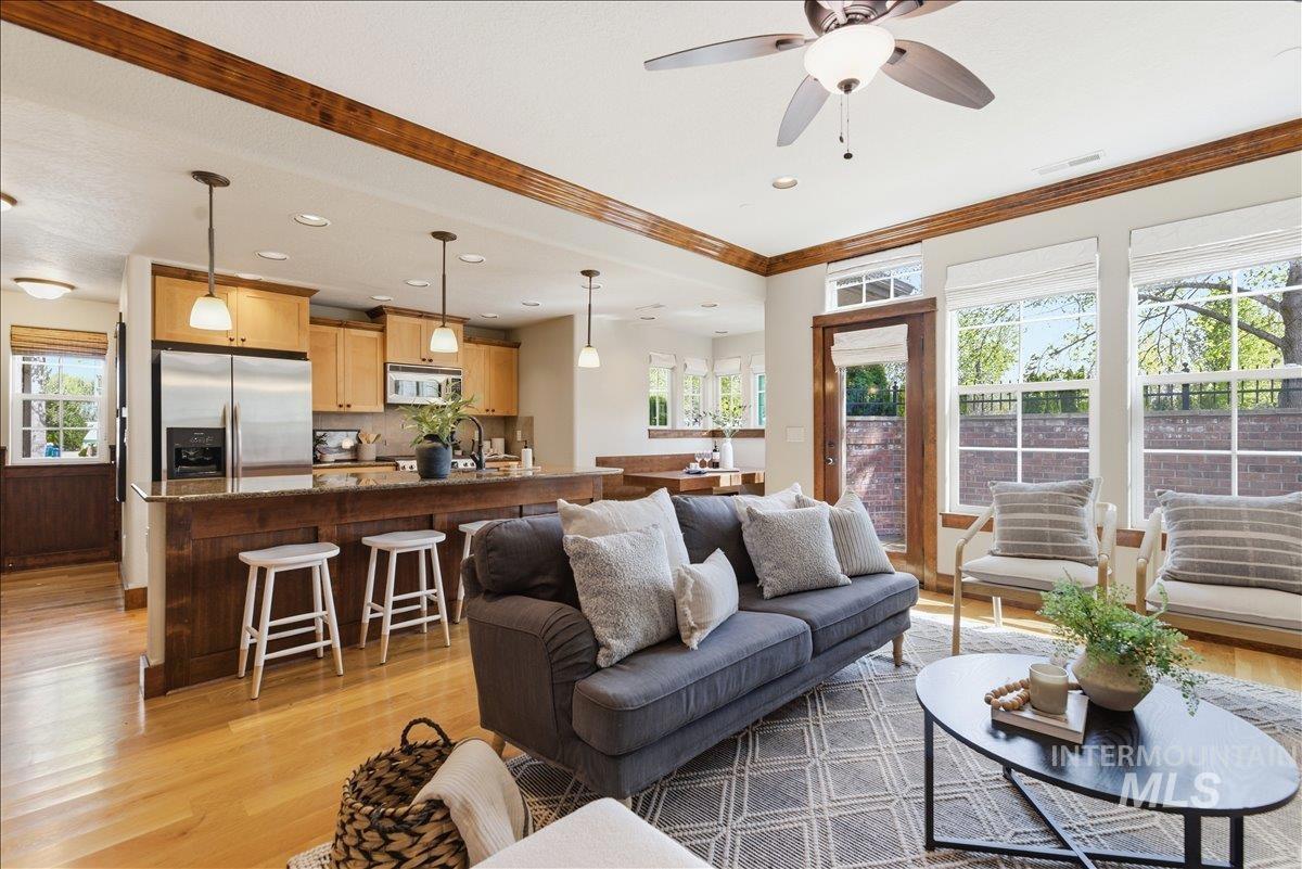 Experience refined living in the heart of Eagle with this impeccably maintained residence in one of downtown’s most sought-after communities. Thoughtfully designed, this elegant home offers 2 bedrooms, 2.5 baths, and a versatile main-level den/office, blending comfort with sophisticated style. The light-filled interior showcases quality craftsmanship, featuring hardwood flooring, granite surfaces, and a well-appointed kitchen with an island and seamless flow into the inviting great room—perfect for both everyday living and entertaining. Upstairs, the private primary suite provides a serene retreat with a spacious layout and en-suite bath. Step outside to a charming, east-facing patio designed for quiet mornings and intimate evenings. With low-maintenance living and an attached two-car garage, this home offers true lock-and-leave convenience. Ideally located just moments from boutique shopping, dining, and the scenic Boise River Greenbelt, this is an exceptional opportunity to enjoy the best of Eagle’s vibrant lifestyle.