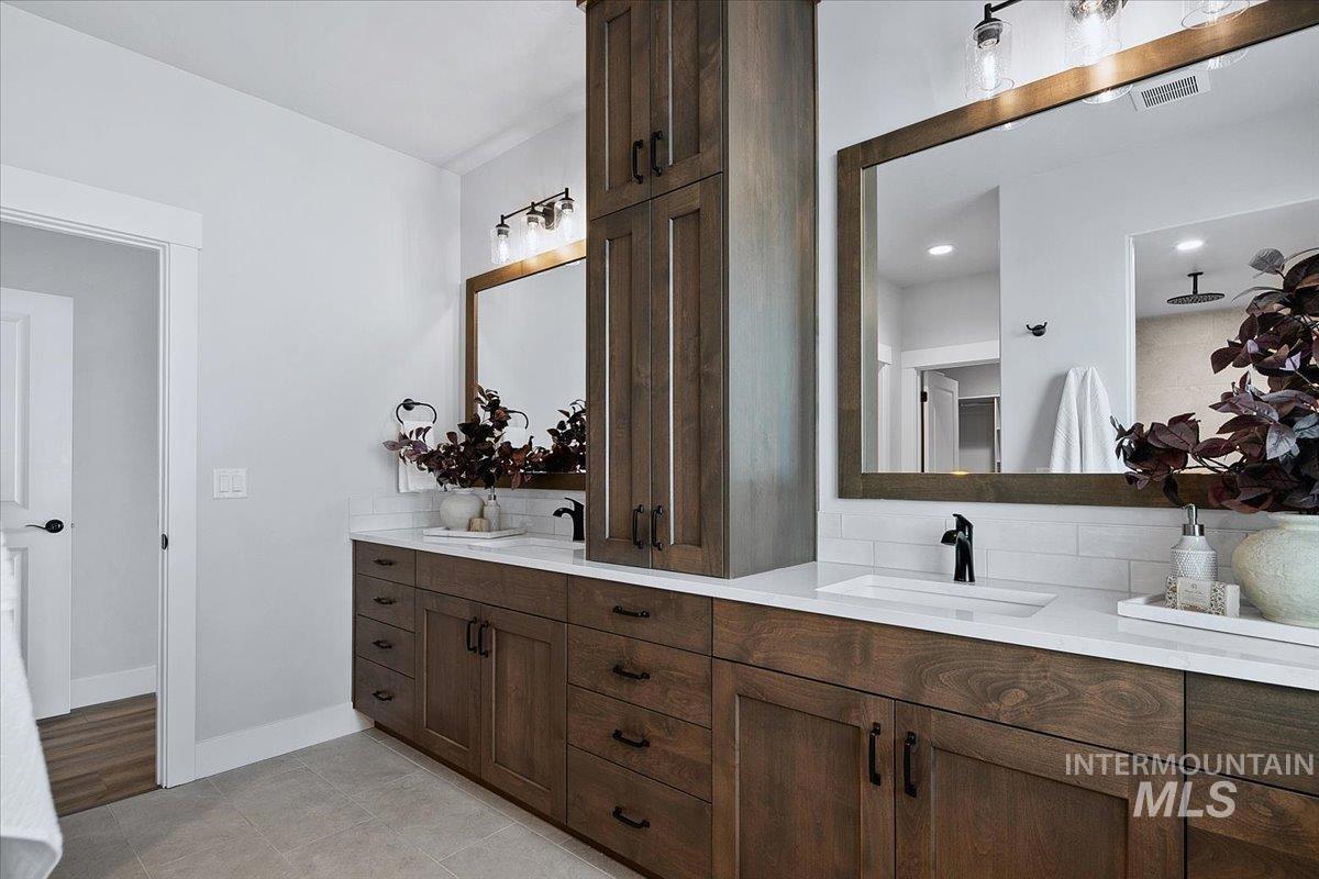 Experience high-end, single-level living in The Estates at Pristine Springs. Built by Tresidio Homes, this Hampton floor plan showcases a versatile layout featuring a dedicated office, a spacious bonus room, and an open-concept great room accented by a beamed tray ceiling and a linear gas fireplace. Perfect for multi-generational living, every bedroom in this home is en suite and features its own walk-in closet. The gourmet kitchen is designed for functionality and style with quartz countertops, stainless double ovens, and a 5-burner gas cooktop. Custom touches include soft-close cabinetry, a walk-in pantry, and a spice drawer, all centered around a large island. Durable LVP flooring flows throughout, leading to a thoughtful primary suite with private patio access and a spa-like bathroom featuring a zero-threshold shower. The outdoor space is just as impressive, offering a covered patio, a fully fenced yard with a dog run, and a storage shed. Practicality meets luxury with a heated 4-car garage including a tandem bay, plus a double swing gate for side-yard parking. Positioned on a quiet street with no front neighbors and a canal buffer behind for added privacy, this home provides a serene retreat with easy access to the community pool, clubhouse, and local Star amenities.