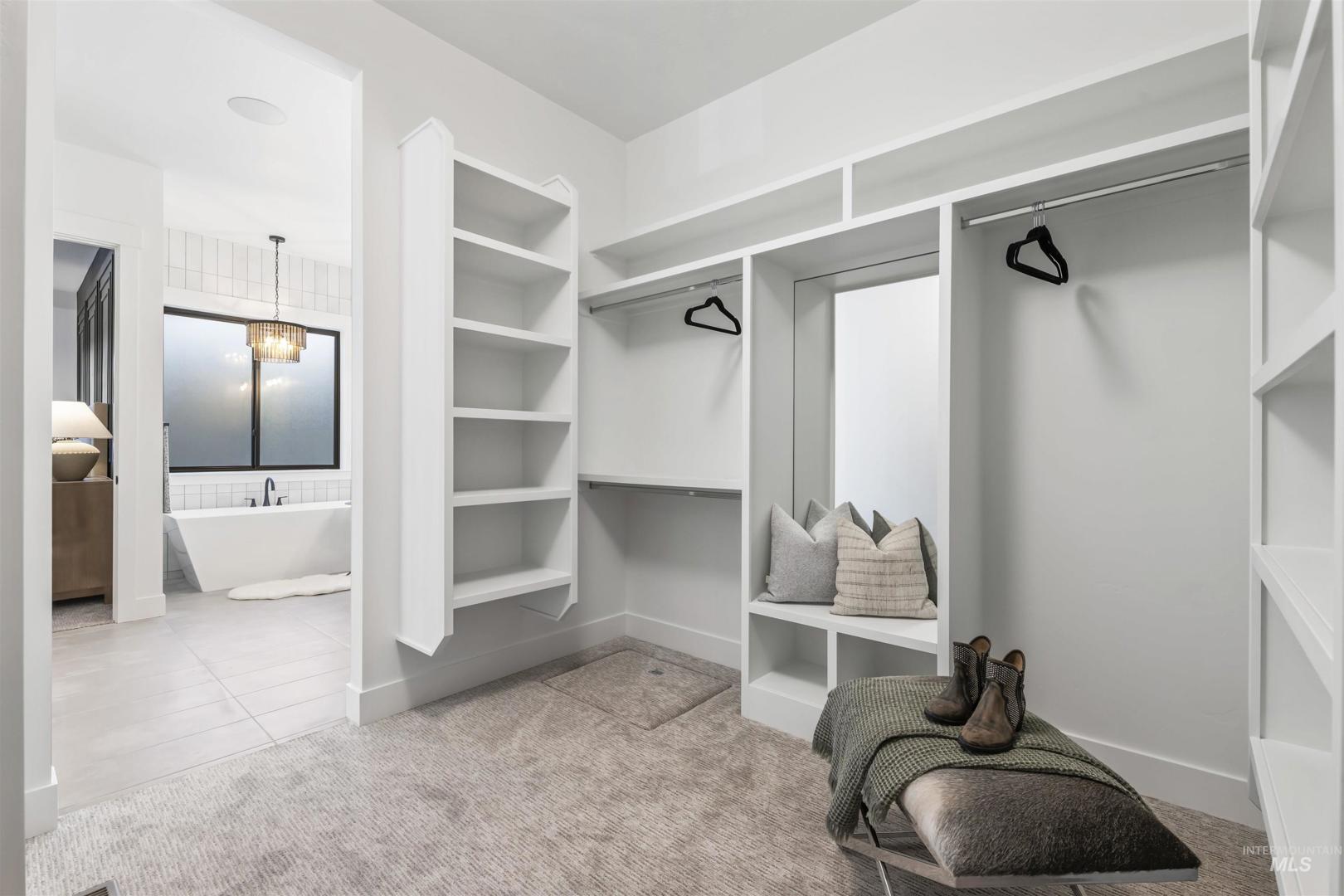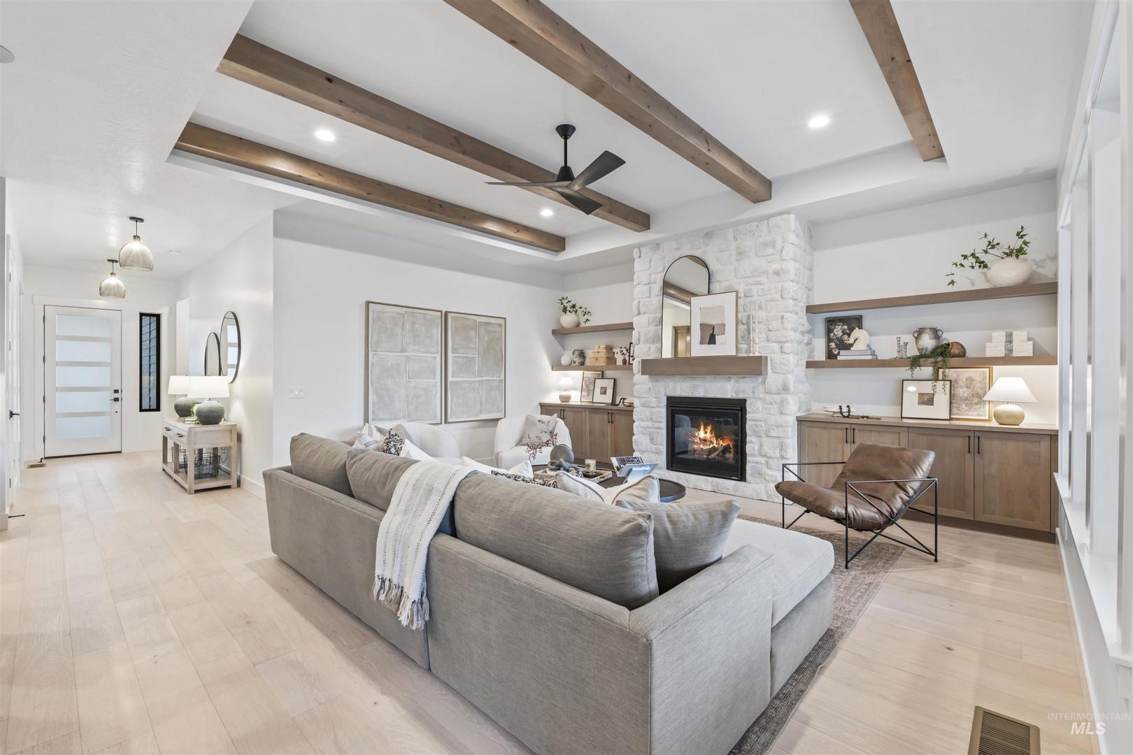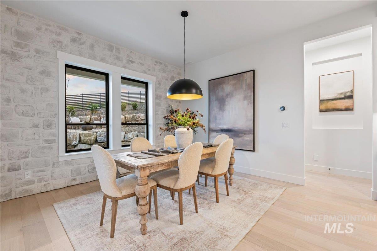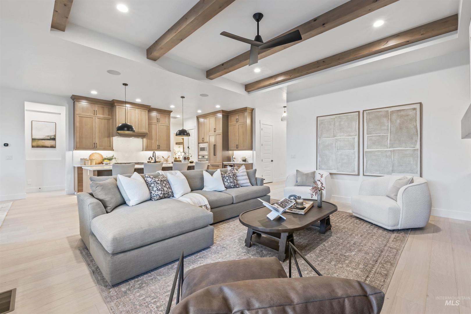 The Zachary Boat Bay by Brookstone Custom Homes is a spectacular new plan offering elevated living with a seamless blend of luxury design and everyday comfort. Soaring 11-foot ceilings, designer lighting, and custom craftsmanship create a warm, inviting atmosphere throughout. The gourmet kitchen is ideal for entertaining, featuring a 10-foot quartz island, premium Thermador appliances, cabinet-style refrigerator, double ovens, and a spacious walk-in pantry. A stylish bar area with beverage cooler complements the open-concept layout, flowing into a great room with wood-beamed ceilings, a floor-to-ceiling stone fireplace, and large Pella windows for abundant natural light. A dedicated home office with custom built-ins supports today’s work-from-home lifestyle. The private primary suite is a true retreat, showcasing exquisite carpentry and a spa-inspired bath with separate vanities, makeup counter, soaking tub, and an impressive 10-foot tiled shower. Each additional bedroom includes its own private ensuite, offering comfort and privacy throughout. Designed for both function and lifestyle, the home also features a side-entry garage and separate RV garage with pull-through access. The fully fenced backyard is elegantly landscaped with an extended patio and fire pit area. Located in Valnova in Eagle, Idaho, this home offers luxury living in a premier, amenity-rich community.