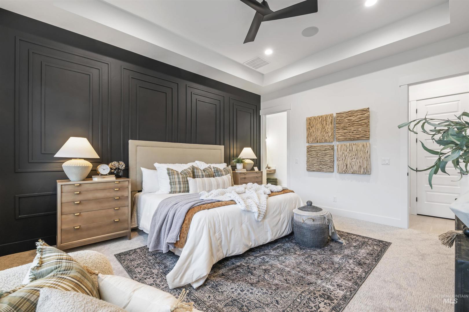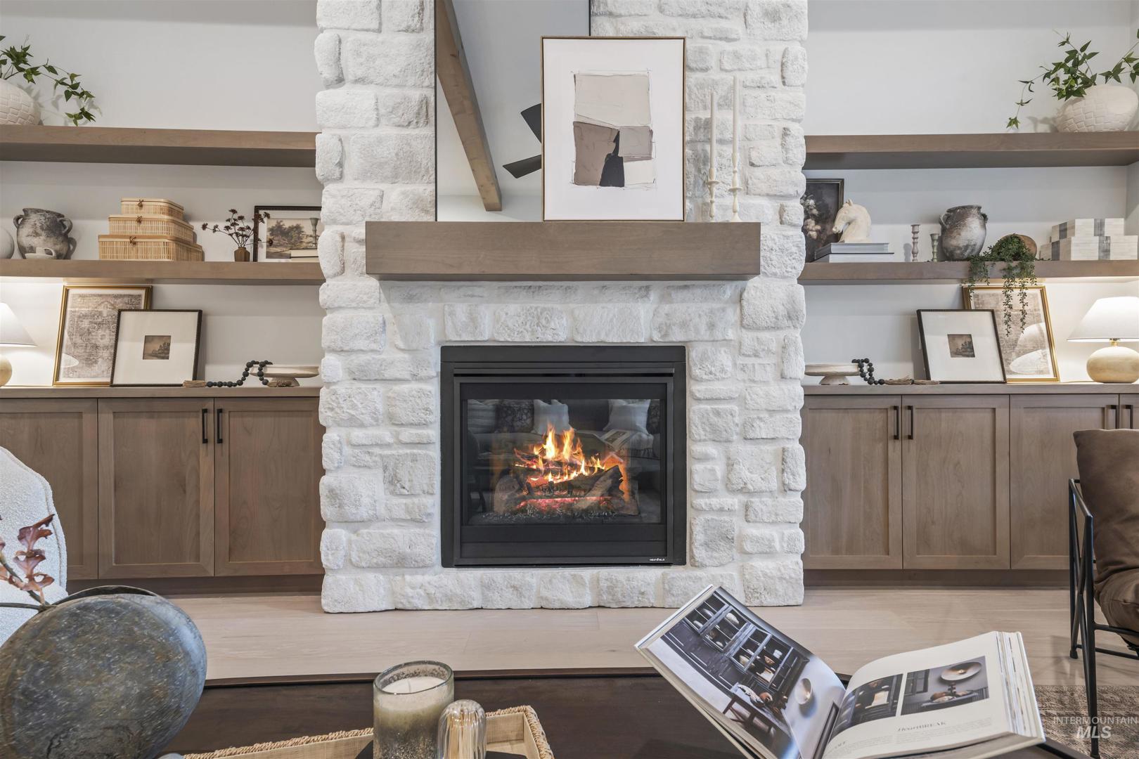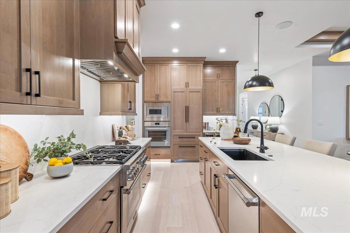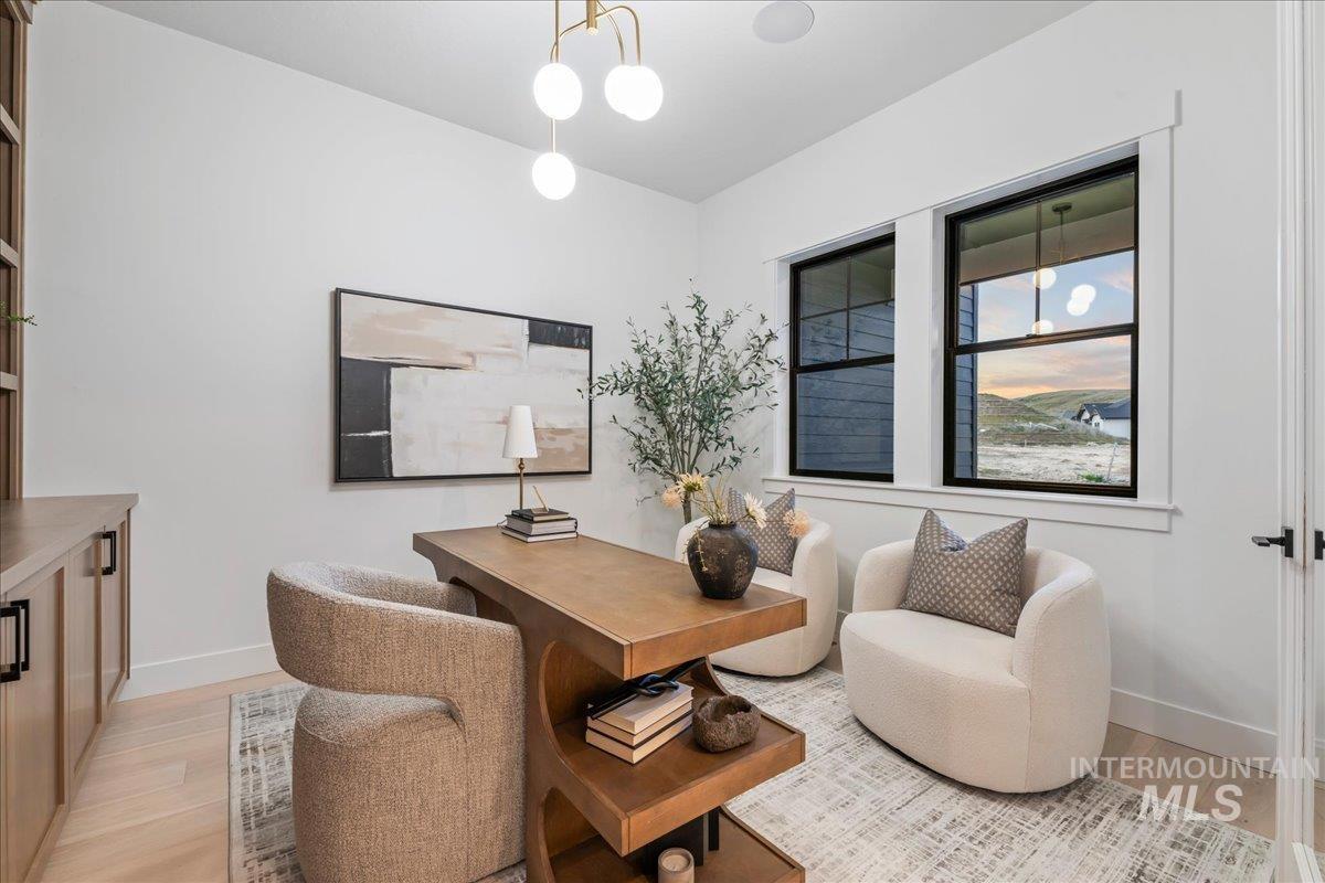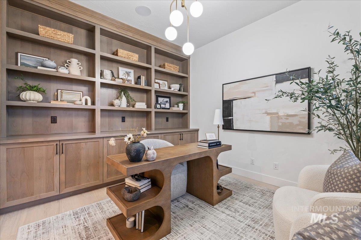 The Zachary Boat Bay by Brookstone Custom Homes is a spectacular new plan offering elevated living with a seamless blend of luxury design and everyday comfort. Soaring 11-foot ceilings, designer lighting, and custom craftsmanship create a warm, inviting atmosphere throughout. The gourmet kitchen is ideal for entertaining, featuring a 10-foot quartz island, premium Thermador appliances, cabinet-style refrigerator, double ovens, and a spacious walk-in pantry. A stylish bar area with beverage cooler complements the open-concept layout, flowing into a great room with wood-beamed ceilings, a floor-to-ceiling stone fireplace, and large Pella windows for abundant natural light. A dedicated home office with custom built-ins supports today’s work-from-home lifestyle. The private primary suite is a true retreat, showcasing exquisite carpentry and a spa-inspired bath with separate vanities, makeup counter, soaking tub, and an impressive 10-foot tiled shower. Each additional bedroom includes its own private ensuite, offering comfort and privacy throughout. Designed for both function and lifestyle, the home also features a side-entry garage and separate RV garage with pull-through access. The fully fenced backyard is elegantly landscaped with an extended patio and fire pit area. Located in Valnova in Eagle, Idaho, this home offers luxury living in a premier, amenity-rich community.