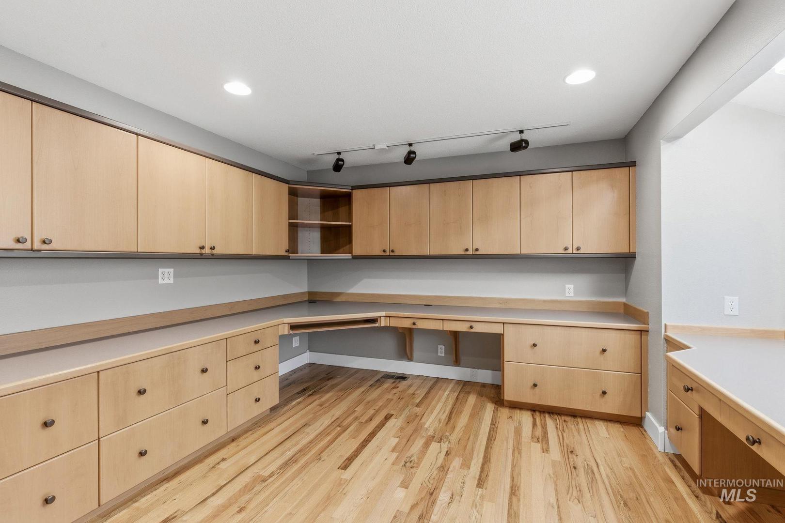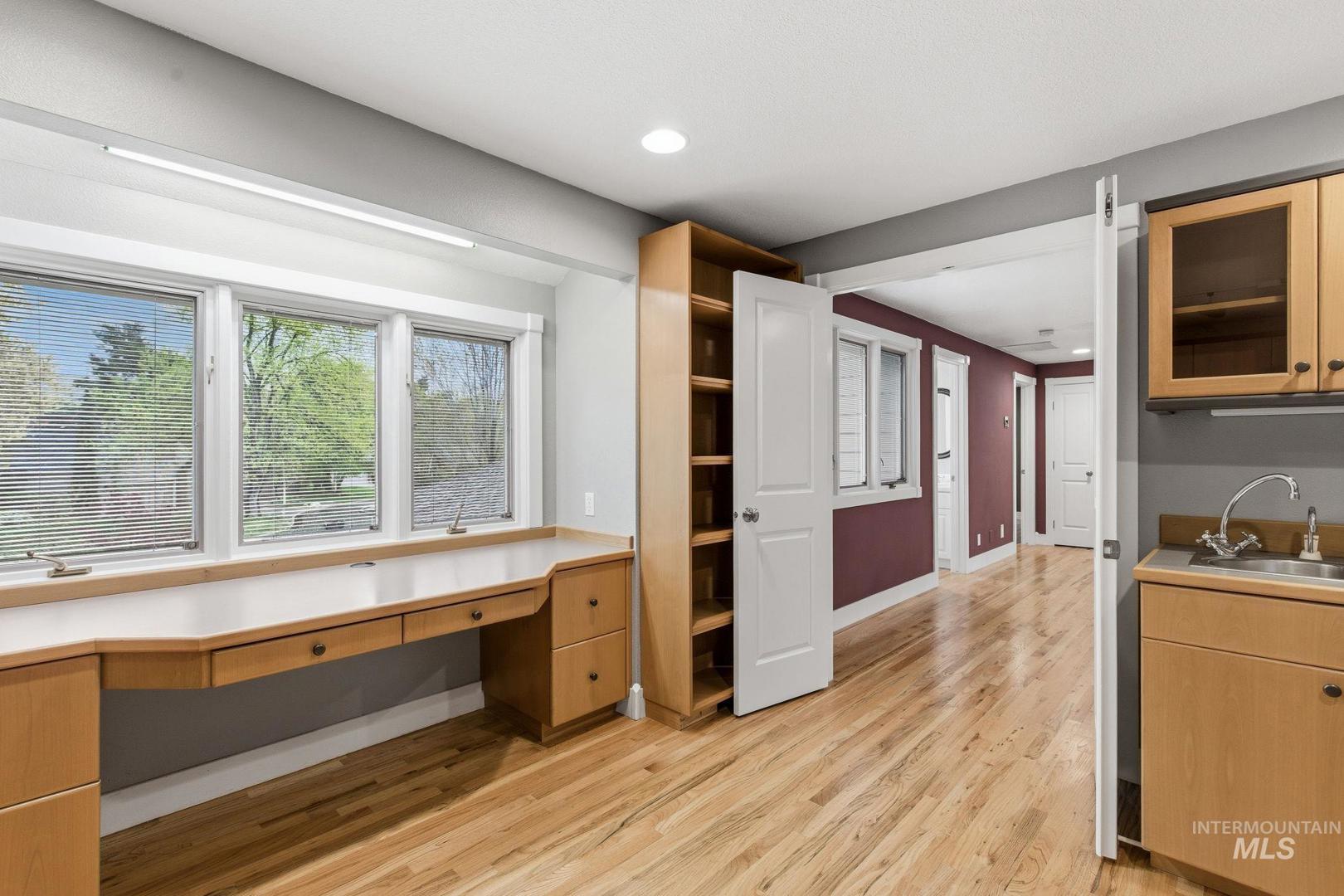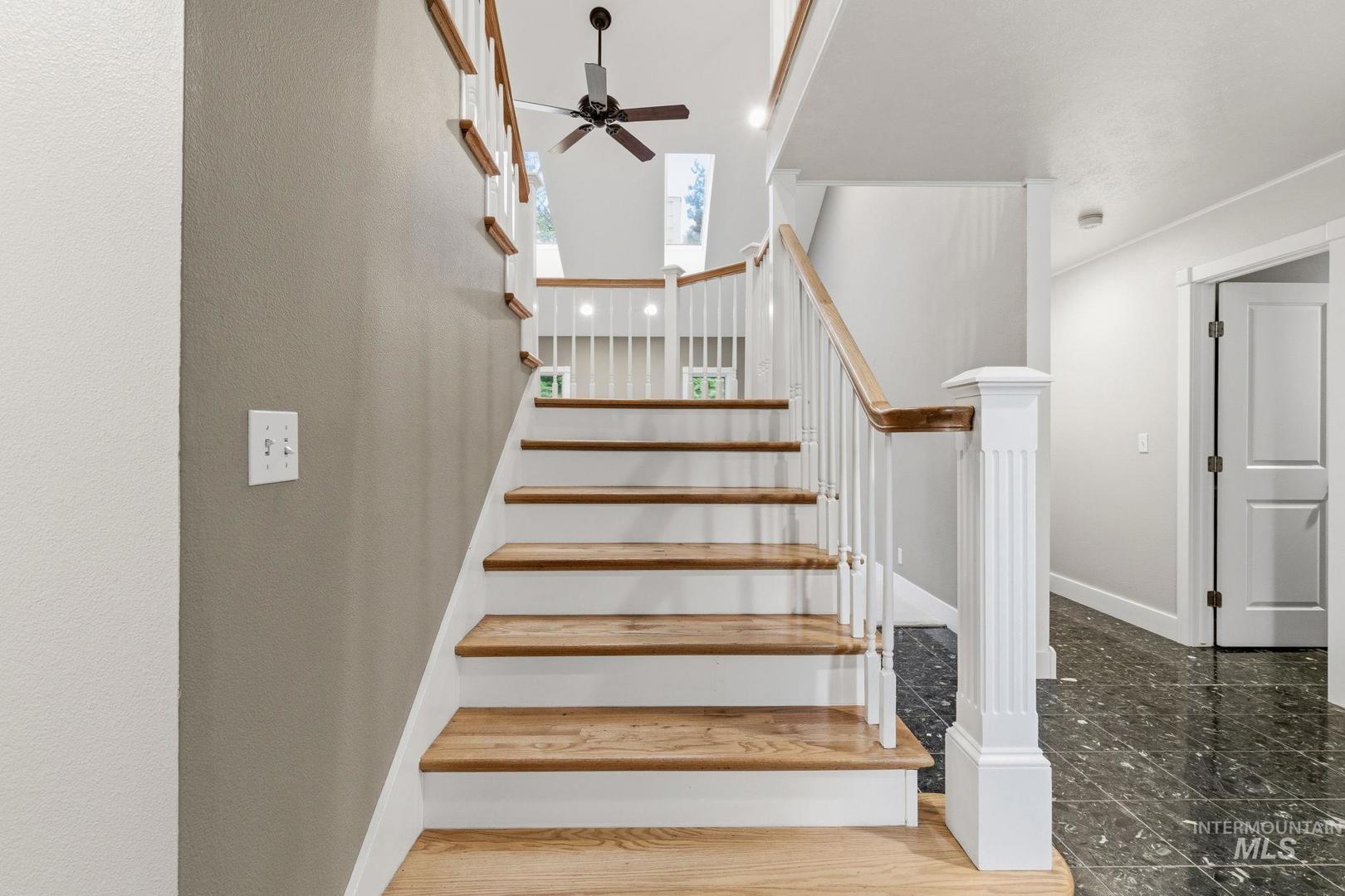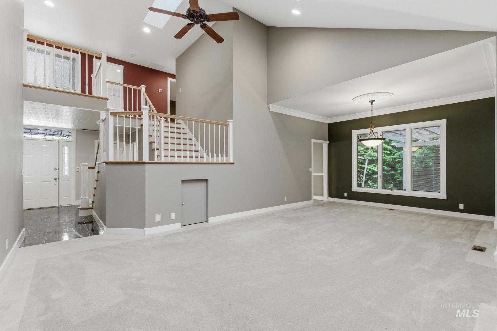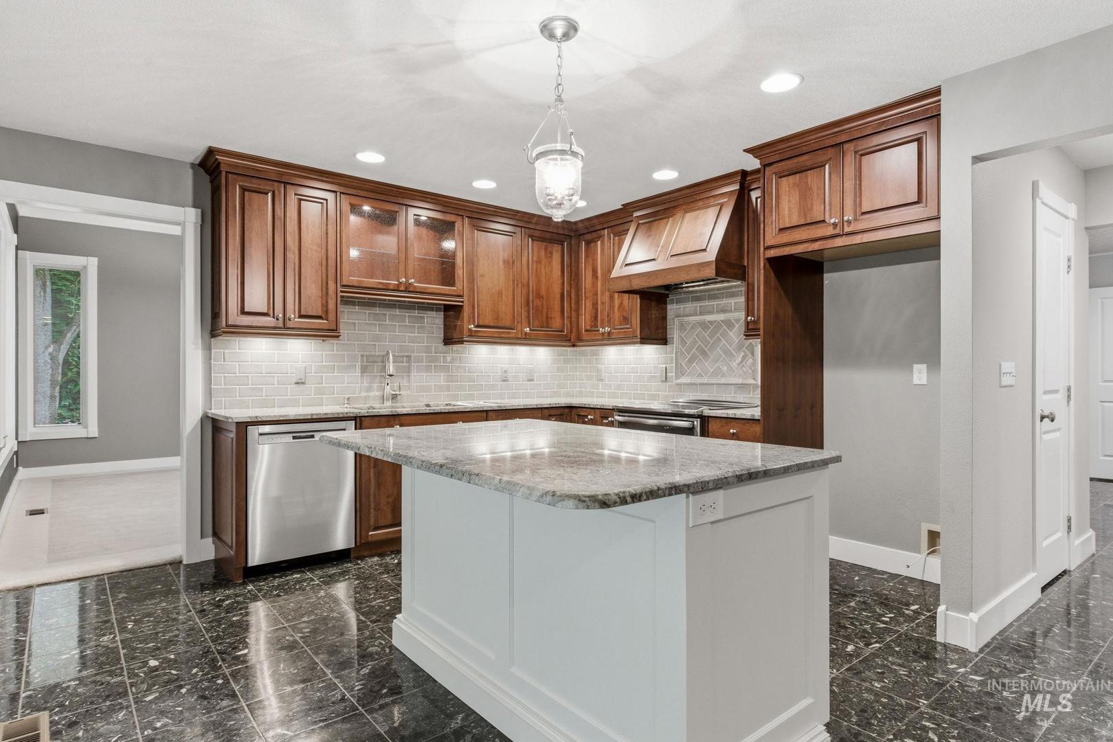 Exceptional River Run home with private fully fenced backyard oasis meticulously landscaped to take advantage of picturesque waterfall and established landscaping. Relax and entertain family and friends beneath the shade of a charming pergola nestled against a backdrop of tranquil flowing waterfall and pond. Pride of ownership abounds in the home`s stately interior with a recently remodeled kitchen featuring granite counters, custom solid wood cabinetry, induction range and breakfast. Main-level master with skylights in the soaring ceilings. Main level flex room that could be used as an office, workout room or den.Many upgrades over the years and solid construction all nestled in a perfect cul-de-sac of one of Boise`s premier neighborhood. Three bedrooms, full bath and office with built-in desk and sink completes the upstairs.