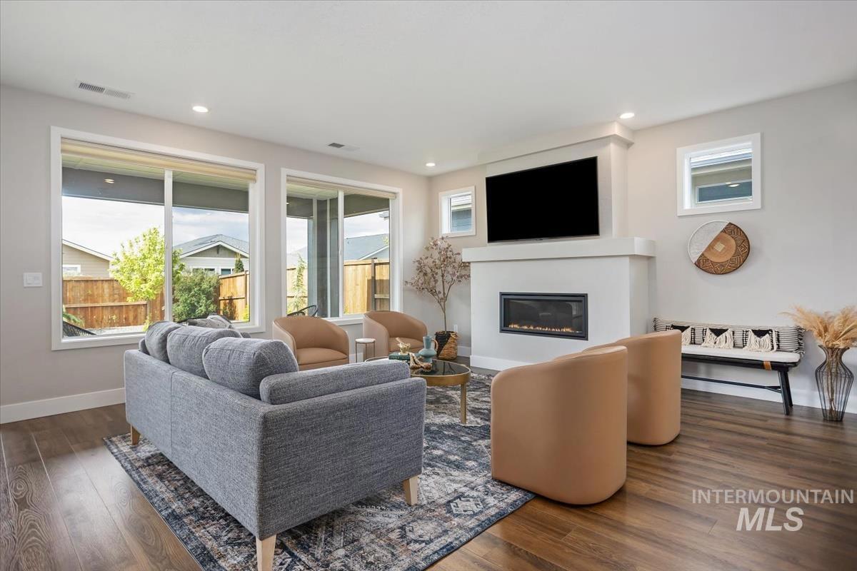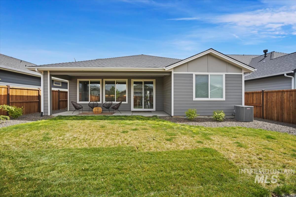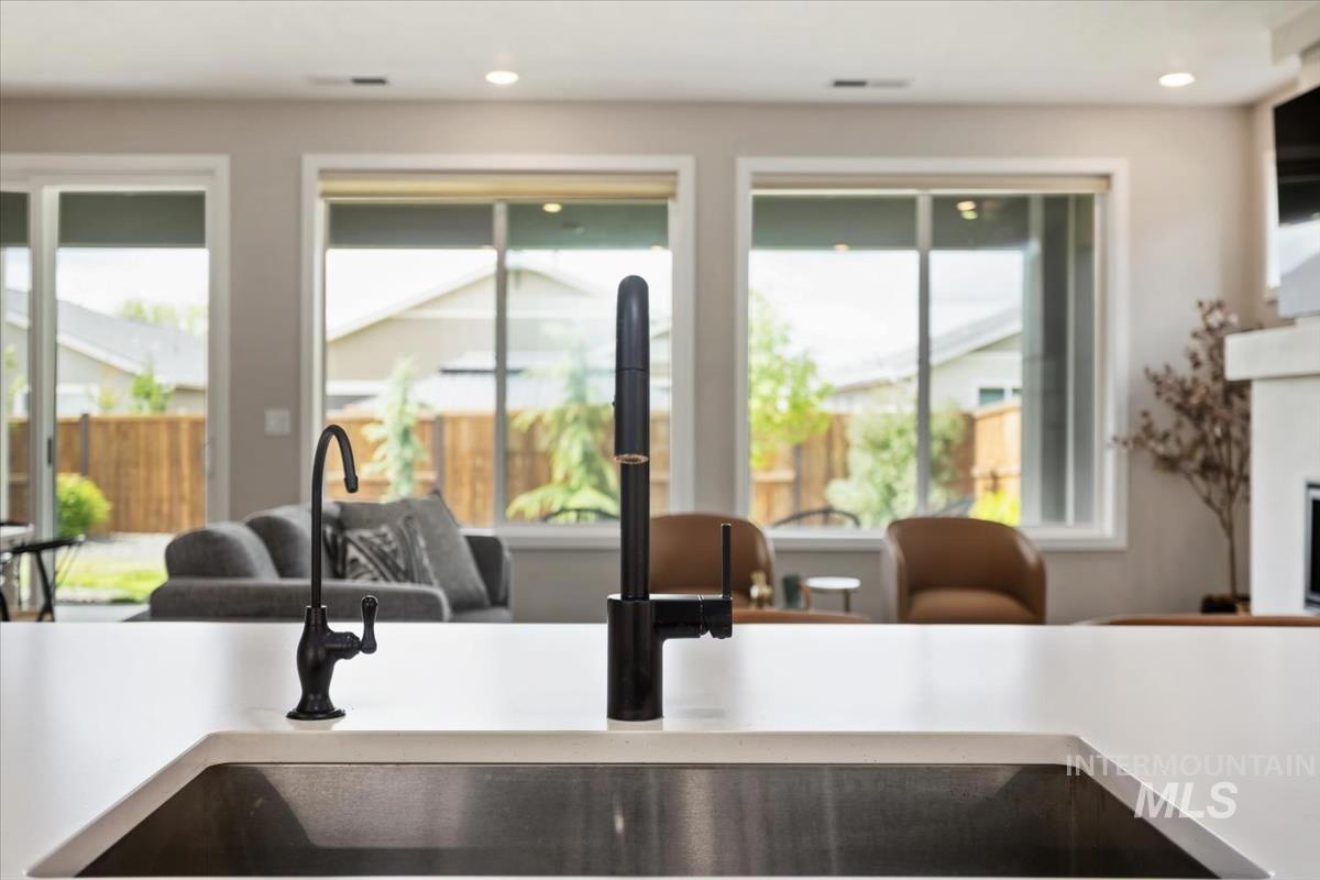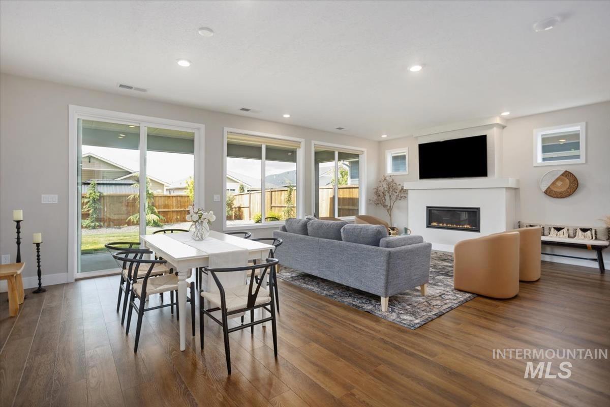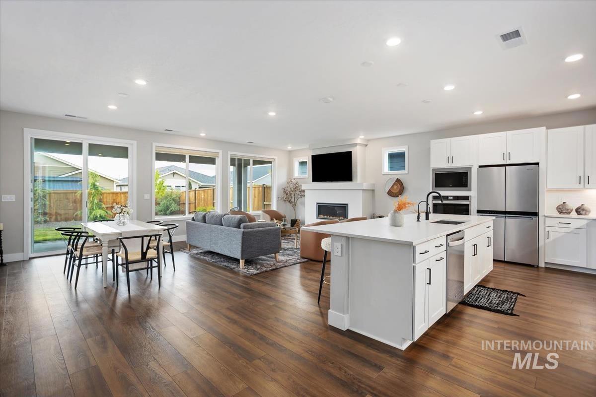 Beautifully maintained home on a premium lot with over $113K in upgrades, located in the sought after Trilogy Valor 55+ gated community. Enhanced curb appeal includes a premium elevation, upgraded exterior paint, and inviting front entry. Inside features 3 bedrooms plus a dedicated office or den with French doors, along with upgraded flooring, elegant trim, and quality finishes throughout. The gourmet kitchen offers quartz countertops, soft close cabinetry, and built in Whirlpool gas appliances. The open concept layout flows into a spacious great room with gas fireplace and large dining area, while sliding glass doors lead to an oversized covered patio, perfect for relaxing or entertaining. Additional highlights include window coverings, water softener and filtration system, and fully completed landscaping with fencing. Trilogy Valor offers resort style amenities including a clubhouse, fitness center, indoor and outdoor pools, pickleball courts, walking paths, a restaurant and bar, and a full social calendar. Conveniently located near Boise, Meridian, and outdoor recreation, this home combines comfort, style, and active living.