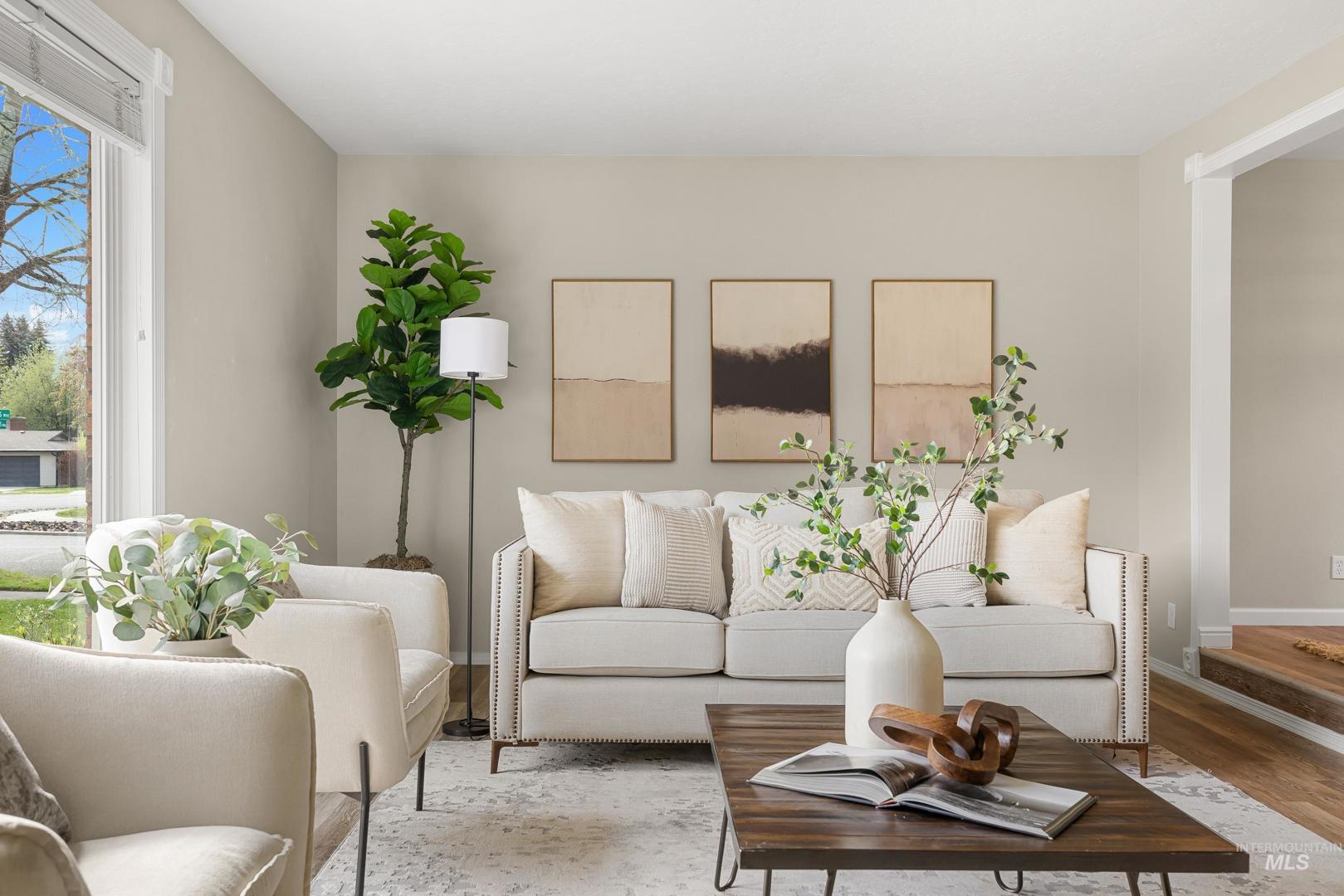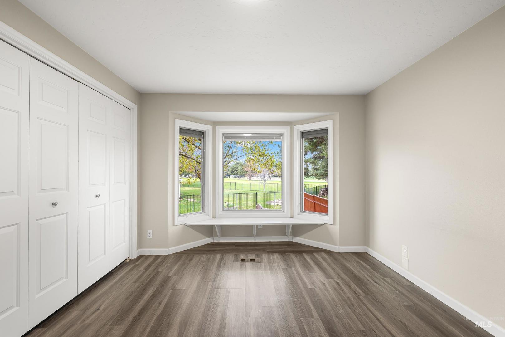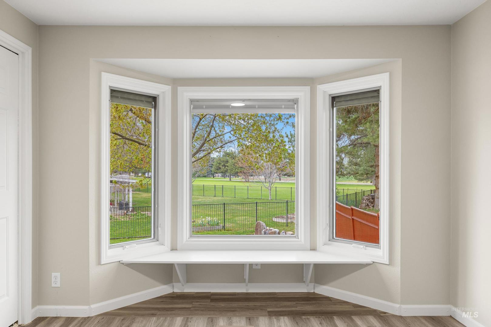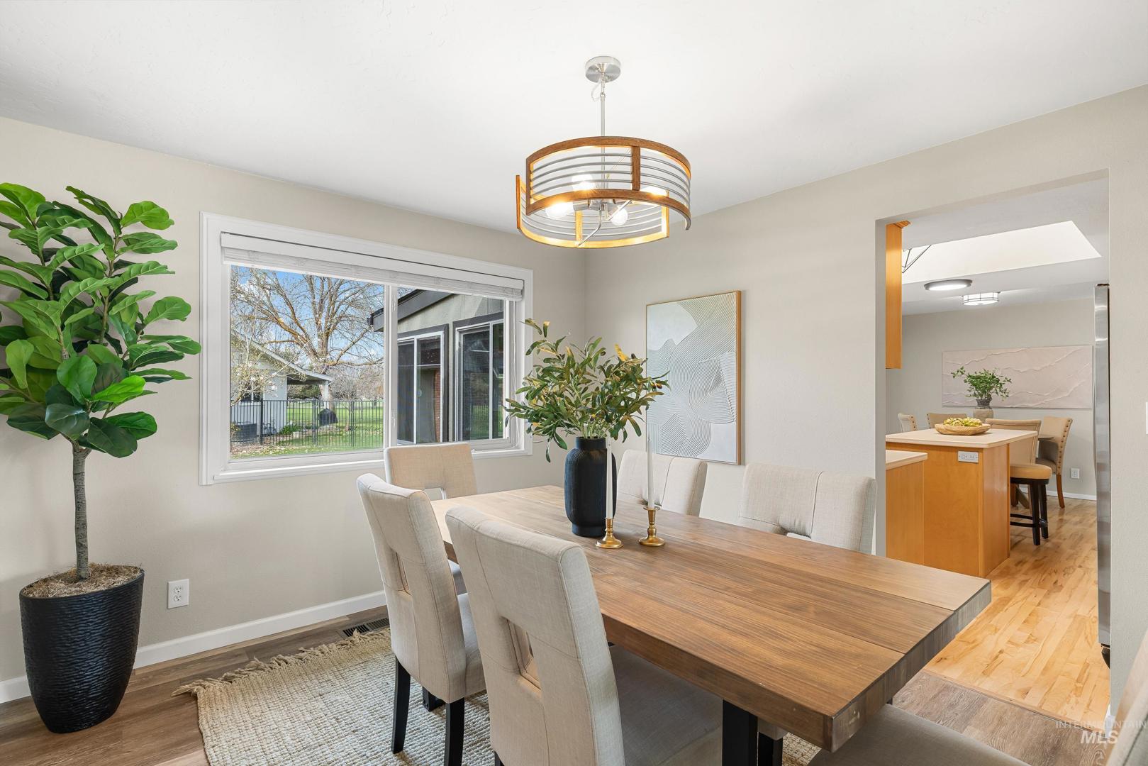 Set on a generous corner lot in a charming, established neighborhood with no HOA, this move-in ready gem is nestled against the 5th hole of Eagle Hills Golf Course, minutes from downtown Eagle, and within easy walking distance to parks and the clubhouse. Fresh, neutral paint, updated lighting, and durable flooring enhance the home’s timeless and comfortable appeal. An expansive picture window frames the idyllic, tree-lined street and fills the living space with natural light. A well-appointed kitchen offers ample prep space, beautiful wood cabinetry, and convenient access to the formal dining room—perfect for seamless hosting and gathering. Light-filled master features an attached ensuite bath and dual closets for everyday convenience and added storage. Centered around a nostalgic brick fireplace, the downstairs bonus room provides a versatile space ideal for a media room, play area, or teen hangout. With an additional full bath and bedroom, the lower level offers potential for multi-generational living or private guest quarters. Step through the enclosed sunroom to an impressive backyard retreat with picturesque golf course views. Enjoy evenings beneath the covered patio, summer bonfires around the built-in fire pit, or BBQs and lawn games on the lush, green grass.