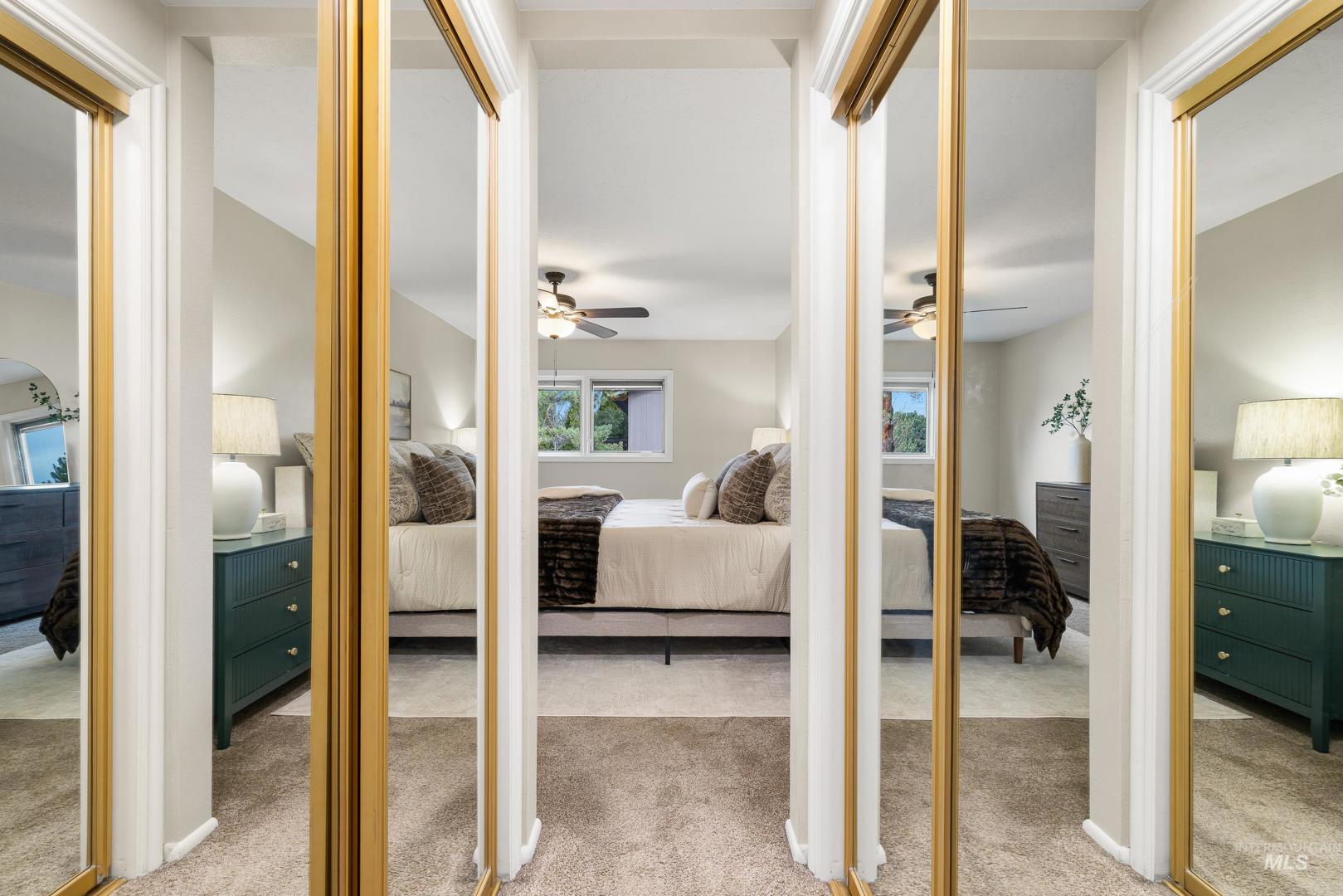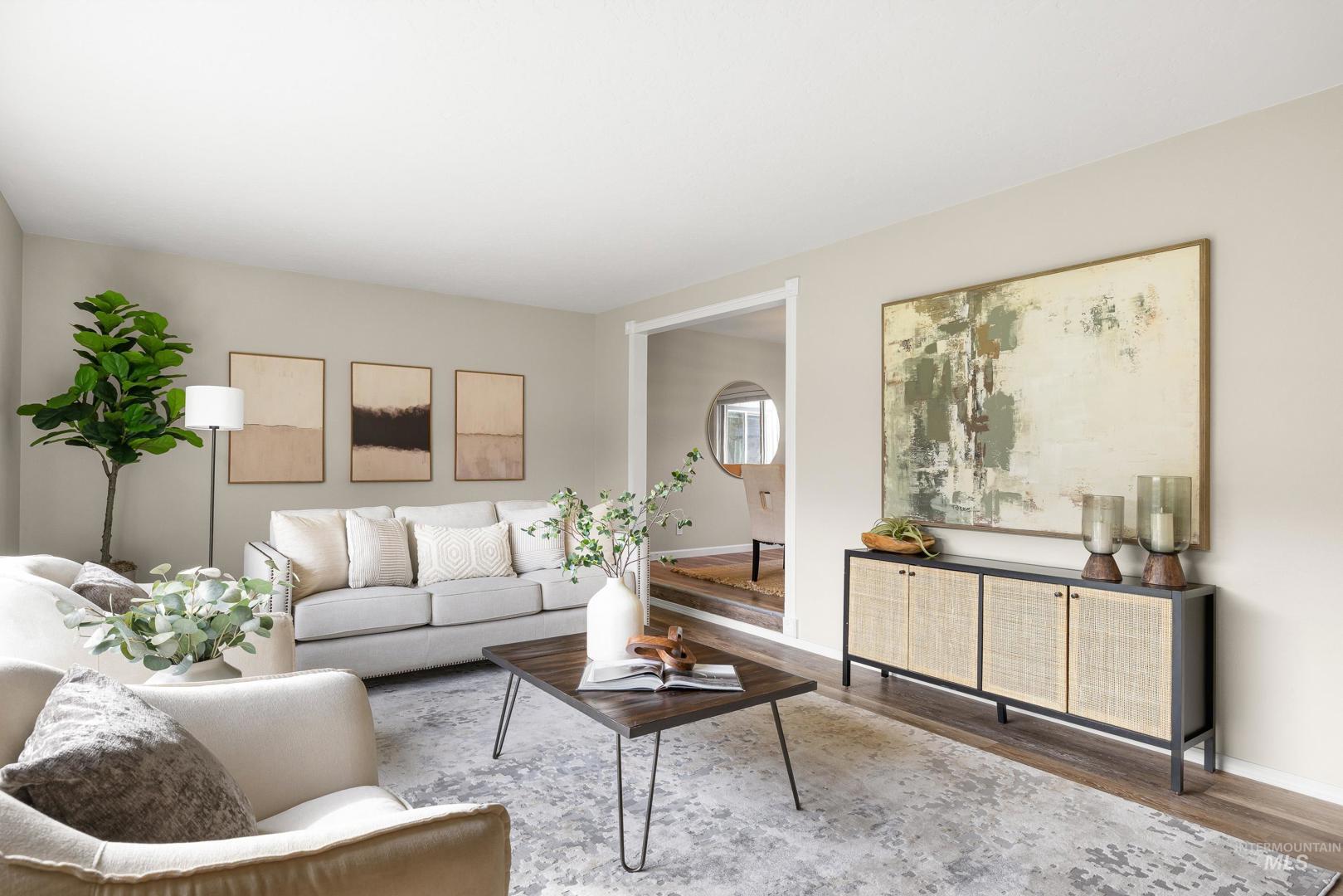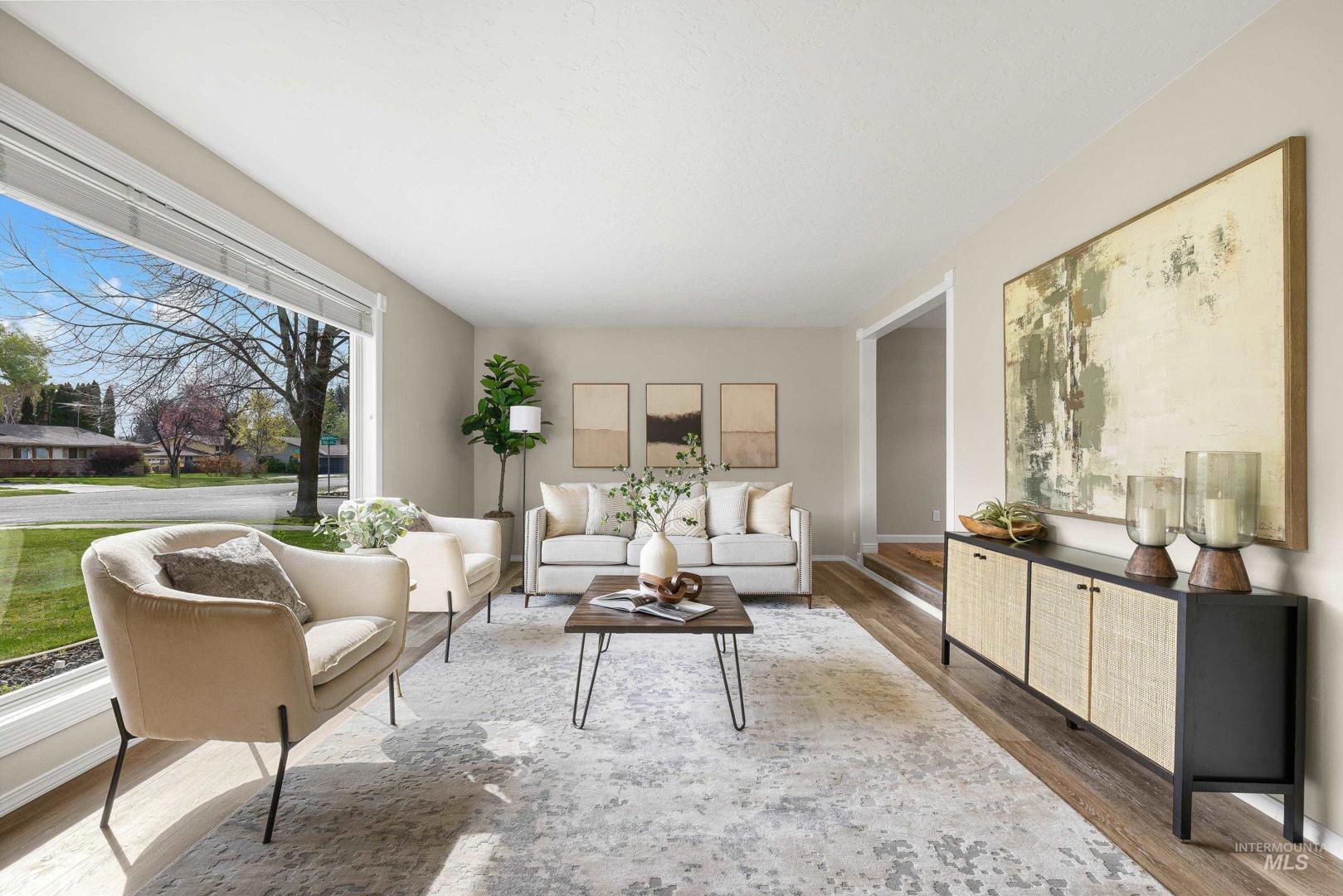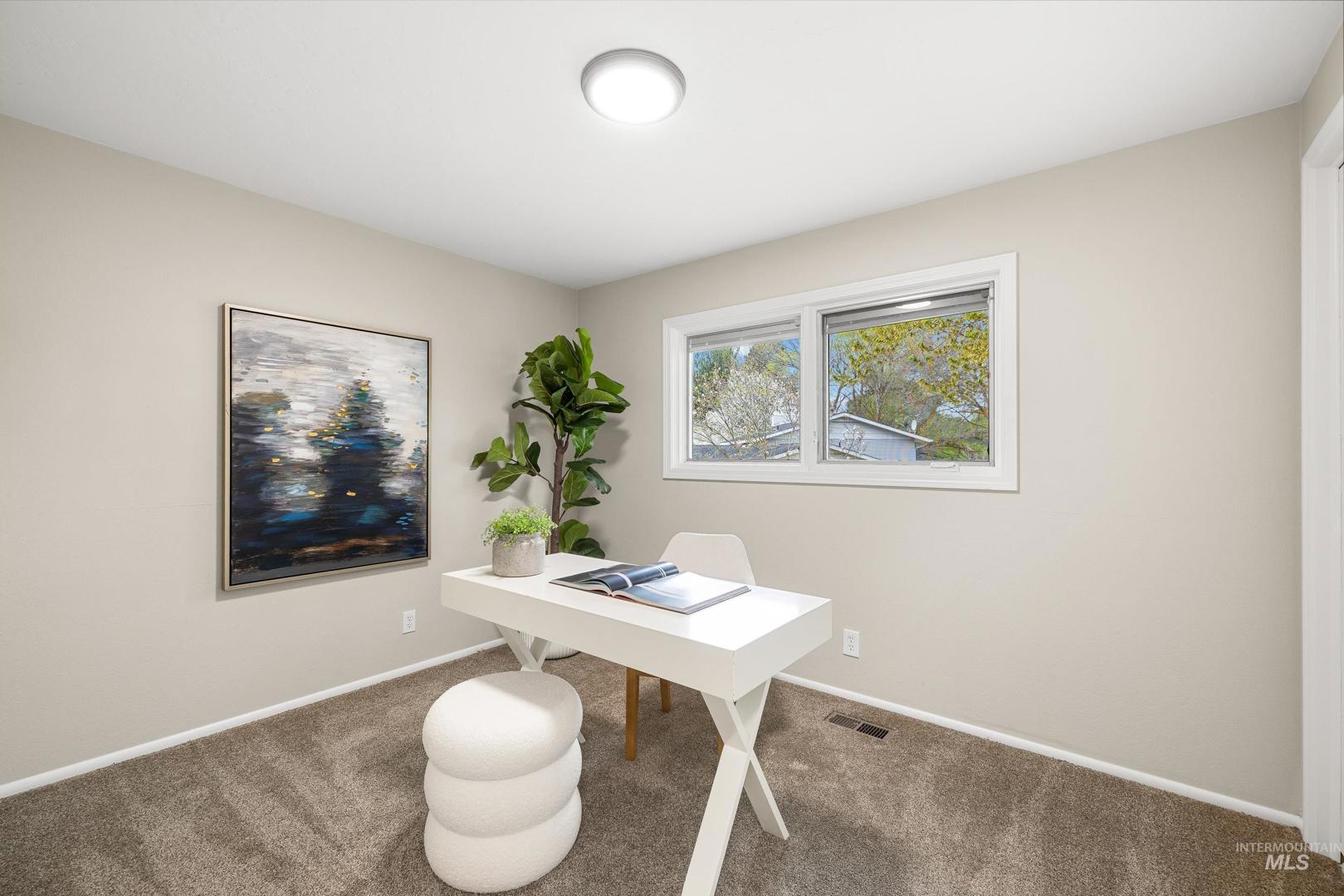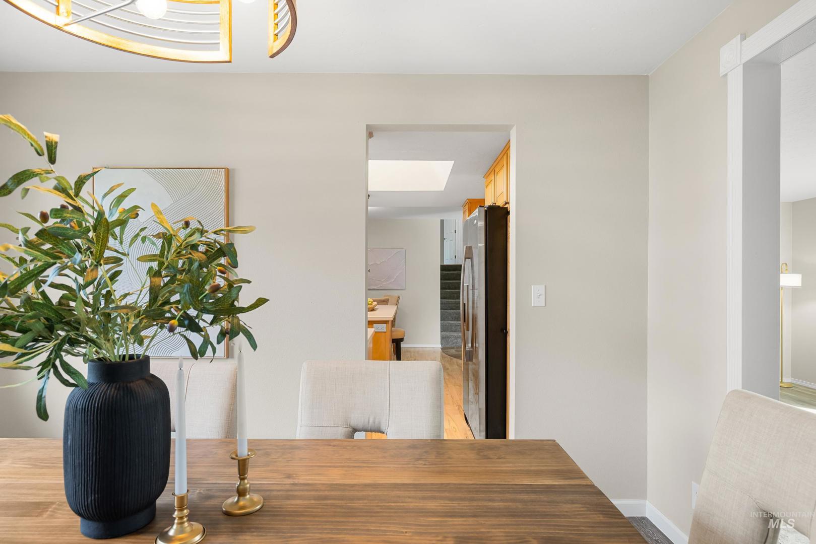 Set on a generous corner lot in a charming, established neighborhood with no HOA, this move-in ready gem is nestled against the 5th hole of Eagle Hills Golf Course, minutes from downtown Eagle, and within easy walking distance to parks and the clubhouse. Fresh, neutral paint, updated lighting, and durable flooring enhance the home’s timeless and comfortable appeal. An expansive picture window frames the idyllic, tree-lined street and fills the living space with natural light. A well-appointed kitchen offers ample prep space, beautiful wood cabinetry, and convenient access to the formal dining room—perfect for seamless hosting and gathering. Light-filled master features an attached ensuite bath and dual closets for everyday convenience and added storage. Centered around a nostalgic brick fireplace, the downstairs bonus room provides a versatile space ideal for a media room, play area, or teen hangout. With an additional full bath and bedroom, the lower level offers potential for multi-generational living or private guest quarters. Step through the enclosed sunroom to an impressive backyard retreat with picturesque golf course views. Enjoy evenings beneath the covered patio, summer bonfires around the built-in fire pit, or BBQs and lawn games on the lush, green grass.