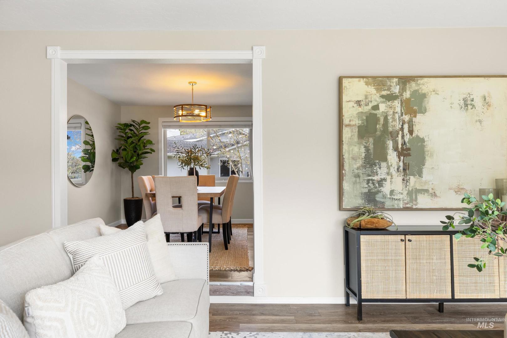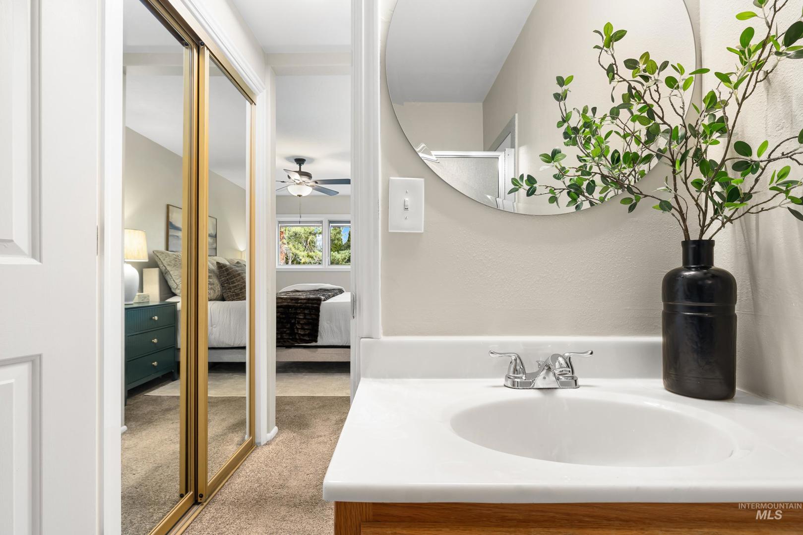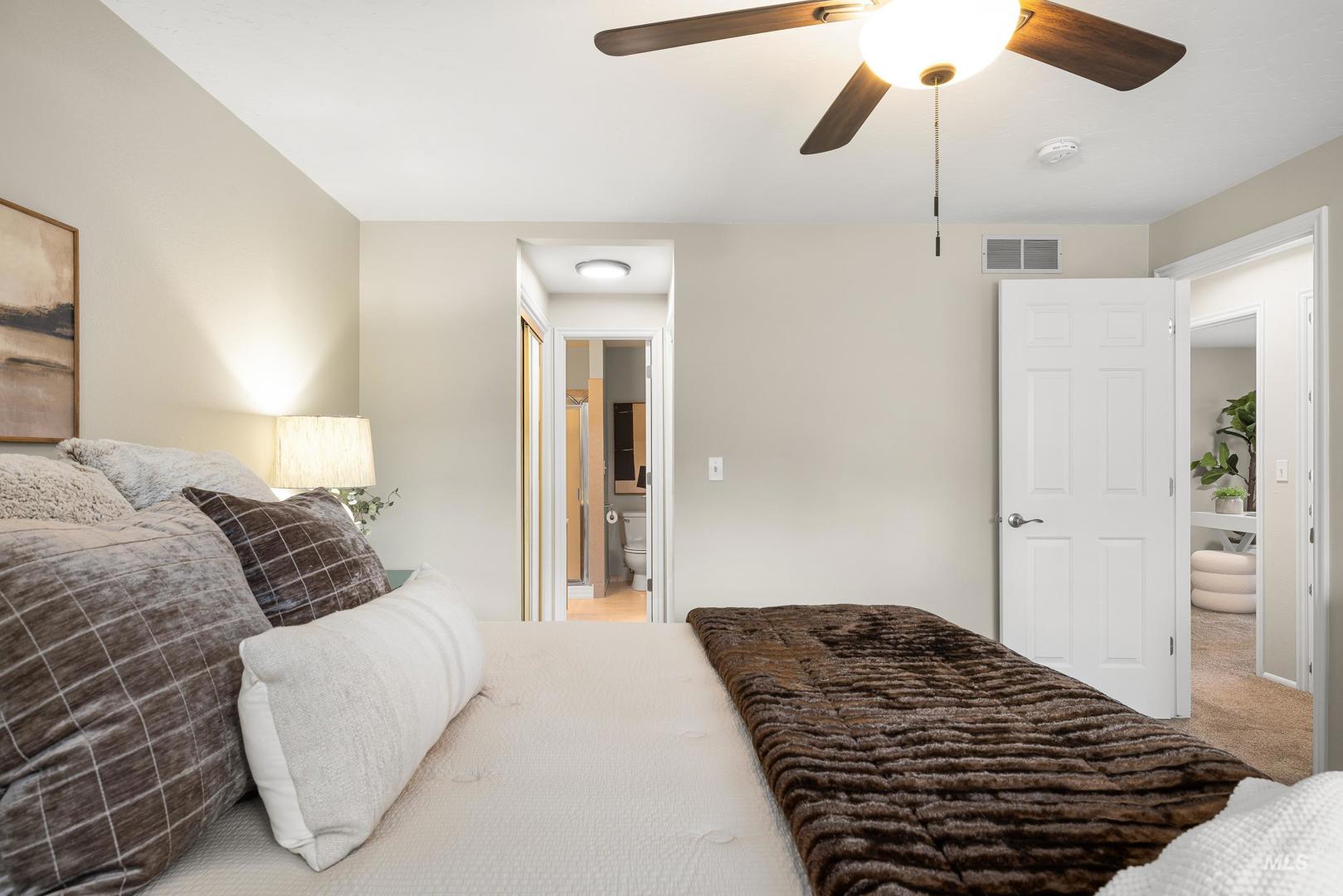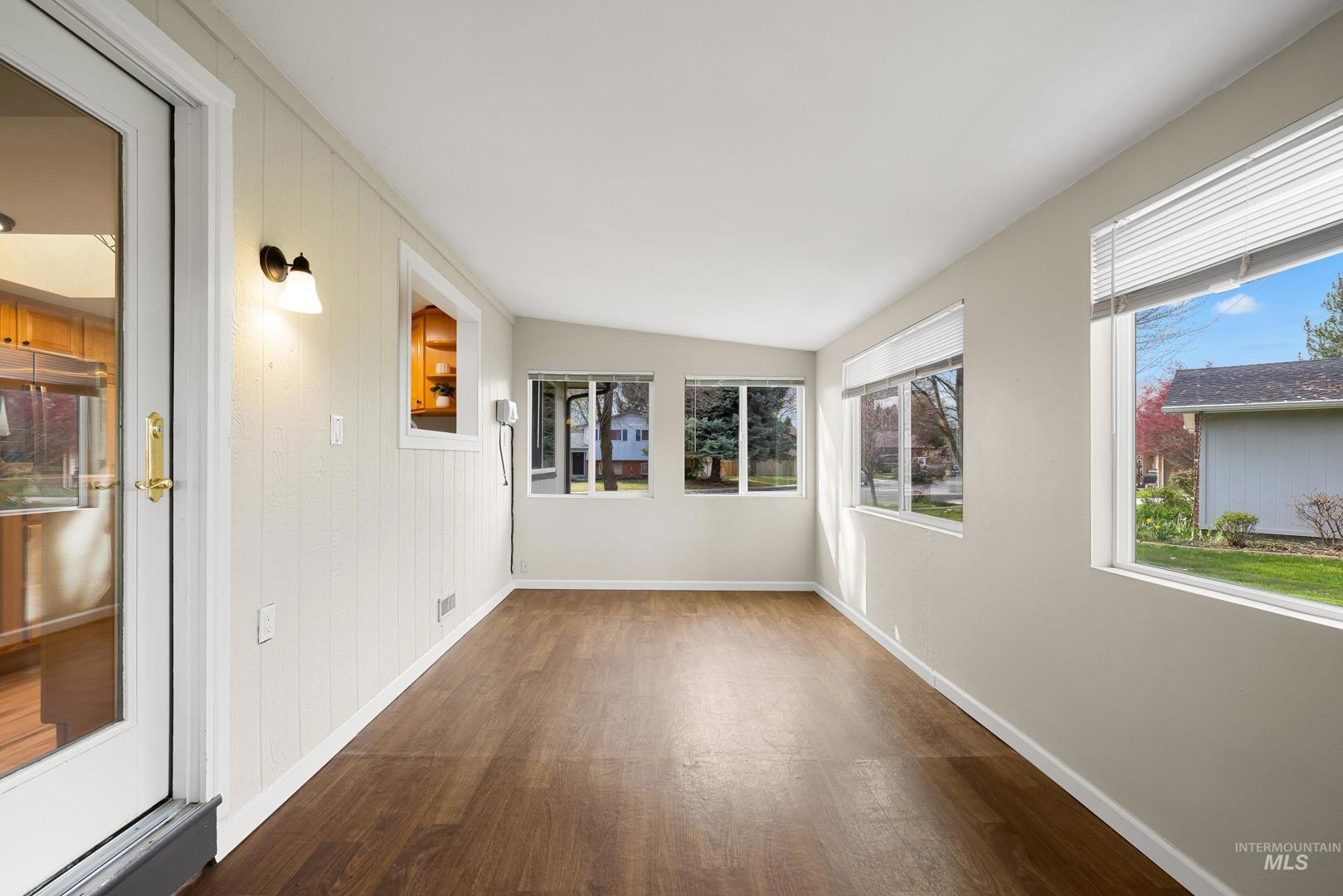 Set on a generous corner lot in a charming, established neighborhood with no HOA, this move-in ready gem is nestled against the 5th hole of Eagle Hills Golf Course, minutes from downtown Eagle, and within easy walking distance to parks and the clubhouse. Fresh, neutral paint, updated lighting, and durable flooring enhance the home’s timeless and comfortable appeal. An expansive picture window frames the idyllic, tree-lined street and fills the living space with natural light. A well-appointed kitchen offers ample prep space, beautiful wood cabinetry, and convenient access to the formal dining room—perfect for seamless hosting and gathering. Light-filled master features an attached ensuite bath and dual closets for everyday convenience and added storage. Centered around a nostalgic brick fireplace, the downstairs bonus room provides a versatile space ideal for a media room, play area, or teen hangout. With an additional full bath and bedroom, the lower level offers potential for multi-generational living or private guest quarters. Step through the enclosed sunroom to an impressive backyard retreat with picturesque golf course views. Enjoy evenings beneath the covered patio, summer bonfires around the built-in fire pit, or BBQs and lawn games on the lush, green grass.