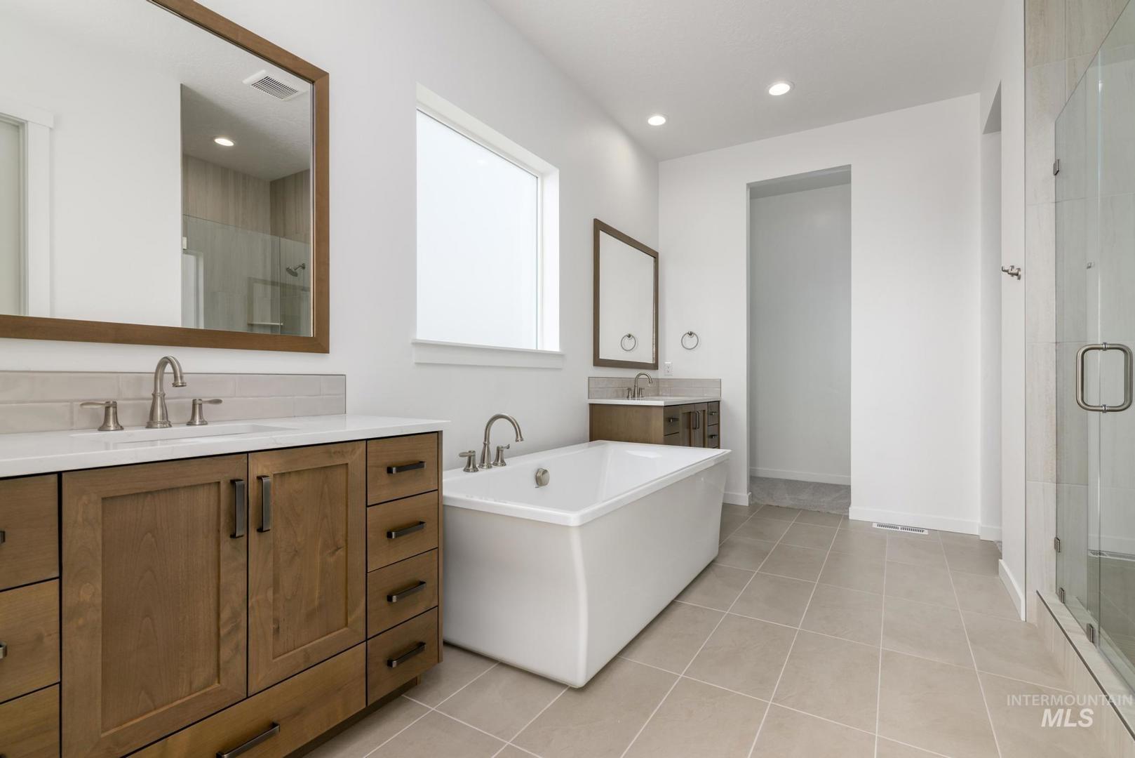 Step into the Wasatch, a two-story home design offering an impressive blend of functionality and elegance. A welcoming foyer flows to the striking two-story great room adjacent to the kitchen and covered patio, creating a seamless flow for gatherings and family time. The primary bedroom suite on the main level is a sanctuary featuring dual vanities, a luxurious shower, and two walk-in closets. Additionally, the main level offers a secondary bedroom with hall bath and spacious laundry room. Upstairs, a cozy loft area is central to two secondary bedrooms that share a bath and feature walk-in closets as well as a third bedroom set adjacent to a shared hall bath, providing ample space for family members or guests. The Wasatch also features an everyday entry leading to a two-car garage, while a separate one-car garage provides additional parking and storage. Front and rear landscape is included. Home is under construction and photos are similar. BTVAI