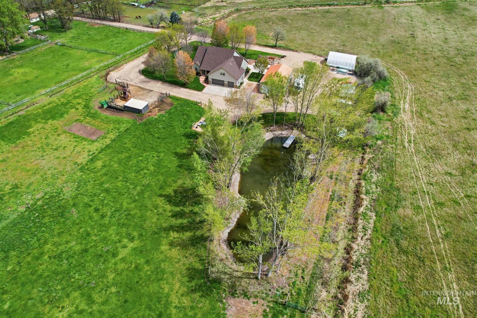 Welcome home to this beautifully designed 3,000 sq ft residence offering the ease of single-level living with a versatile bonus room with a full bath—perfect for guests, multi-generational living, or a private retreat. The open floor plan has been thoughtfully designed with soaring 17-foot vaulted ceilings in the living room. Cozy up to the warmth of the new pellet stove and throughout the home, you`ll find stunning Australian cypress hardwood flooring, expansive windows that fill the space with natural light, and upgrades including a central vac system and whole-house sound system. The large kitchen features granite countertops, knotty alder cabinetry, double ovens, and room to entertain. The spacious primary suite is warm and inviting, featuring direct access to the patio. The primary bathroom boasts heated tile floors and a walk-in shower. Entertain or unwind in the east-facing backyard, where a beautiful, covered patio overlooks serene surroundings—ideal for enjoying sunrises and shaded afternoons. Set on 5.35 private acres, the property features a tranquil pond and plenty of space to roam, garden, or simply enjoy. The 58 x 30 insulated shop has a space for an office, or rec room and its own bathroom. The vinyl shed 30 x 40 will fit a lot of toys. The pastures all have UG sprinklers. This is a rare opportunity to own a property that is the last house at the end of the road.