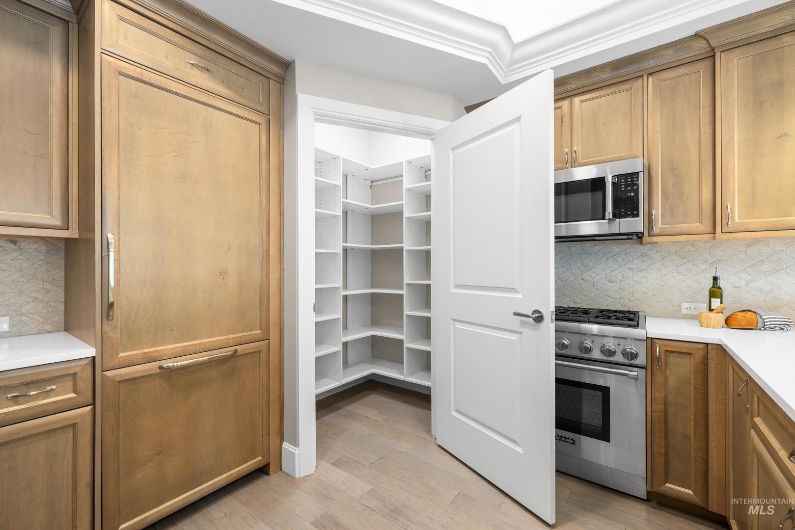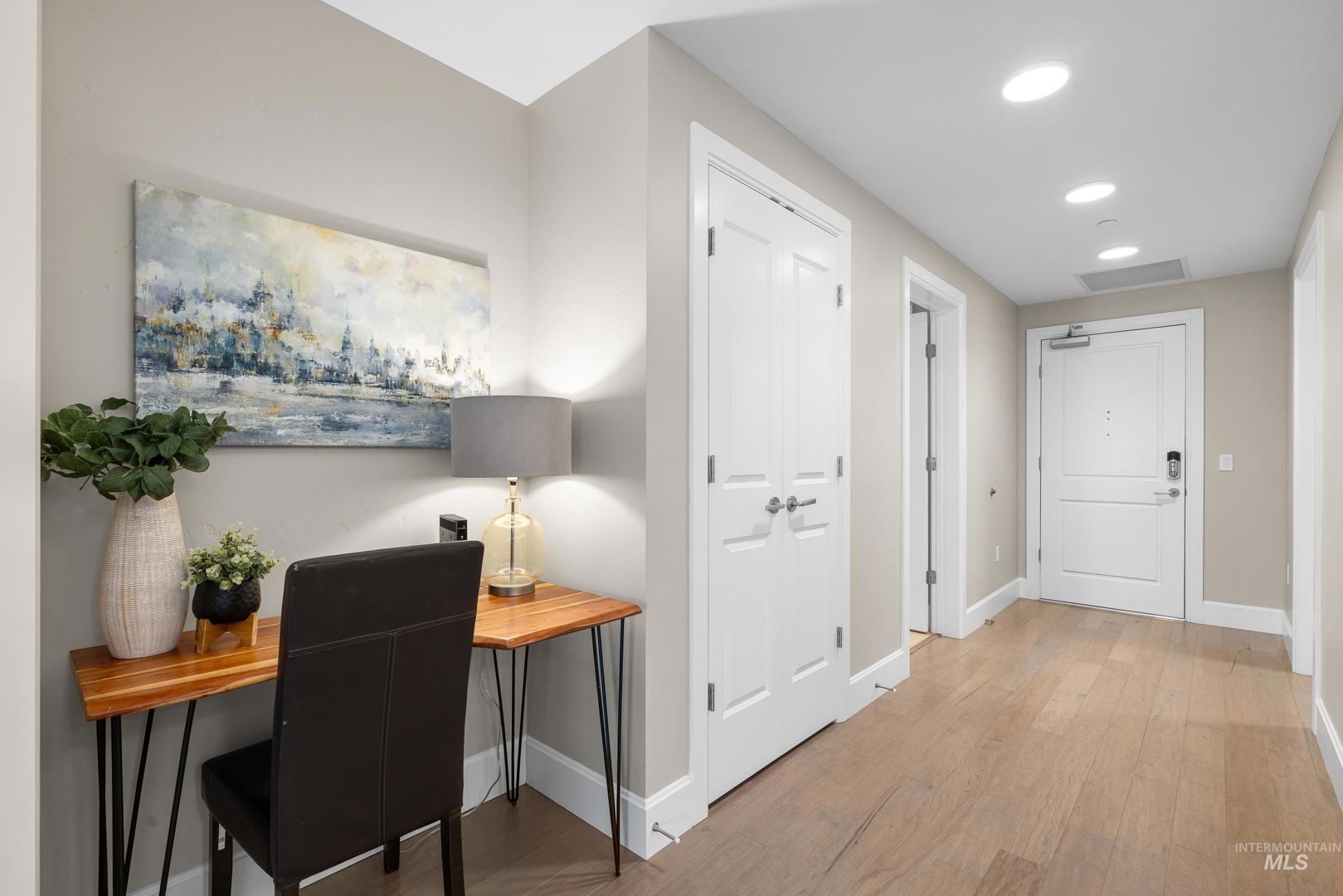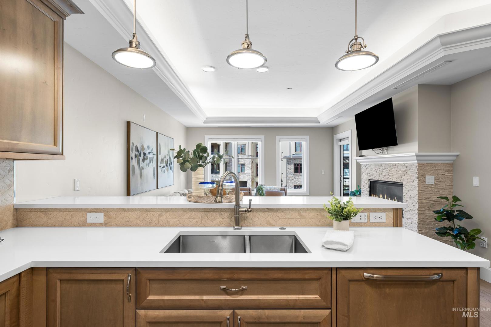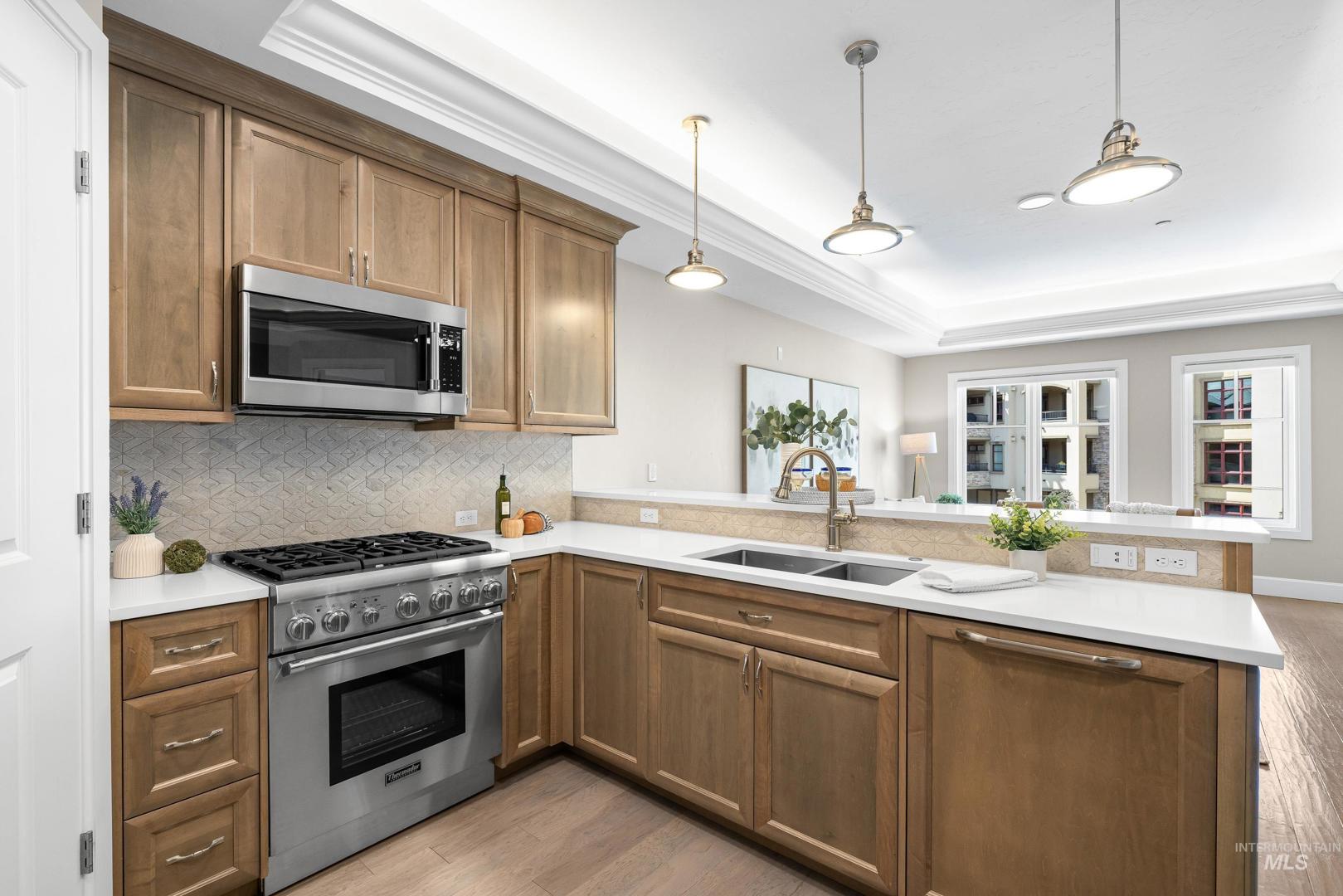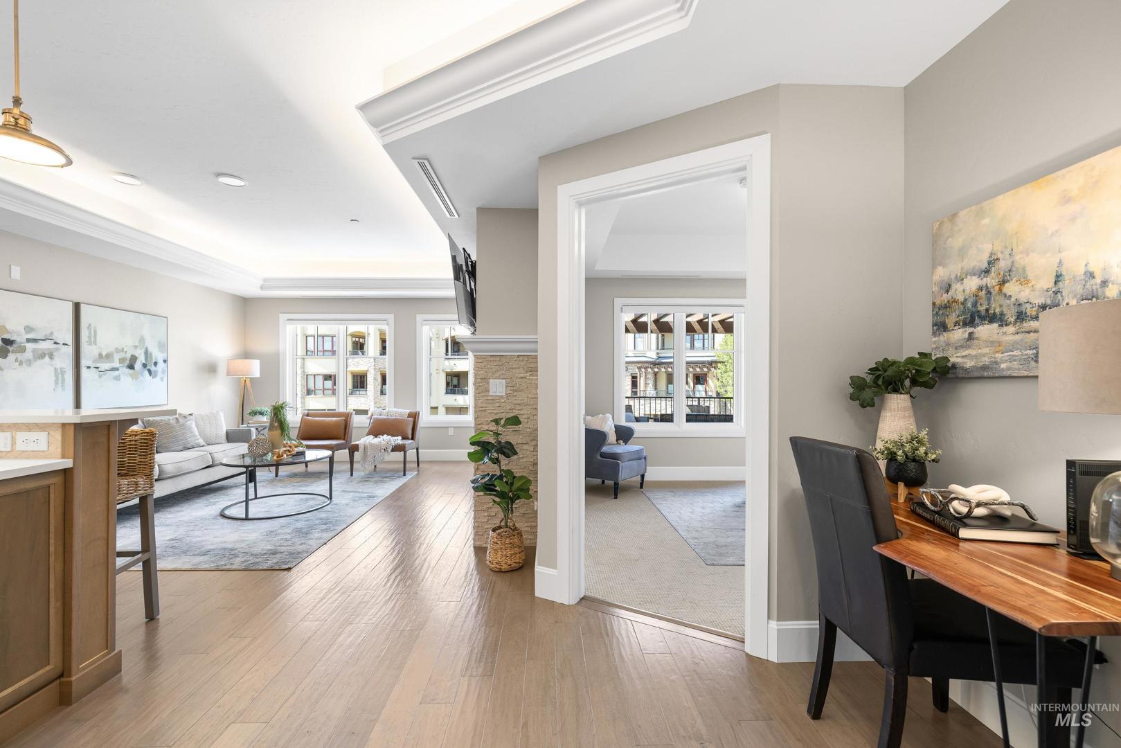 Open house Sat 4/25 from 1-4. Experience resort-style living at its finest in this stunning, move-in-ready second-level condo overlooking Ann Morrison Park. Thoughtfully designed for both comfort and style, this home features a gourmet kitchen equipped with a Thermador refrigerator and oven range—perfect for cooking and entertaining. Washer, Dryer and TV included. The well-planned layout maximizes livability, creating a seamless flow between spaces. The large bedroom and extra-large closet is ideal for living and storage. Hunter Douglas Electric Blinds throughout. Step out onto the spacious deck, complete with gas, water, and electric hookups—ideal for outdoor dining and gatherings. Residents enjoy exclusive access to premium amenities, including a private gym, pool, spa, catering kitchen, and elegant club room. Guests are equally well accommodated with three luxurious suites available for rent at a nominal rate. Additional highlights include secure underground parking with a dedicated space, making this home perfect for a lock-and-leave lifestyle. Enjoy breathtaking views of hot air balloon launches and fourth of July fireworks right from your private covered patio. Many Residents love the feeling and sense of community. Conveniently located with easy access to downtown Boise, Boise Airport, the Boise River, Greenbelt, Train Depot and nearby restaurants.