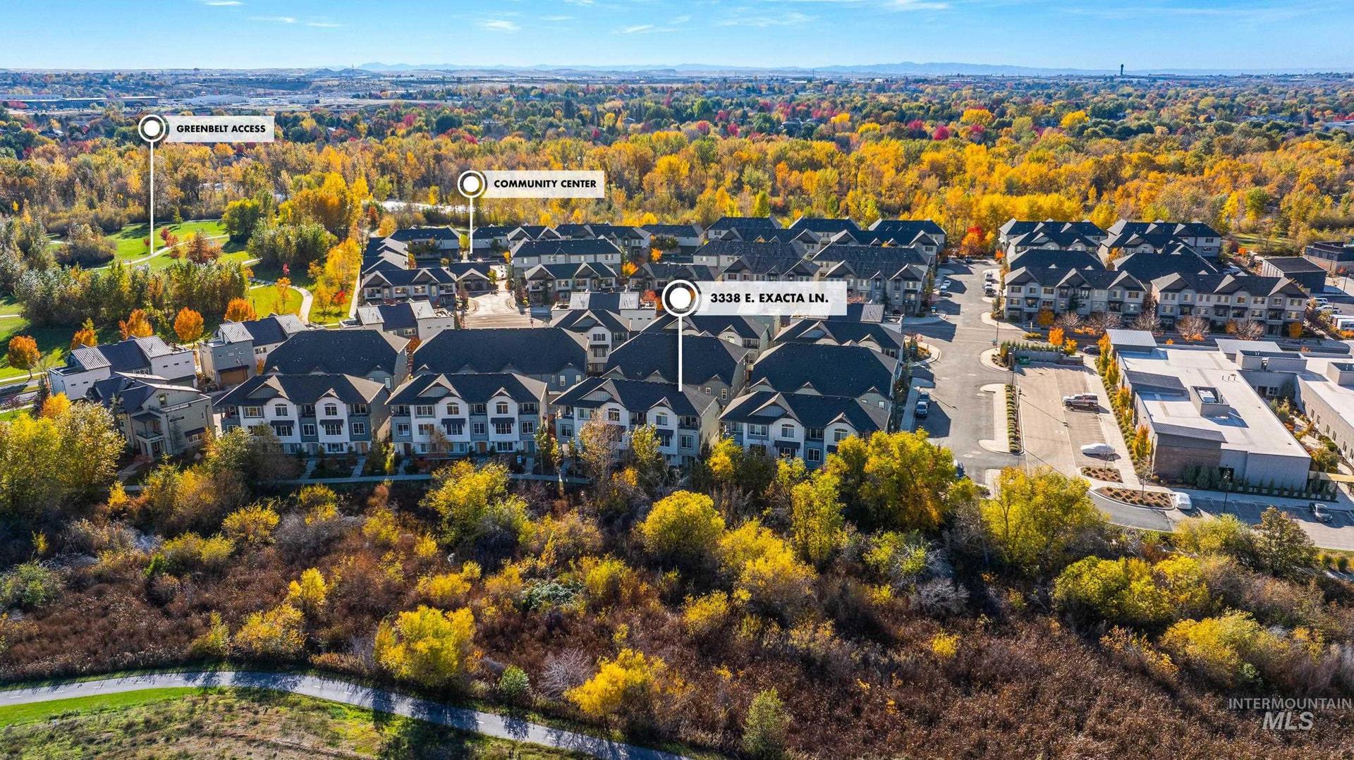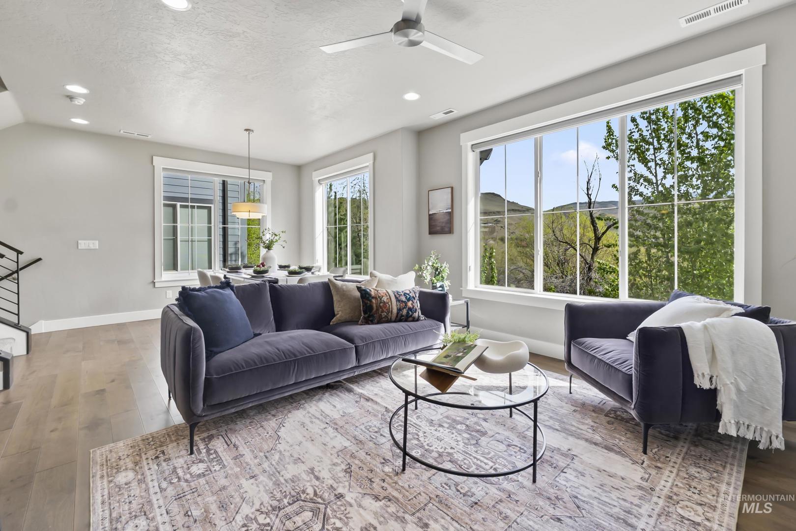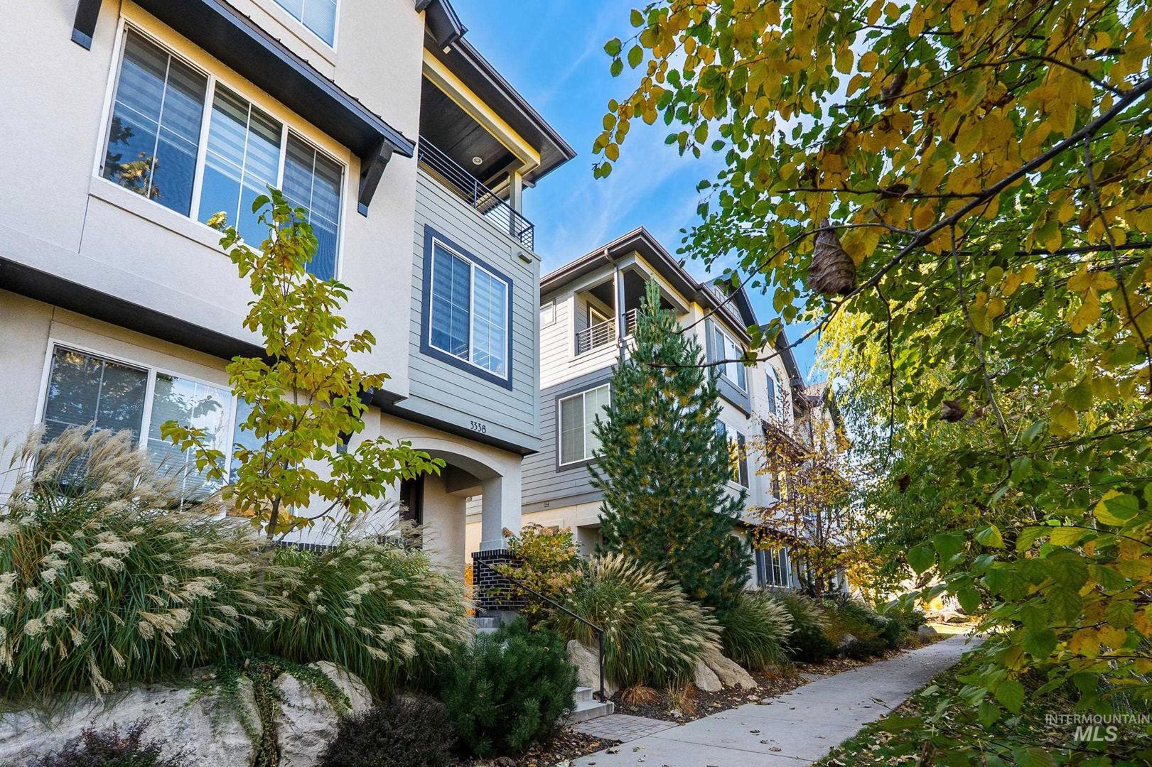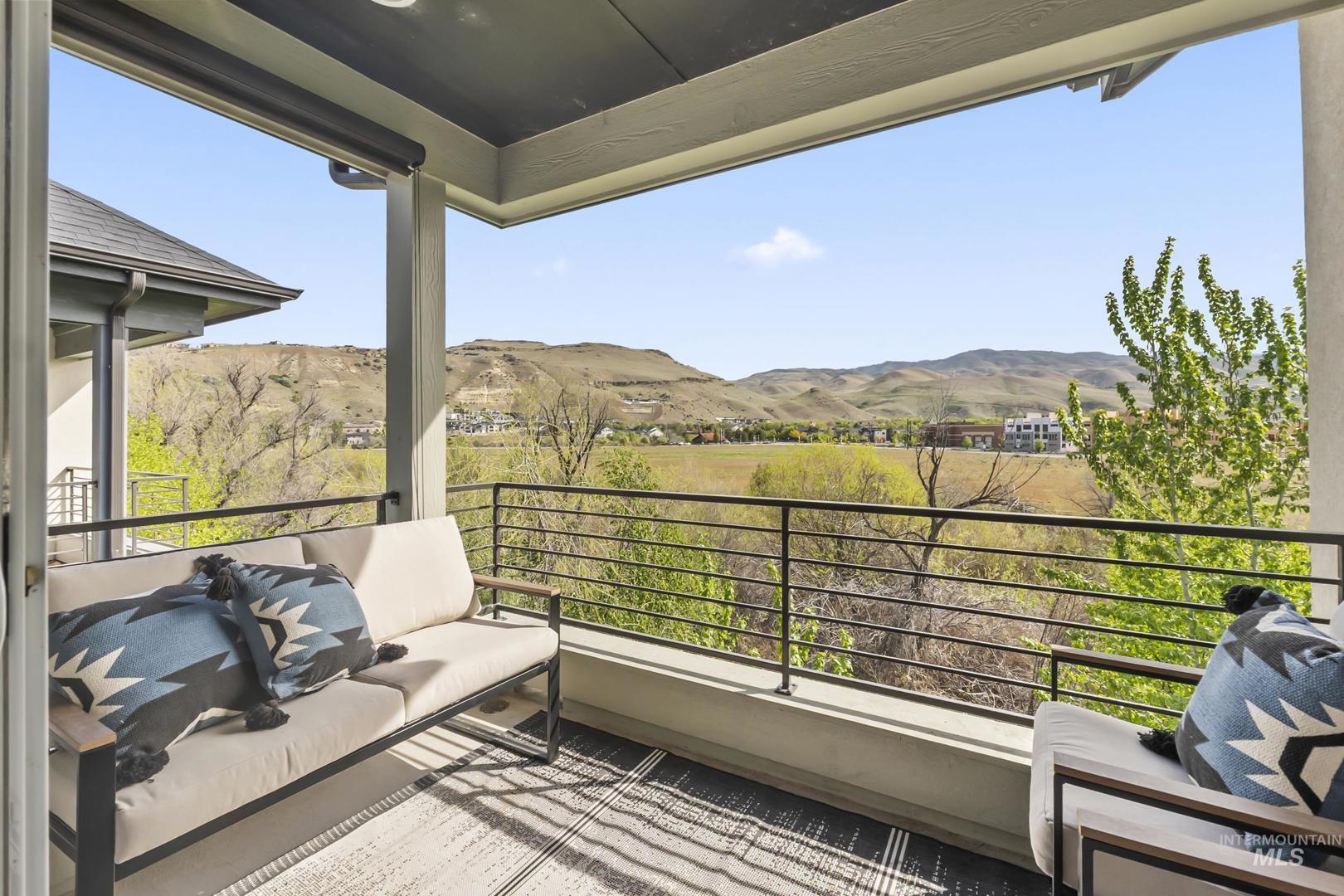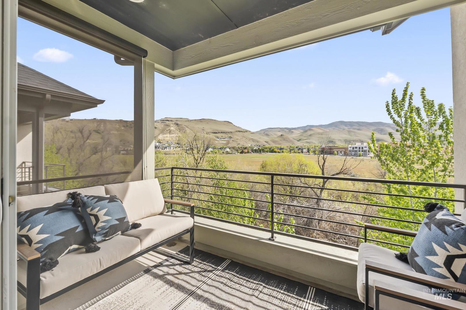 Welcome to modern living in this energy efficient, luxury townhome, where design meets sophisticated style; topped with stunning foothill views and lush greenery. Step inside and you`ll feel it immediately: expansive ceilings, huge windows that pour in natural light, a chef`s kitchen with Bosch appliances and custom cabinitry, and an open layout that makes living easy. Three bedrooms offer walk-in closets and 3 full private baths on each level affording privacy for all. Enjoy solace in the city from your patio terrace, where this end-unit has the front row seat to spectacular sunsets, a creek, and panoramic mountain views. Resort like amenities include a clubhouse with entertaining space, fitness center and a community pool!  HOA dues include maintenance of the exteriors, roofs, common area landscaping, snow removal and street maintenance. And then there’s the location... This spot is prime; it`s blocks to some of the Northeast Boise`s best parks and amenities. Whether you’re wanting to go for a mountain bike ride, hike Tablerock or walk the Greenbelt to enjoy river views, you’re right in the middle of it all. Truly turnkey and better than new, this exceptional townhome offers the perfect opportunity to live a lock and leave lifestyle in the heart of Northeast Boise.