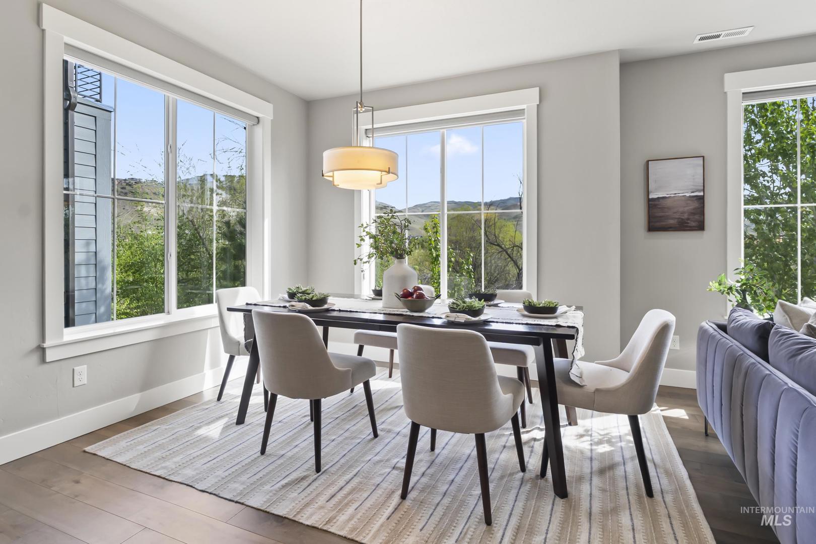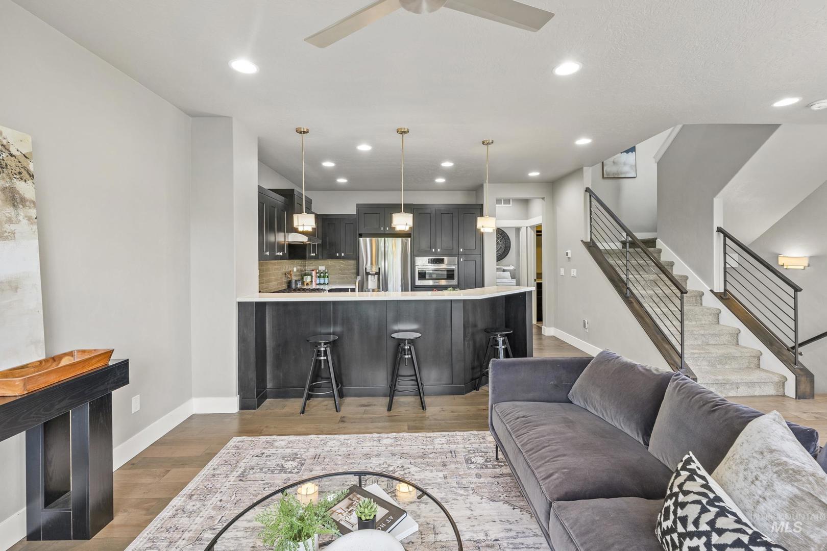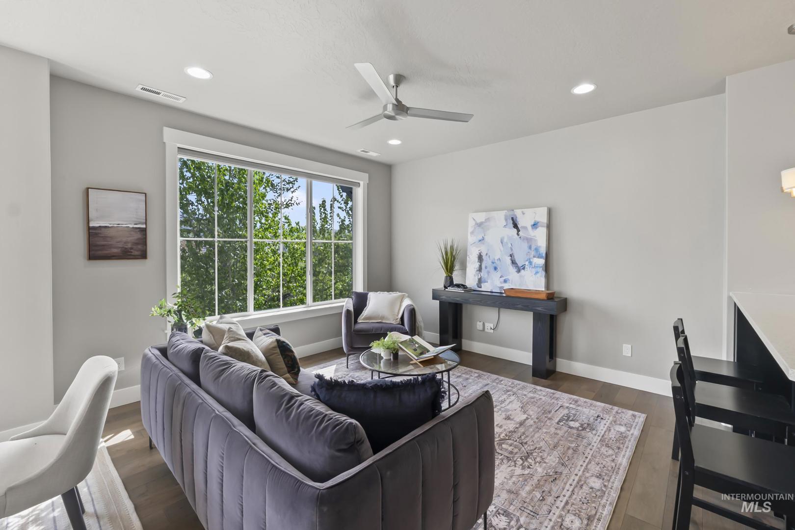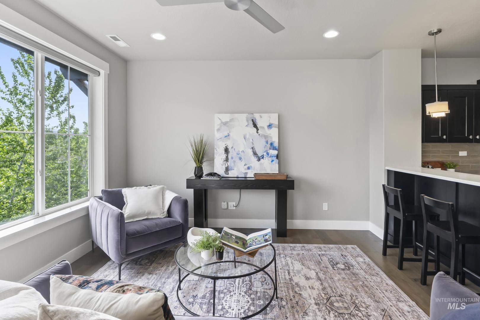 Welcome to modern living in this energy efficient, luxury townhome, where design meets sophisticated style; topped with stunning foothill views and lush greenery. Step inside and you`ll feel it immediately: expansive ceilings, huge windows that pour in natural light, a chef`s kitchen with Bosch appliances and custom cabinitry, and an open layout that makes living easy. Three bedrooms offer walk-in closets and 3 full private baths on each level affording privacy for all. Enjoy solace in the city from your patio terrace, where this end-unit has the front row seat to spectacular sunsets, a creek, and panoramic mountain views. Resort like amenities include a clubhouse with entertaining space, fitness center and a community pool!  HOA dues include maintenance of the exteriors, roofs, common area landscaping, snow removal and street maintenance. And then there’s the location... This spot is prime; it`s blocks to some of the Northeast Boise`s best parks and amenities. Whether you’re wanting to go for a mountain bike ride, hike Tablerock or walk the Greenbelt to enjoy river views, you’re right in the middle of it all. Truly turnkey and better than new, this exceptional townhome offers the perfect opportunity to live a lock and leave lifestyle in the heart of Northeast Boise.