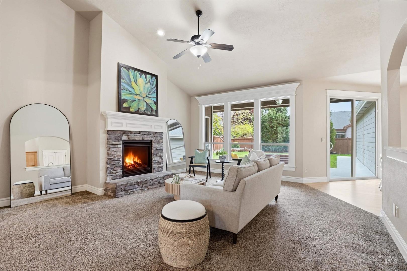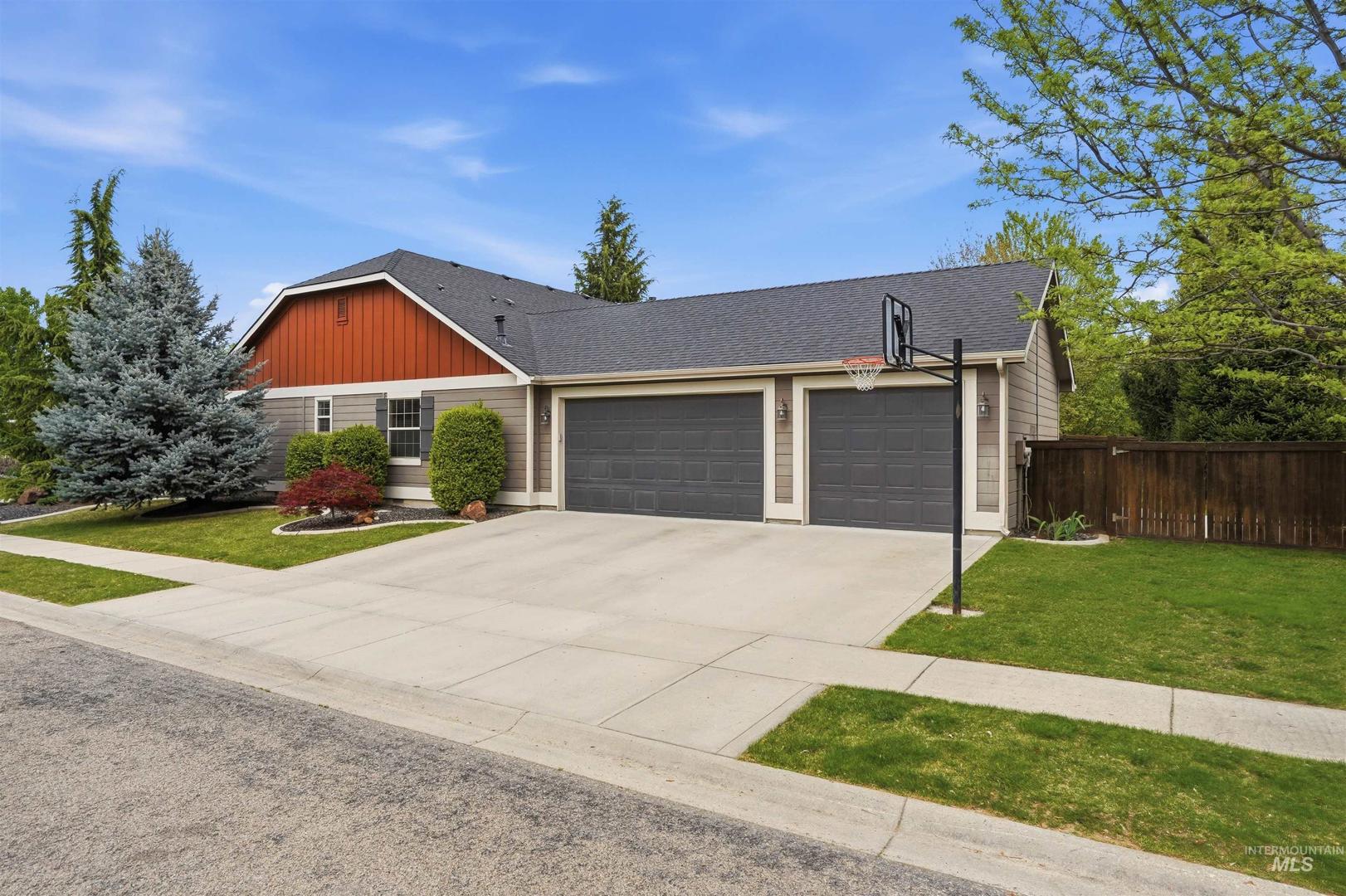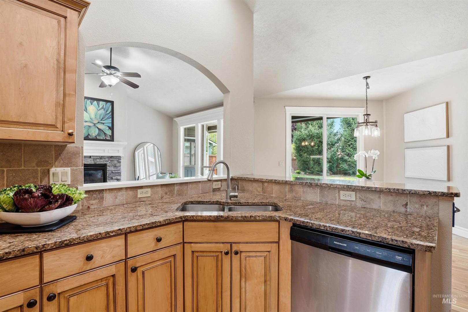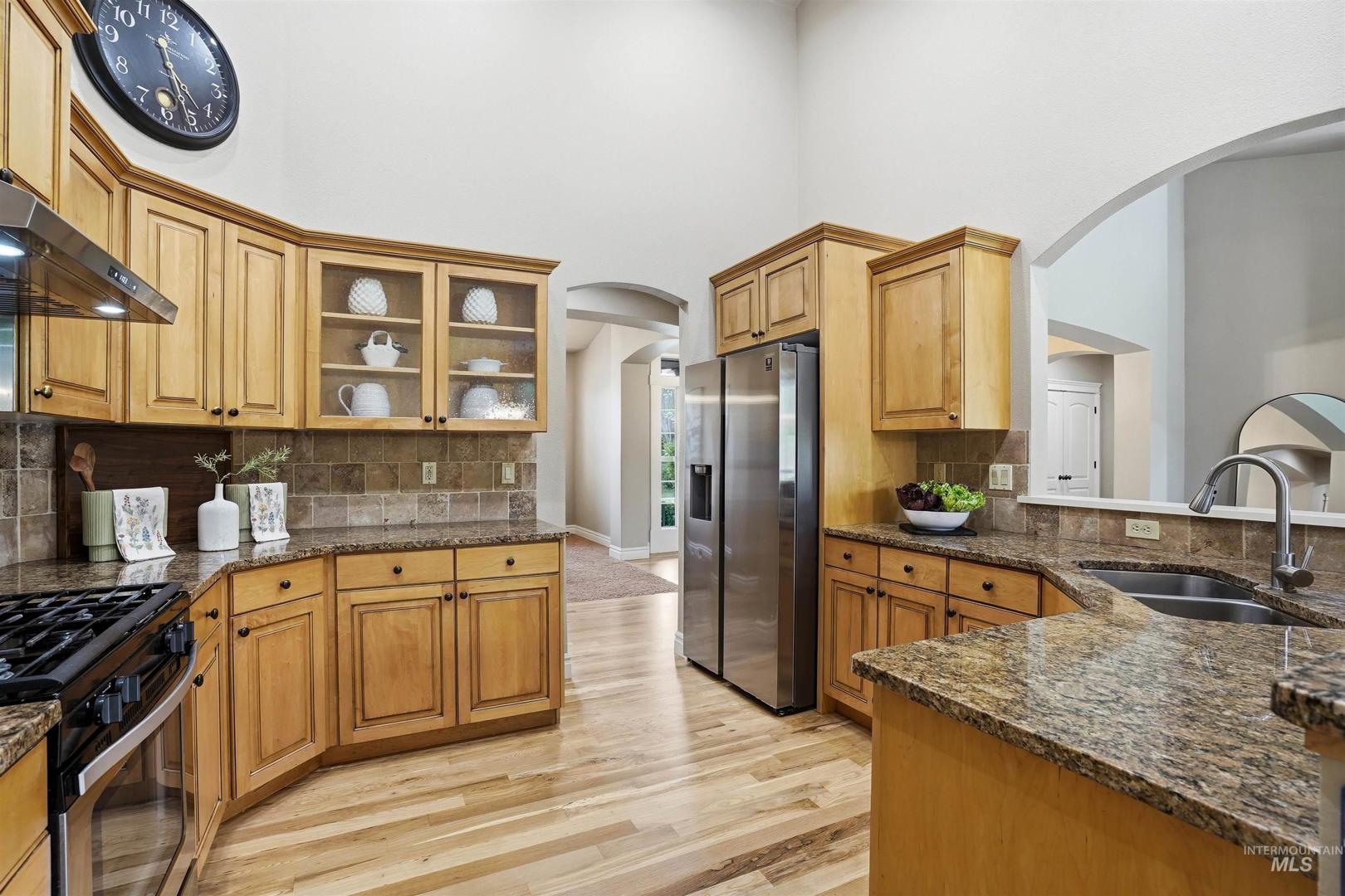 *OPEN HOUSE*Sat 4/25 12–3 & Sun 4/26 1–4. Former Model Home in Paramount. Welcome to this beautifully upgraded, single-level in the highly sought-after Paramount community. Built by Brighton, this residence showcases elevated finishes and a thoughtfully designed split-bedroom floor plan that balances comfort, privacy, and functionality. Step inside to discover rich solid hardwood flooring, soaring vaulted ceilings, and a stunning fireplace that anchors the expansive great room. Designer touches throughout include wood-encased windows and doors, custom cabinetry, and a central vacuum system. The chef’s kitchen is both stylish and functional, featuring abundant granite countertop space, a breakfast bar, stainless steel appliances, dual pantries, a spacious dining area, and a built-in desk—ideal for everyday living or entertaining. The open-concept layout flows seamlessly into the great room, formal dining space, and a private office/den. The primary suite offers a true retreat with a generous walk-in closet, dual vanities, and a relaxing soaker tub. Enjoy seamless indoor-outdoor living with a large covered patio and a desirable south-facing backyard—perfect for year-round entertaining.The fully insulated, climate-controlled garage, along with an extended concrete side pad, great for vehicles, storage, or recreational toys.Enjoy resort-style pools, parks, ponds, gym, and walking paths.