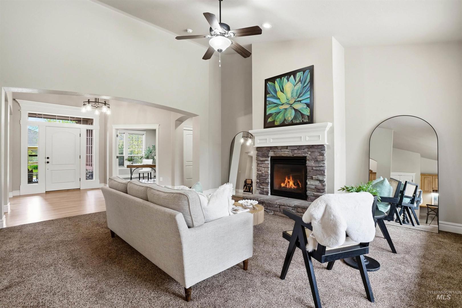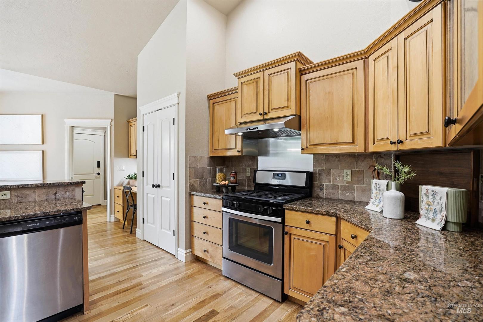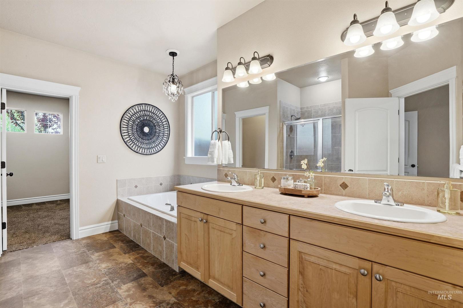 *OPEN HOUSE*Sat 4/25 12–3 & Sun 4/26 1–4. Former Model Home in Paramount. Welcome to this beautifully upgraded, single-level in the highly sought-after Paramount community. Built by Brighton, this residence showcases elevated finishes and a thoughtfully designed split-bedroom floor plan that balances comfort, privacy, and functionality. Step inside to discover rich solid hardwood flooring, soaring vaulted ceilings, and a stunning fireplace that anchors the expansive great room. Designer touches throughout include wood-encased windows and doors, custom cabinetry, and a central vacuum system. The chef’s kitchen is both stylish and functional, featuring abundant granite countertop space, a breakfast bar, stainless steel appliances, dual pantries, a spacious dining area, and a built-in desk—ideal for everyday living or entertaining. The open-concept layout flows seamlessly into the great room, formal dining space, and a private office/den. The primary suite offers a true retreat with a generous walk-in closet, dual vanities, and a relaxing soaker tub. Enjoy seamless indoor-outdoor living with a large covered patio and a desirable south-facing backyard—perfect for year-round entertaining.The fully insulated, climate-controlled garage, along with an extended concrete side pad, great for vehicles, storage, or recreational toys.Enjoy resort-style pools, parks, ponds, gym, and walking paths.