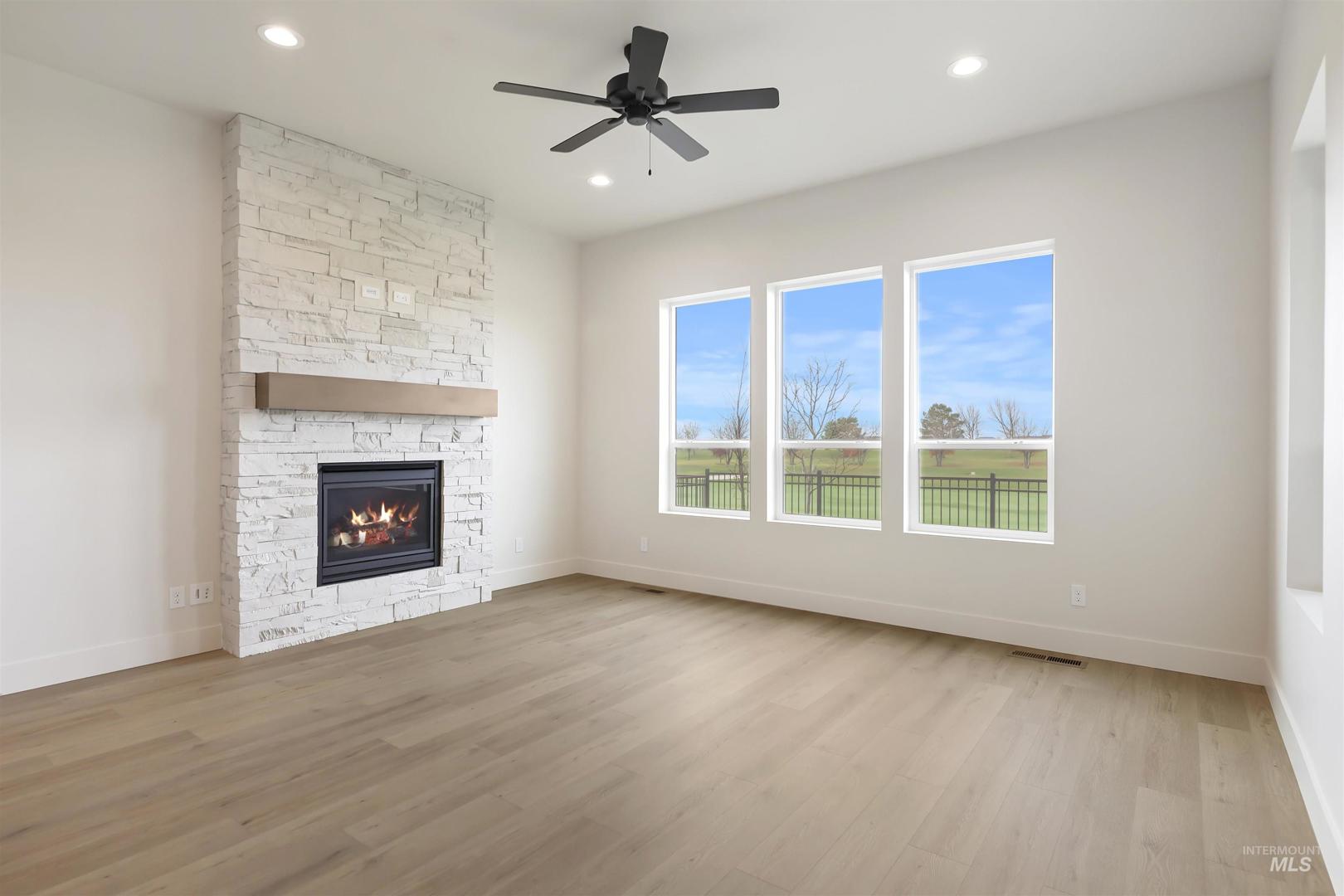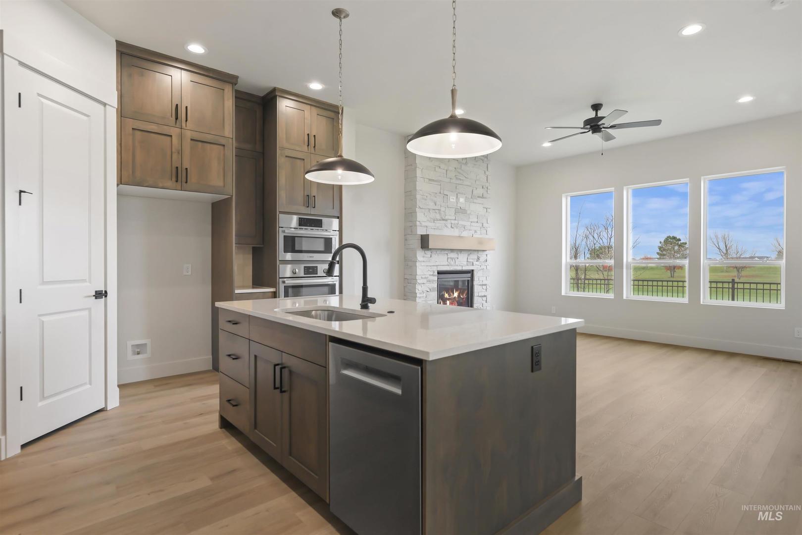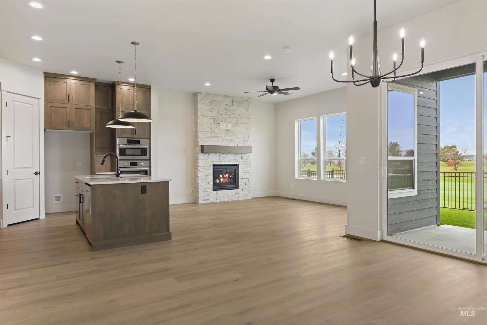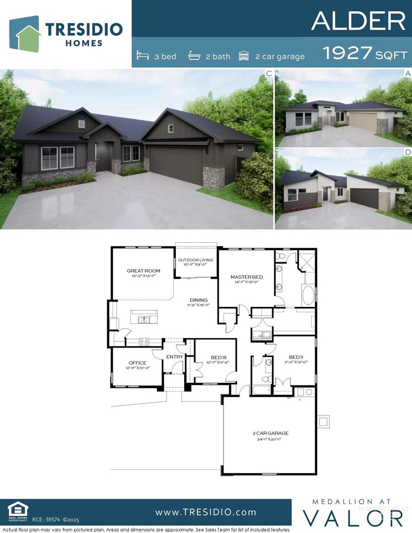Welcome to The Alder at Valor, where modern design meets the ultimate golfer’s paradise. This elegant single-level home overlooks the pristine fairways of the Falcon Crest Golf Course, offering stunning views. With 3 spacious bedrooms, a dedicated office, and 2 designer bathrooms, every detail has been crafted for comfort and sophistication. Enjoy an open-concept layout highlighted by hardwood flooring, soaring ceilings, and a dramatic floor-to-ceiling stone fireplace, perfect for relaxing after a round or hosting friends for dinner. The kitchen impresses with gorgeous stained cabinetry to the ceiling, quartz countertops, and premium Bosch appliances, blending beauty and function seamlessly. The spa-inspired primary suite features a standalone soaking tub, dual vanities, and a fully tiled walk-in shower. Outside, unwind in your private, low-maintenance backyard with turf and sweeping golf course views—ideal for morning coffee or watching the sunset over the greens. Located in Valor’s prestigious gated Medallion Greens community, residents enjoy resort-style amenities including pools, fitness centers, indoor golf simulators, pickleball, tennis, a clubhouse restaurant, and an 18-hole putting course. The Alder at Valor—where every day feels like a day on the course.