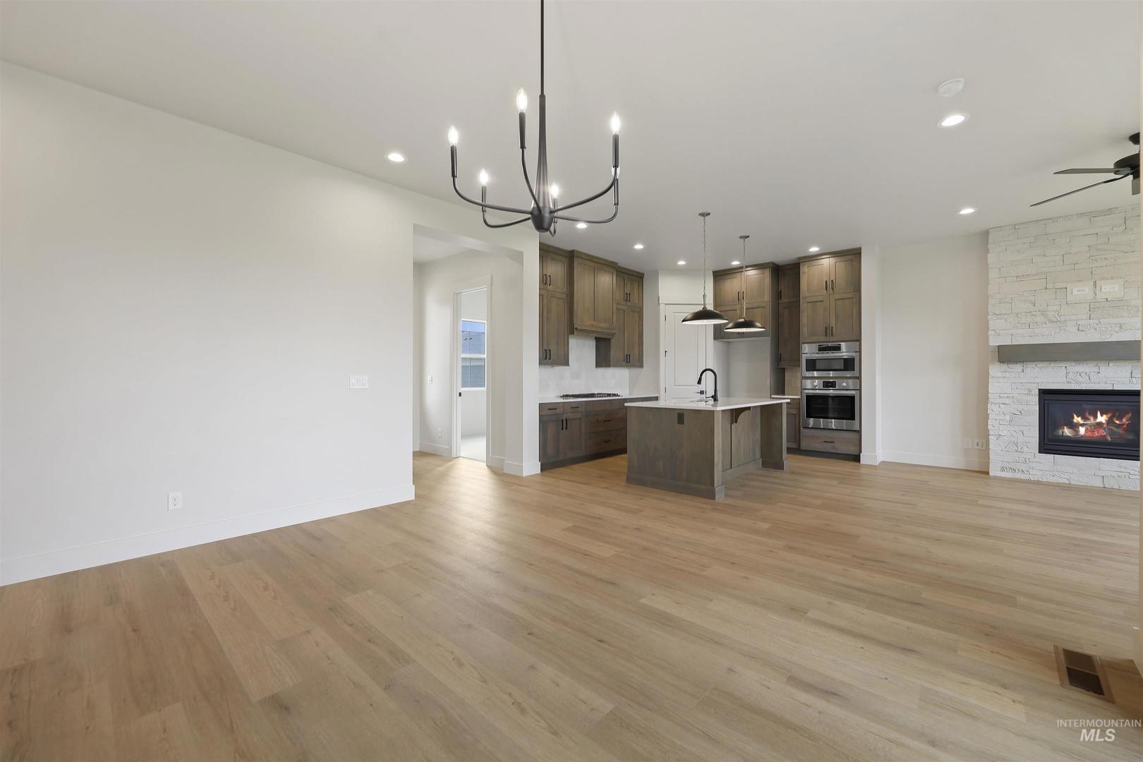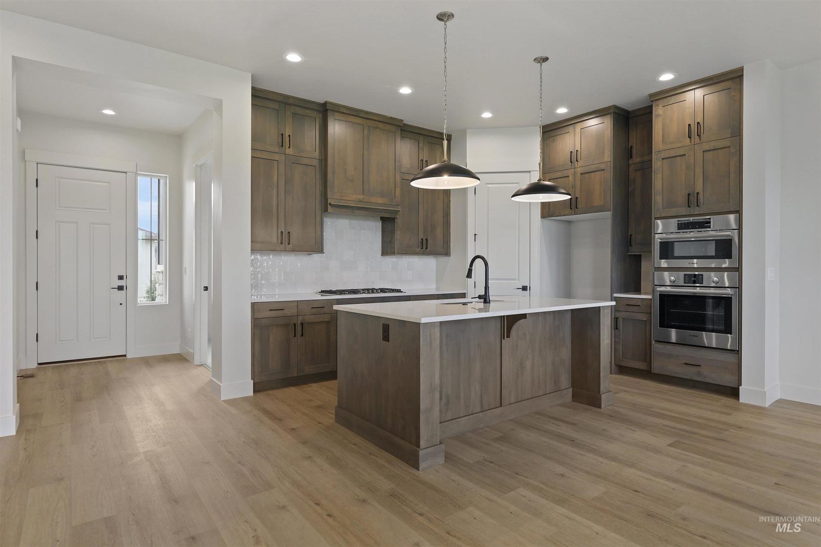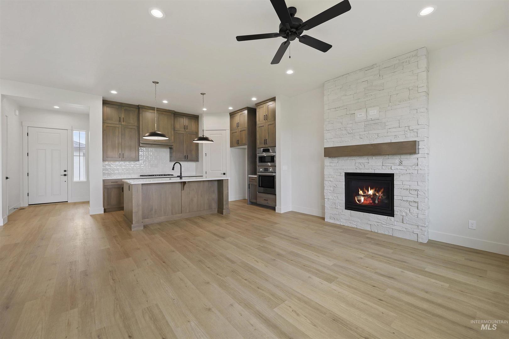 Welcome to The Alder at Valor, where modern design meets the ultimate golfer’s paradise. This elegant single-level home overlooks the pristine fairways of the Falcon Crest Golf Course, offering stunning views. With 3 spacious bedrooms, a dedicated office, and 2 designer bathrooms, every detail has been crafted for comfort and sophistication. Enjoy an open-concept layout highlighted by hardwood flooring, soaring ceilings, and a dramatic floor-to-ceiling stone fireplace, perfect for relaxing after a round or hosting friends for dinner. The kitchen impresses with gorgeous stained cabinetry to the ceiling, quartz countertops, and premium Bosch appliances, blending beauty and function seamlessly. The spa-inspired primary suite features a standalone soaking tub, dual vanities, and a fully tiled walk-in shower. Outside, unwind in your private, low-maintenance backyard with turf and sweeping golf course views—ideal for morning coffee or watching the sunset over the greens. Located in Valor’s prestigious gated Medallion Greens community, residents enjoy resort-style amenities including pools, fitness centers, indoor golf simulators, pickleball, tennis, a clubhouse restaurant, and an 18-hole putting course. The Alder at Valor—where every day feels like a day on the course.