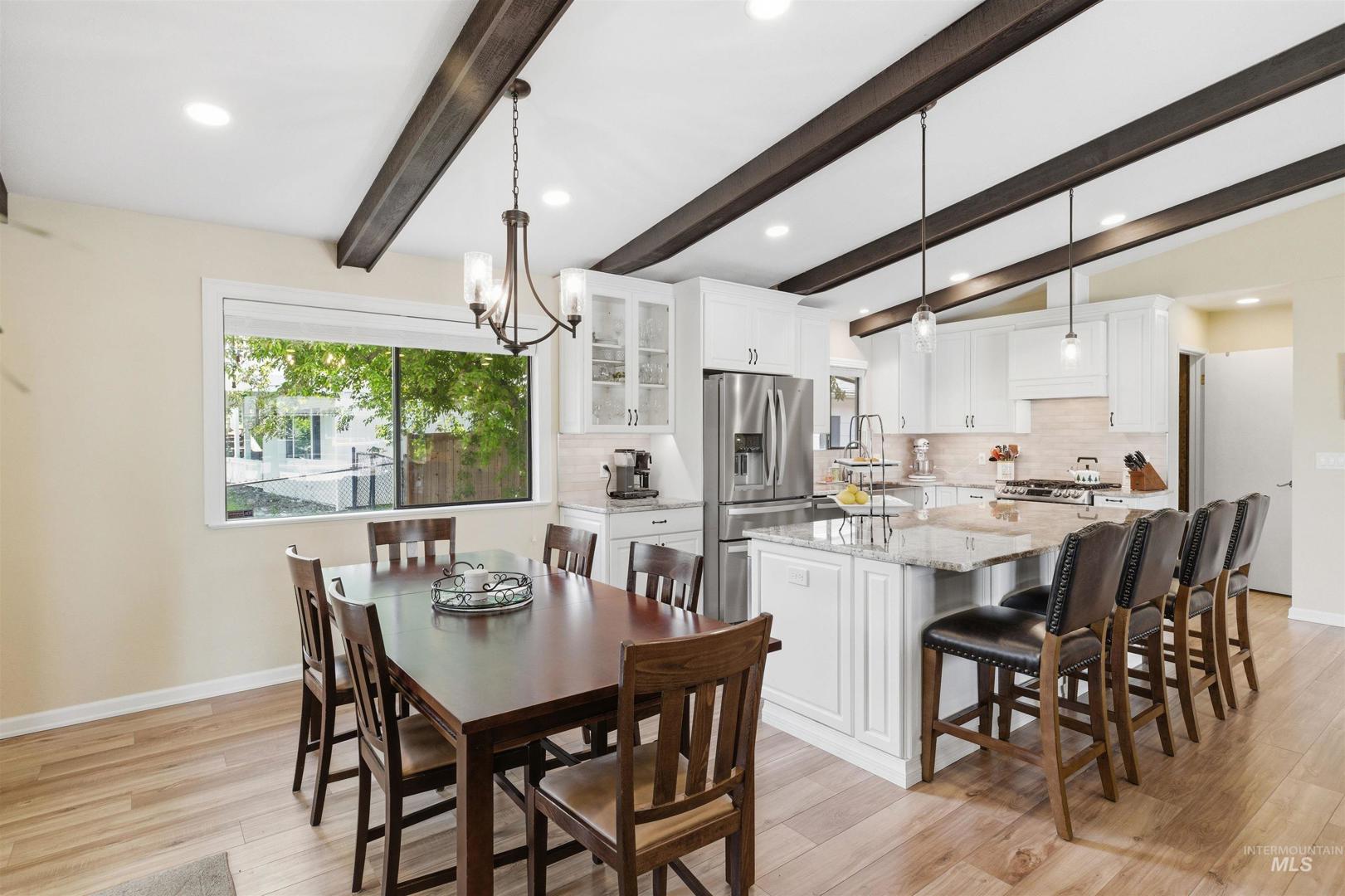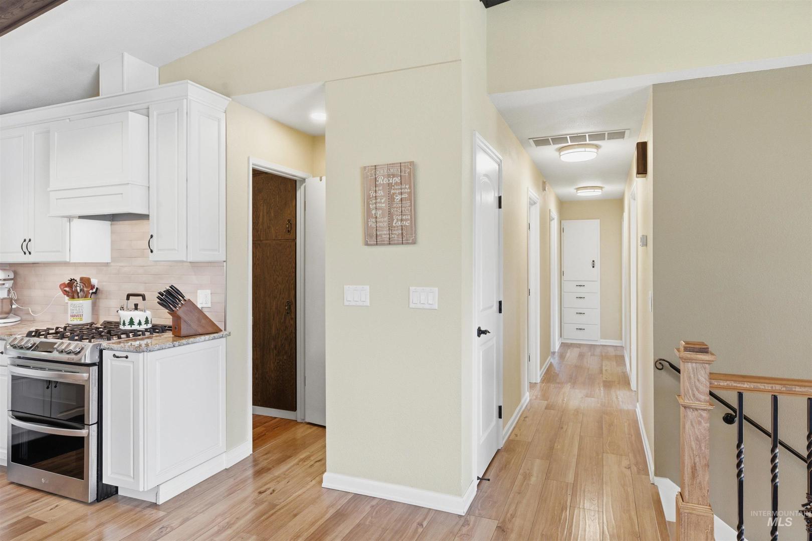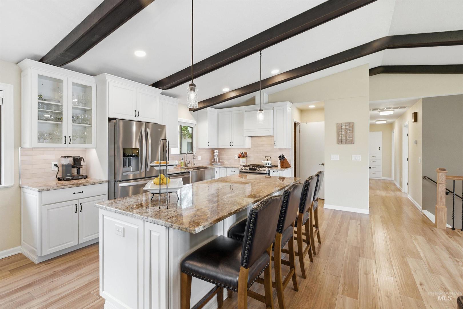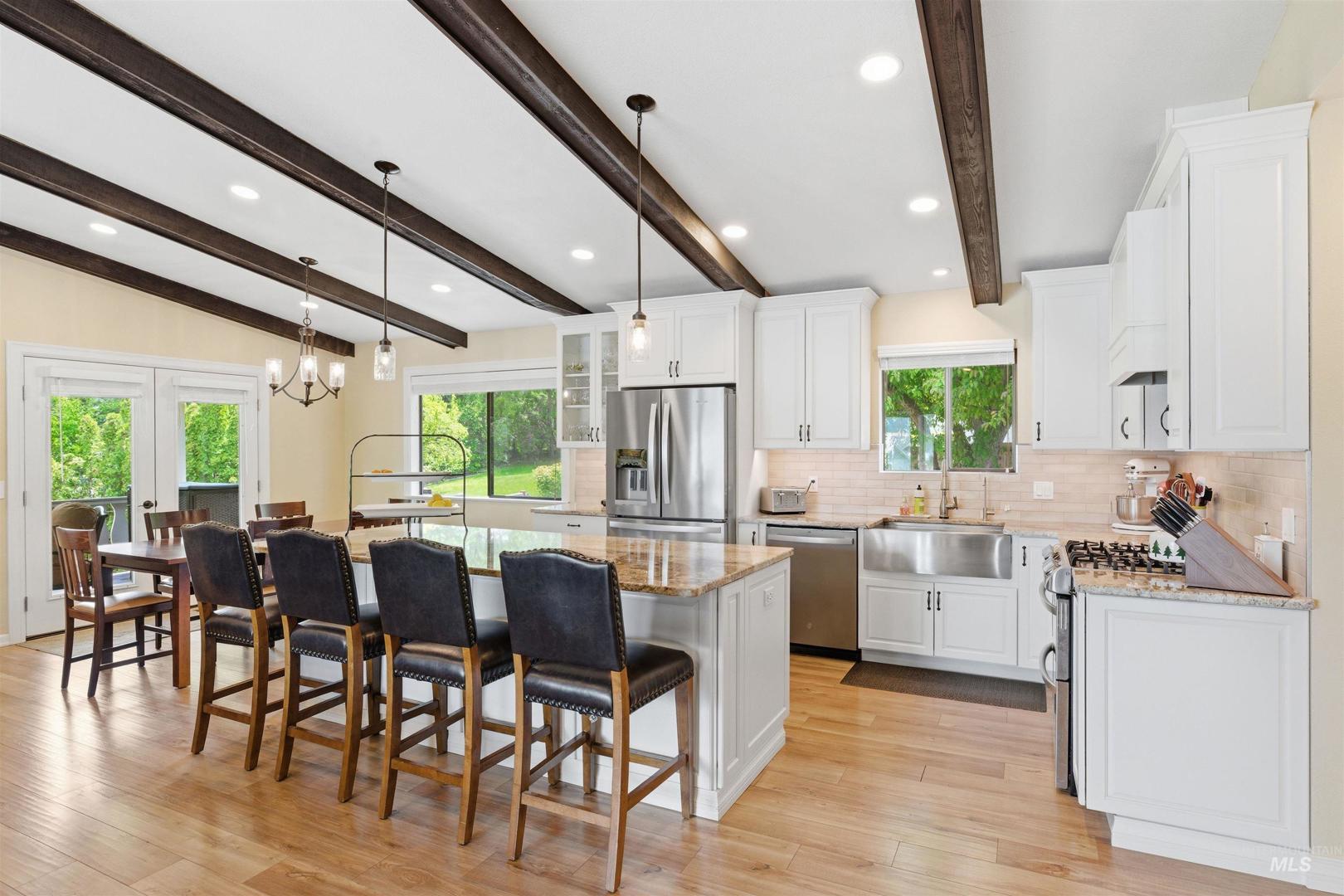 Beautifully updated 4-bed, 3-bath split-level home on a .286-acre corner lot in one of Moscow’s most desirable neighborhoods. Built in 1975 and fully renovated, this 2,649 sq ft home offers modern comfort, an open-concept layout, and stunning Moscow Mountain views from the vaulted-ceiling living room with a cozy fireplace. The kitchen features custom cabinets, granite counters, and a tile backsplash, with dining space that opens to a covered deck—perfect for year-round BBQs. Upstairs: 3 beds, 2 baths, including a primary suite with en-suite bath. Downstairs: daylight basement with second living area, 4th bedroom, full bath, laundry, and garage access. Enjoy a landscaped yard with a new multi-zone irrigation system, garden with drip system, RV parking with power, and a 270 sq ft heated workshop with baseboard heating. Located just a short walk to schools, parks, and trails, this home offers space, comfort, and convenience in a peaceful, family-friendly setting.
